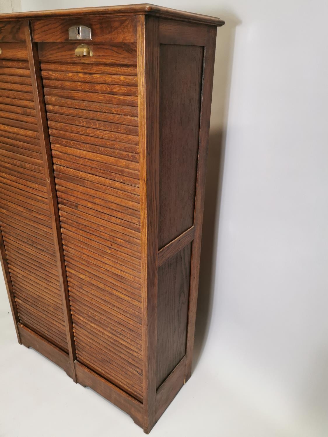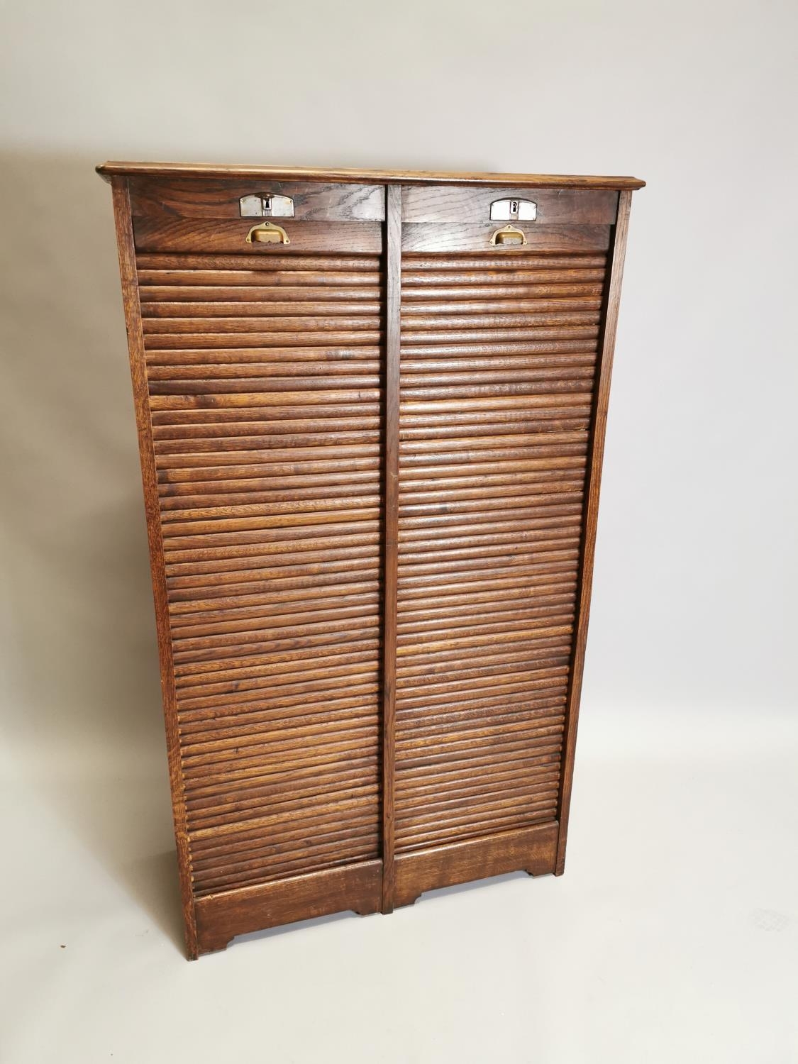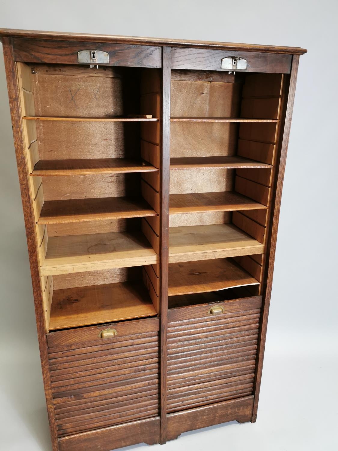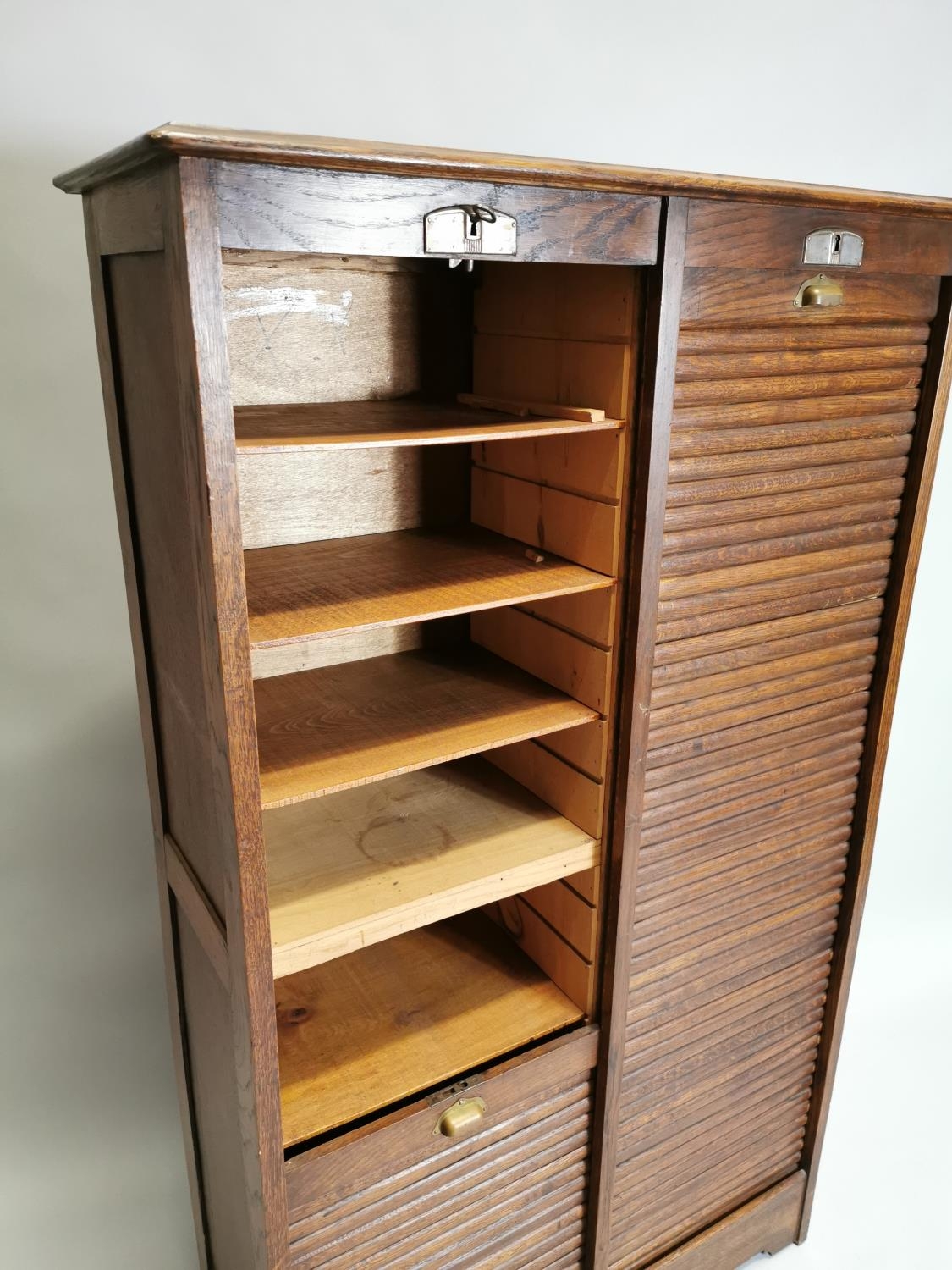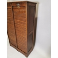 Early 20th. C. oak filing cabinet, the tambour doors enclosed shelves. { 146cm H X 87cm W X 36cm D }.