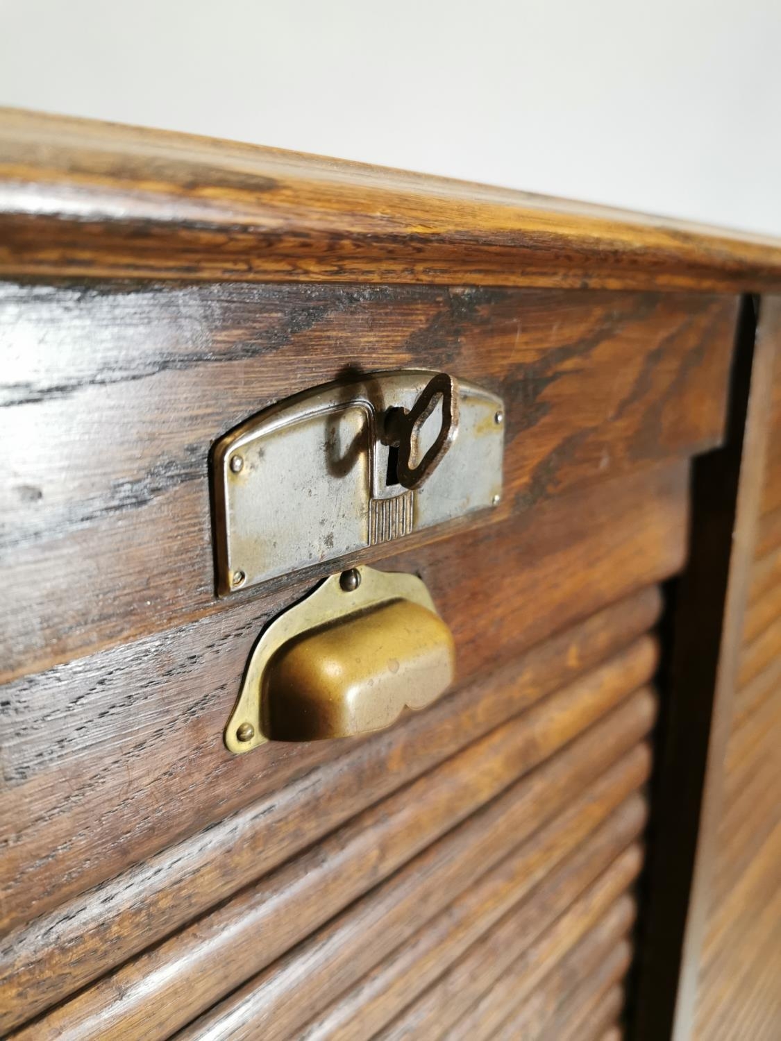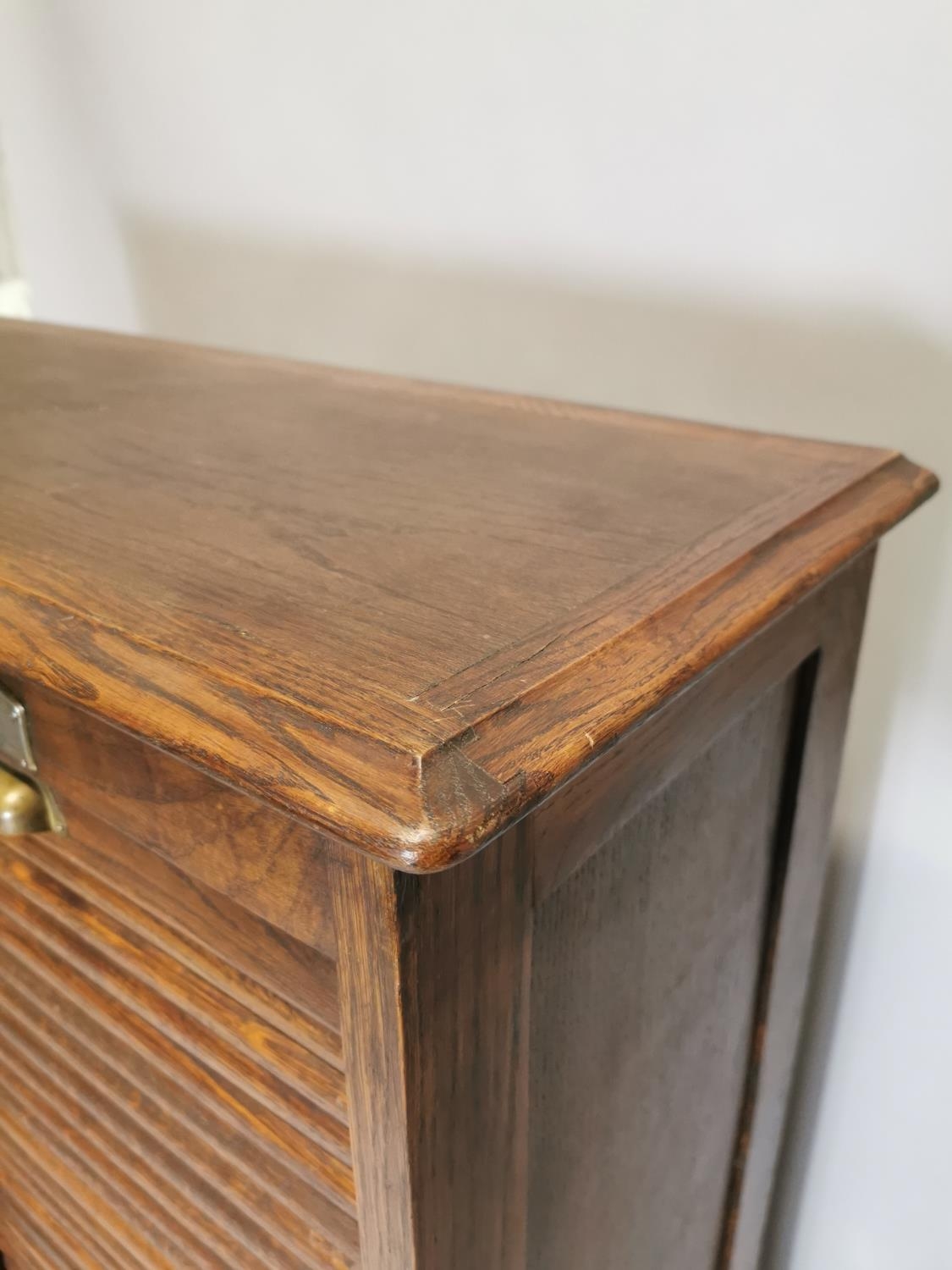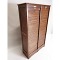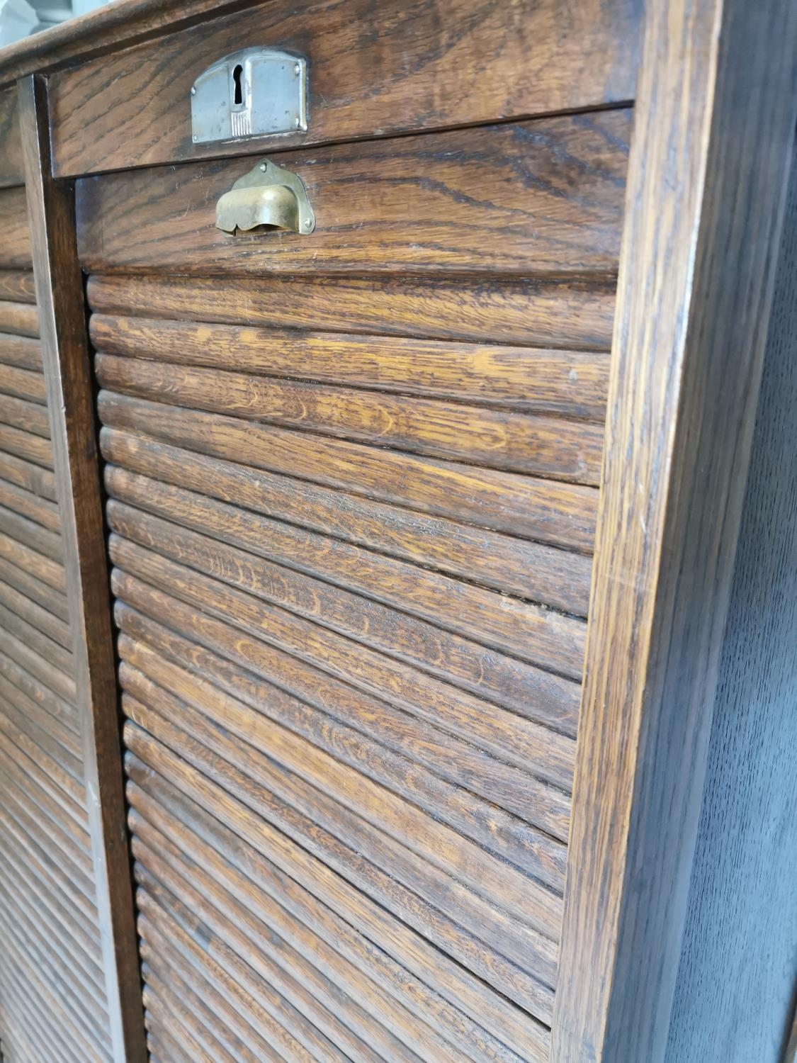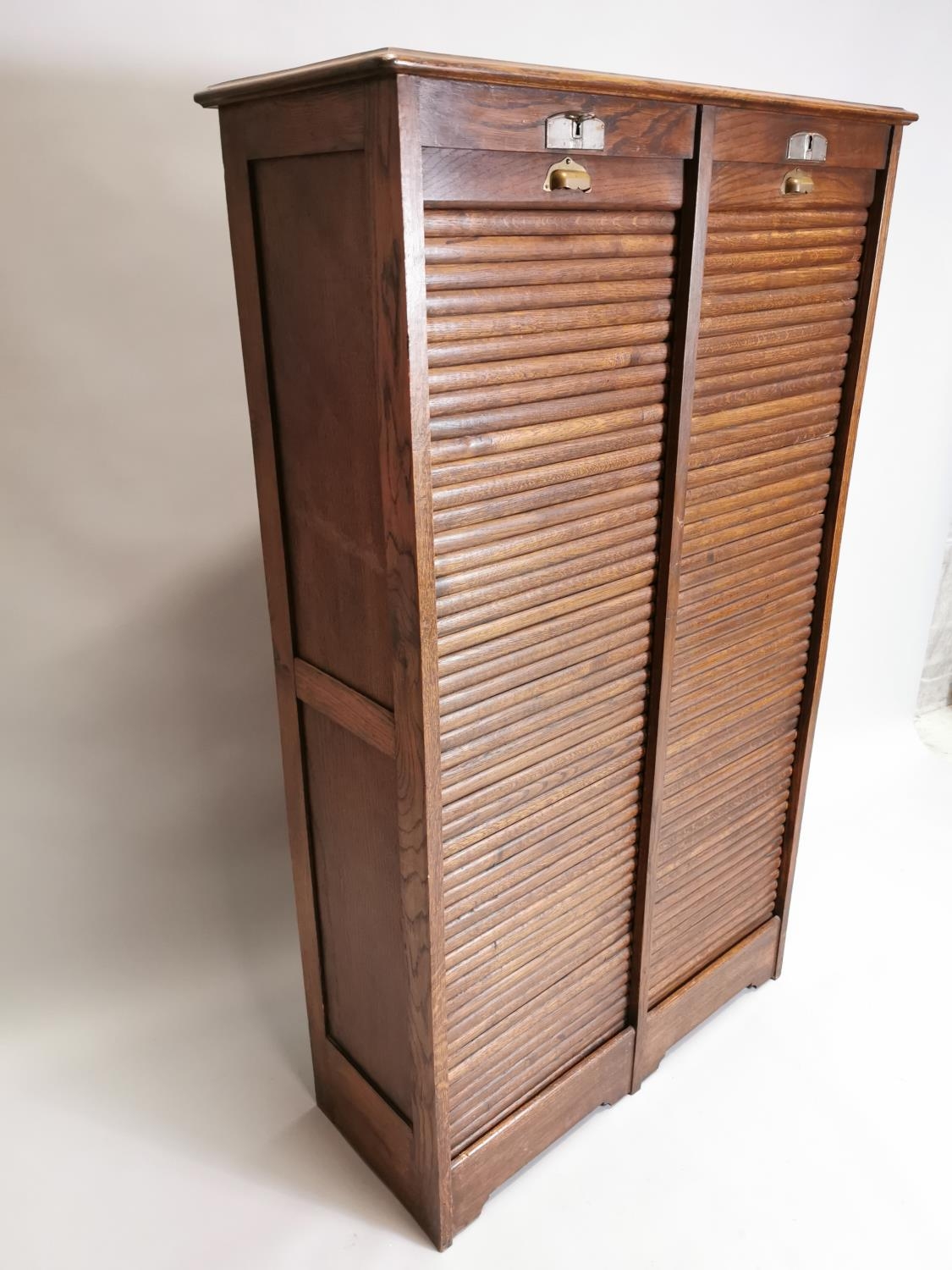 Early 20th. C. oak filing cabinet, the tambour doors enclosed shelves. { 146cm H X 87cm W X 36cm D }.