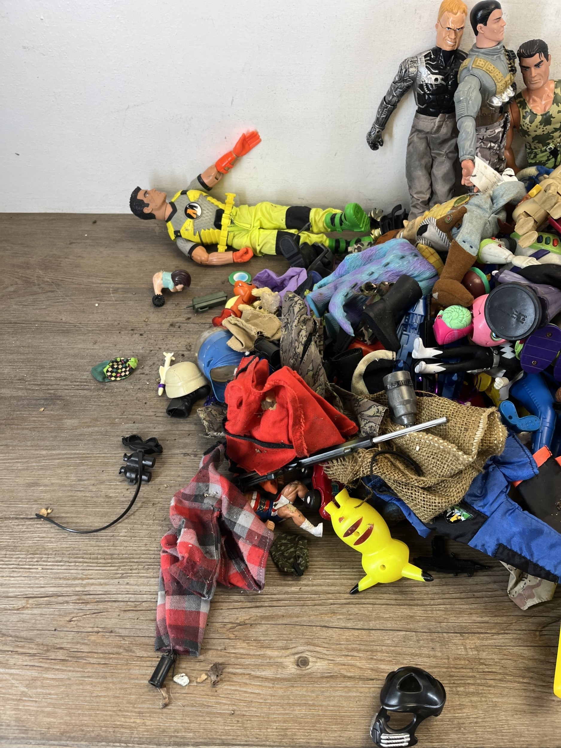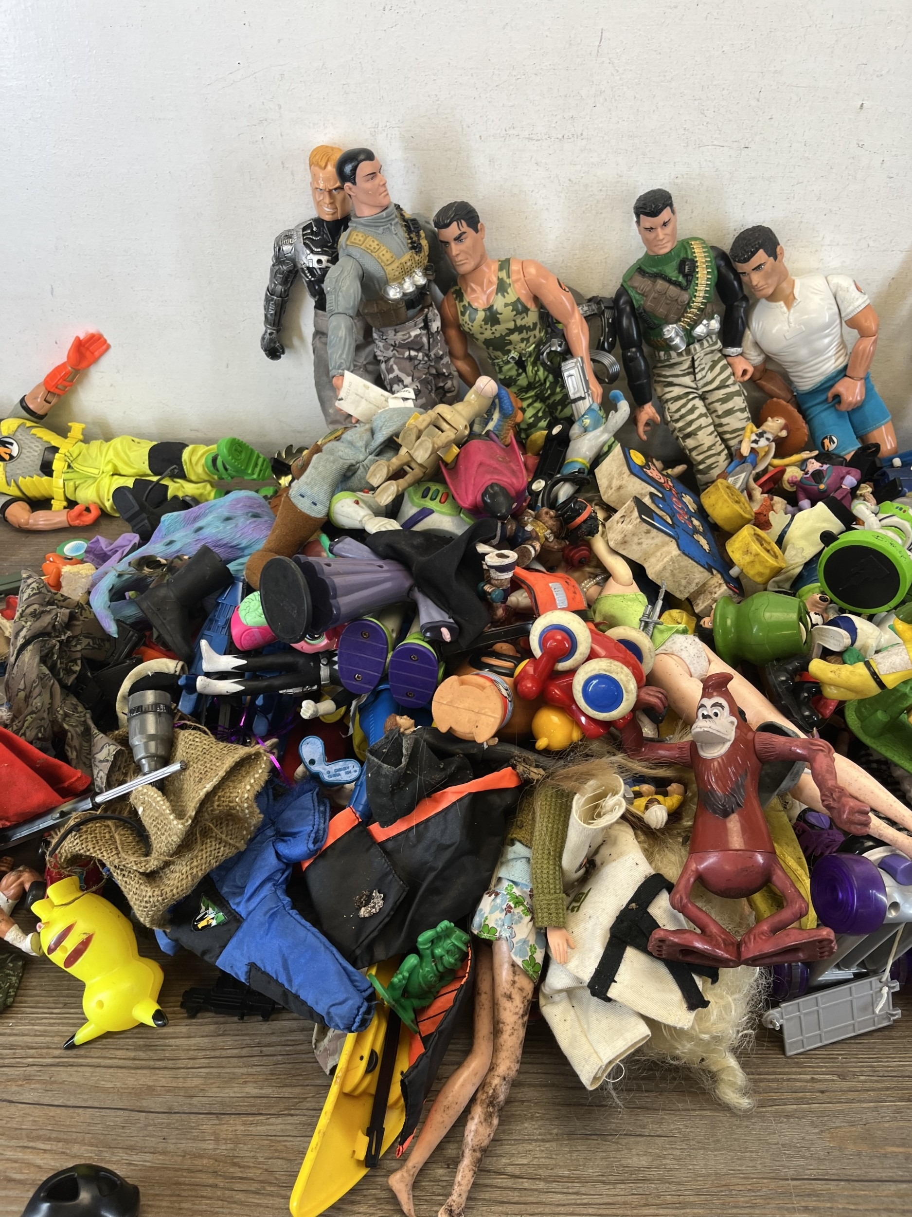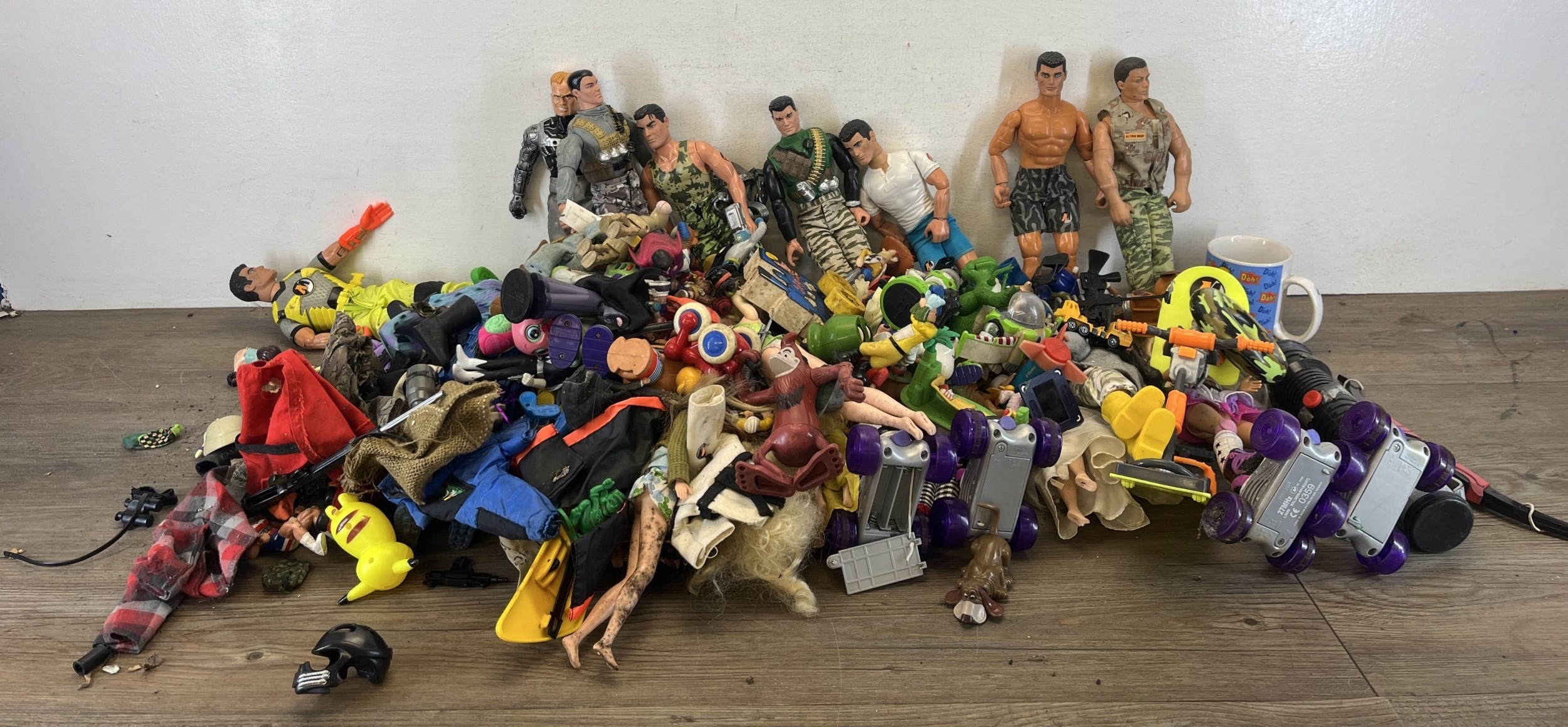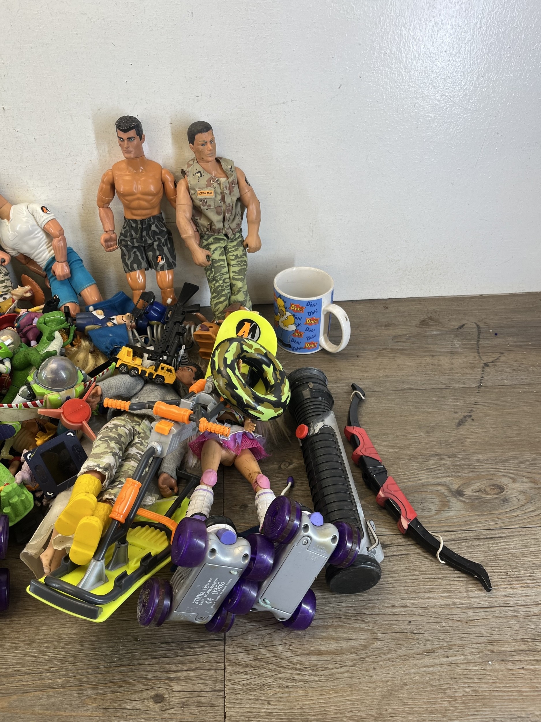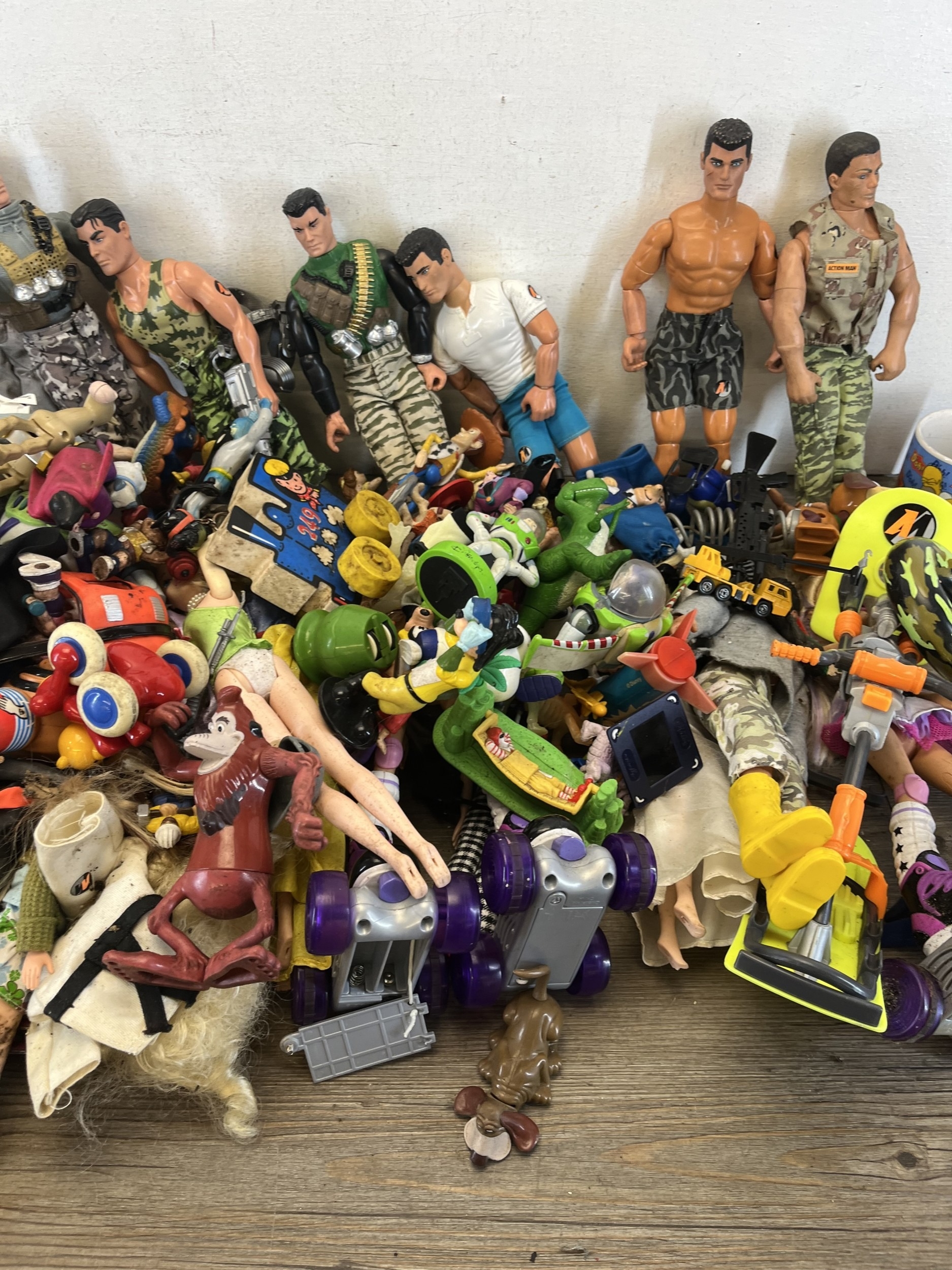 Two boxes containing action figurines to include Action Man, Walt Disney Pixar Toy Story, Bratz fashion dolls etc.