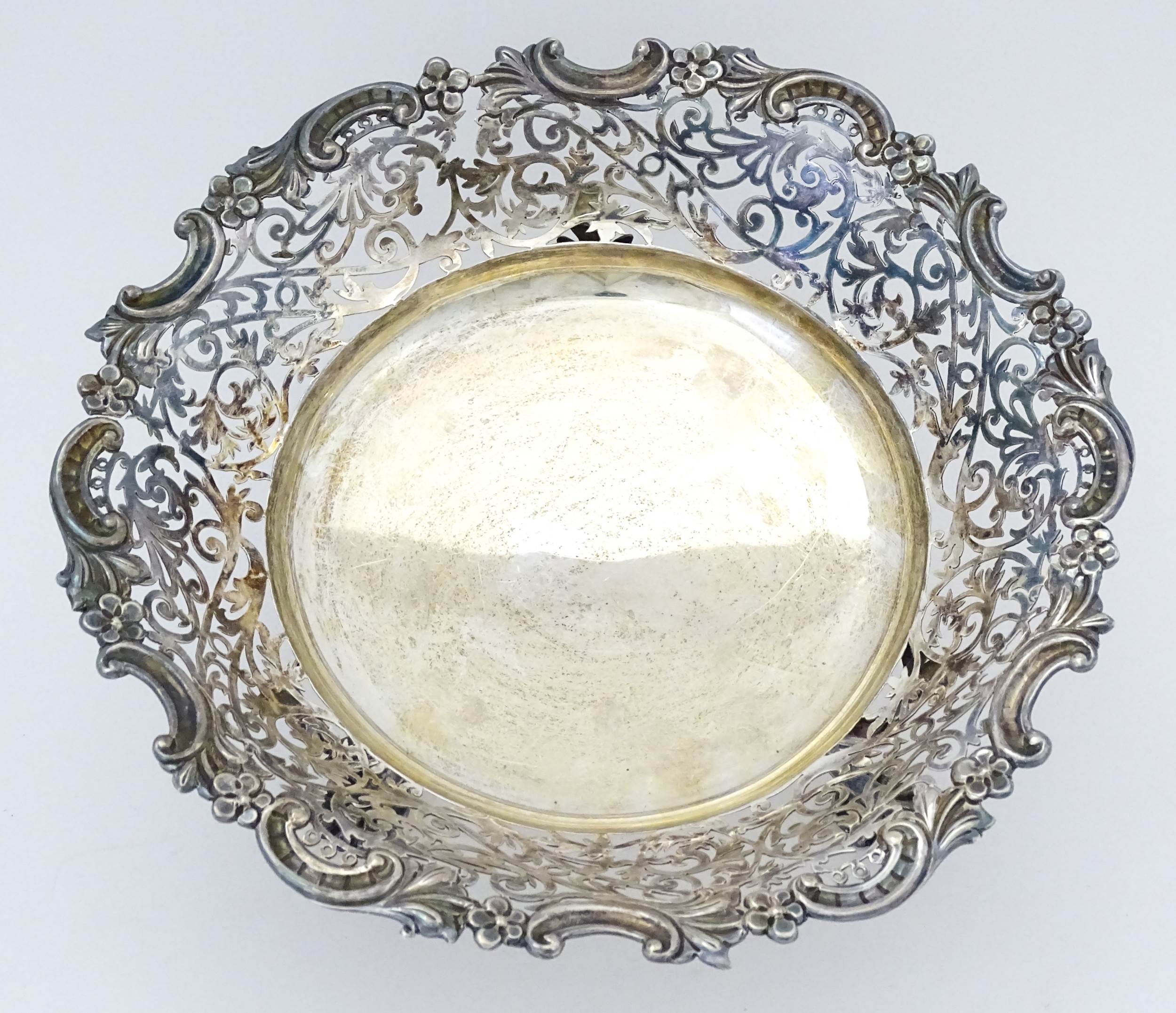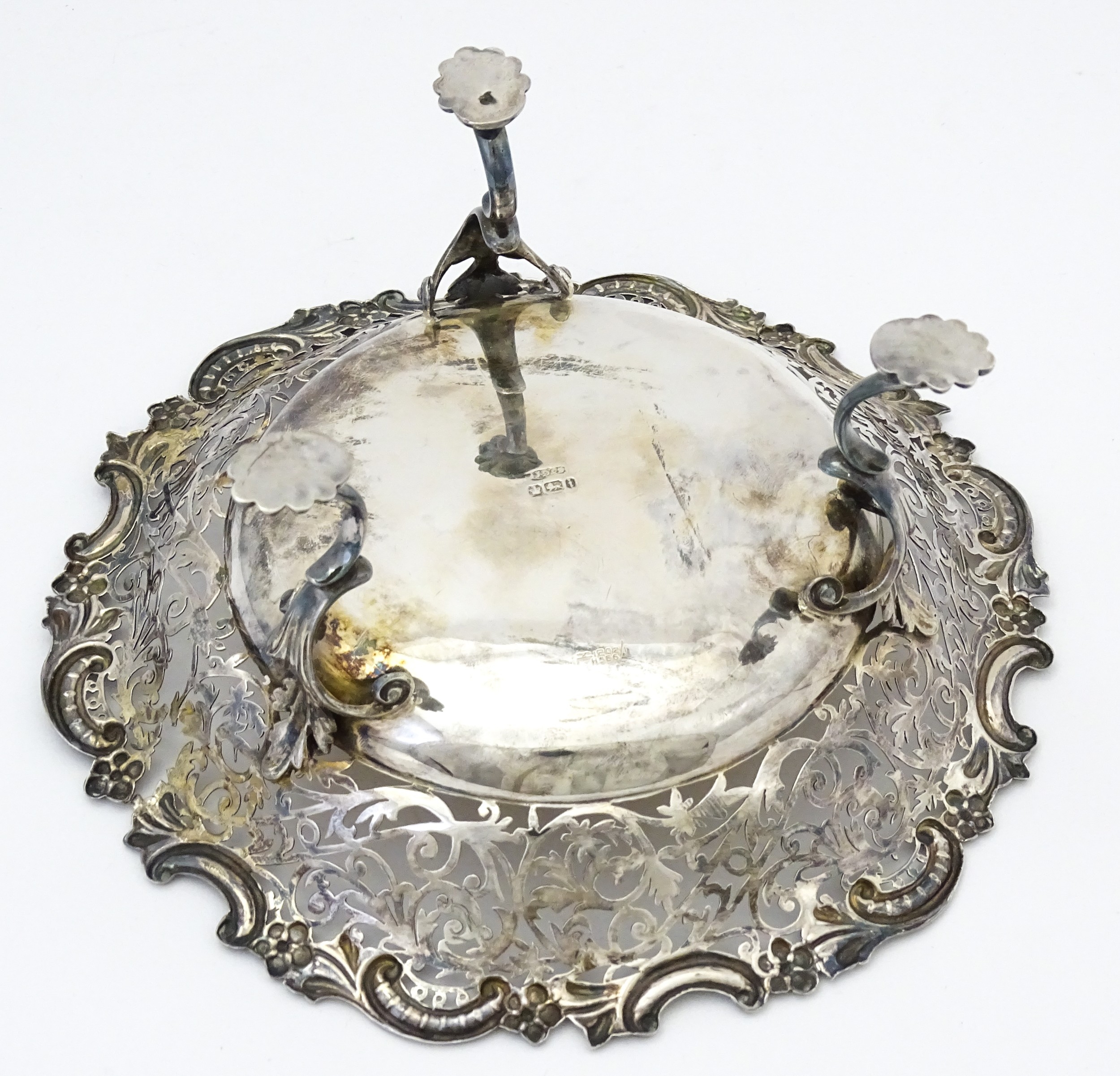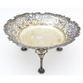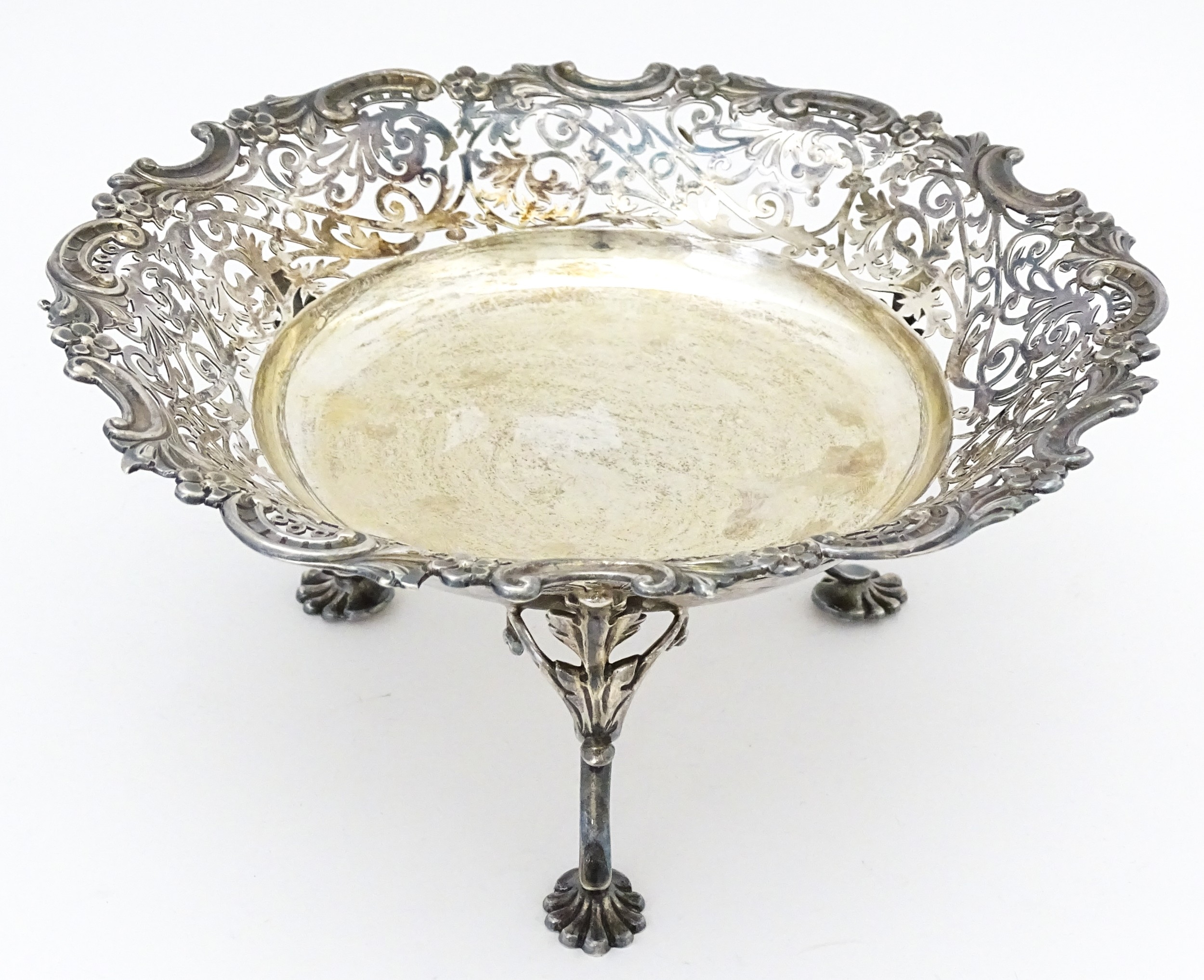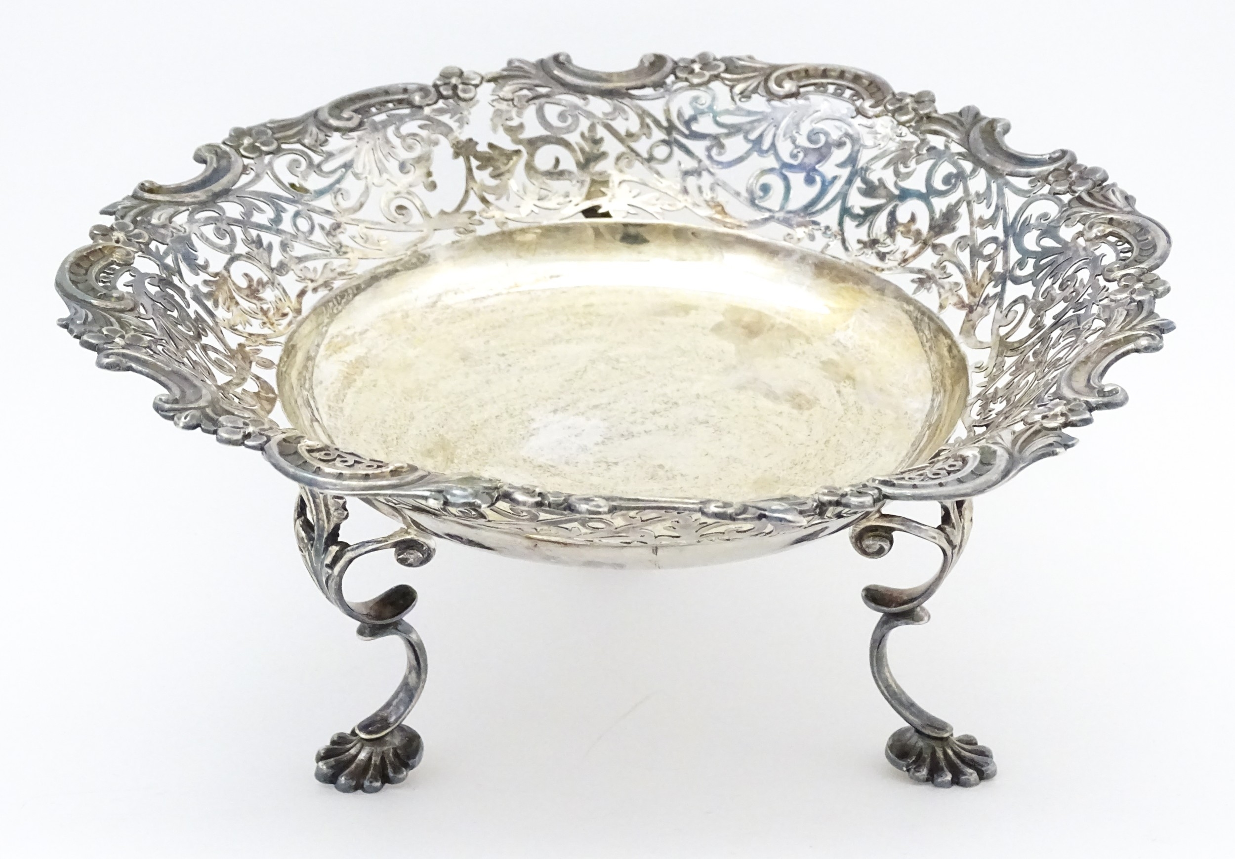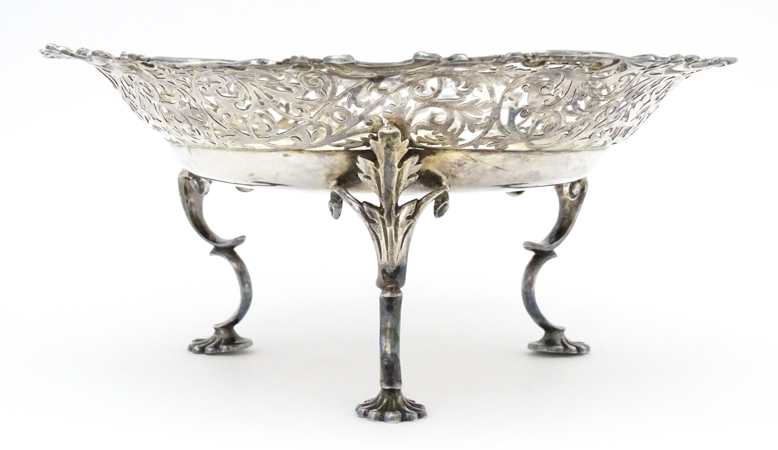 A silver dish raised on three feet with pierced scrolling decoration, hallmarked Sheffield 1901, maker James Dixon & Sons Ltd. Approx. 8 1/2" wide (TW approx. 310g)