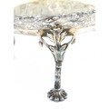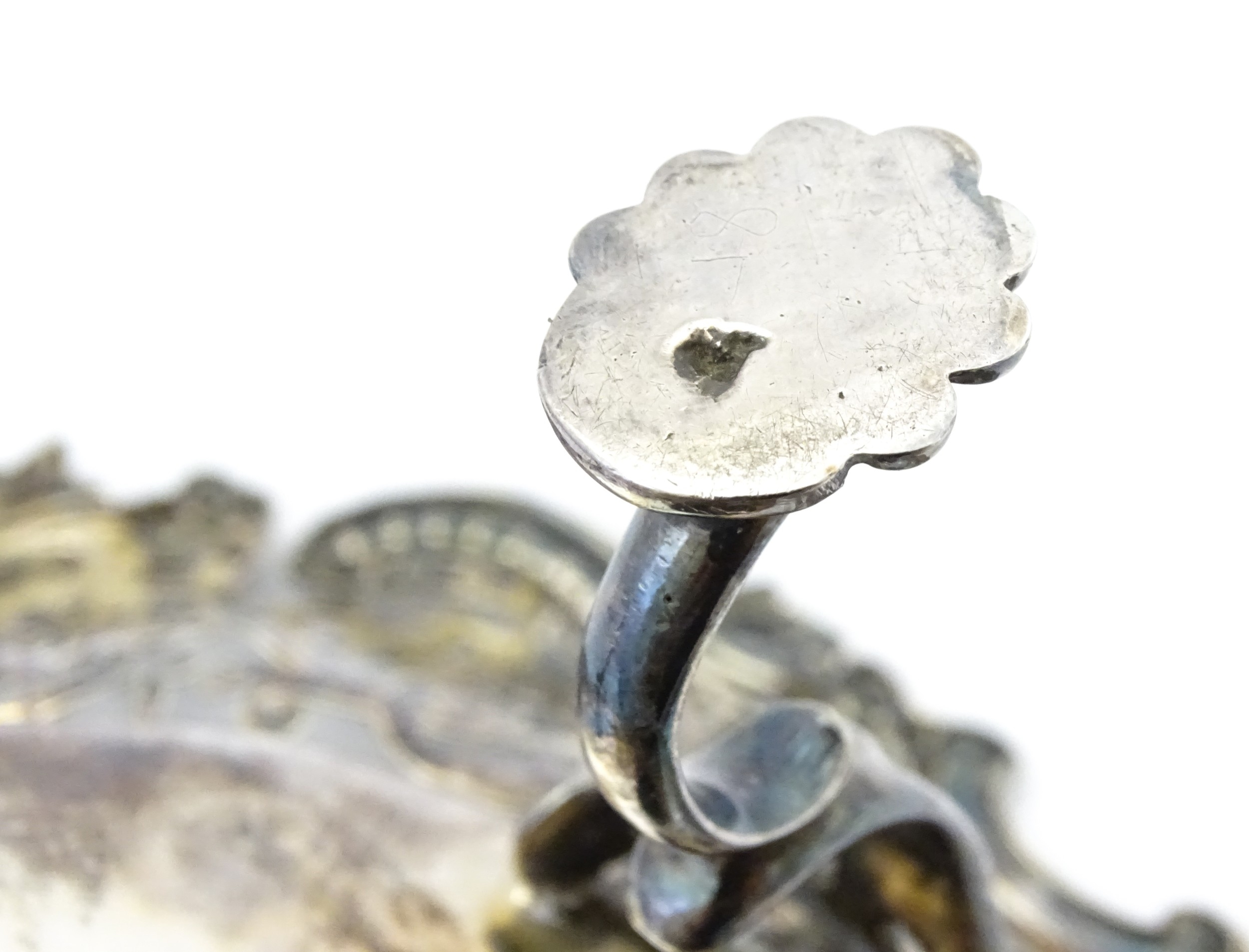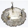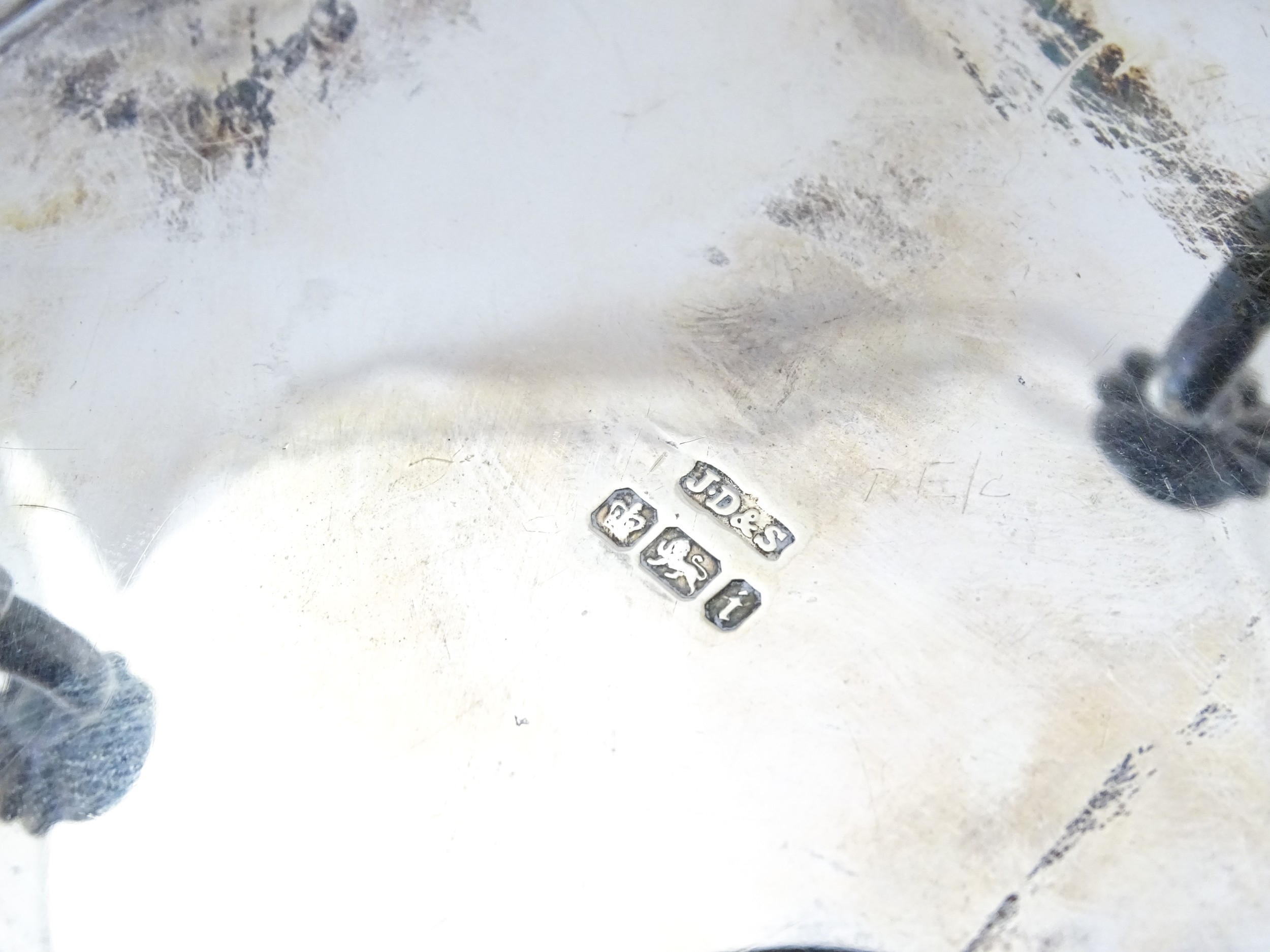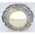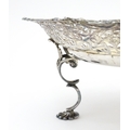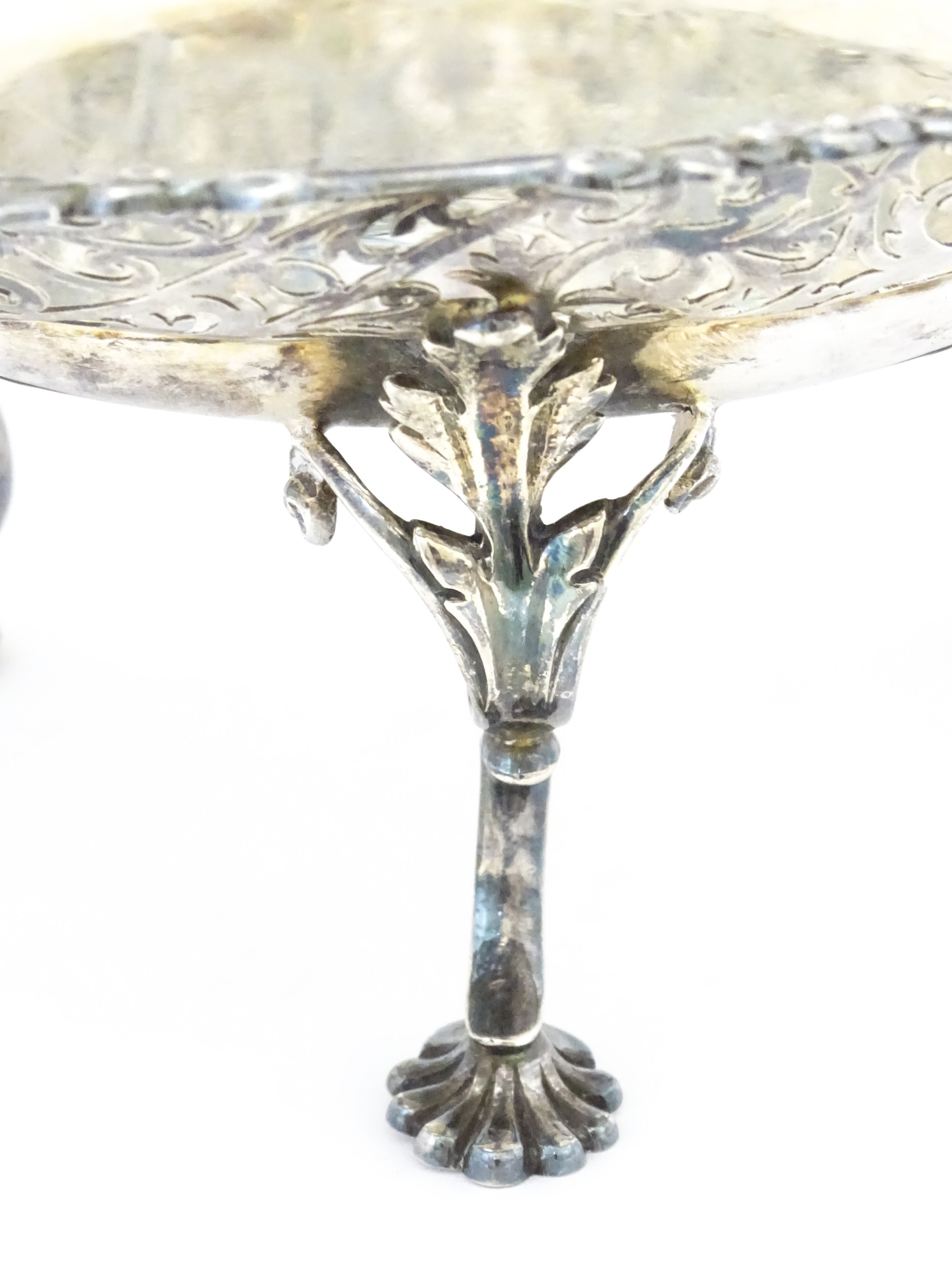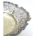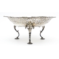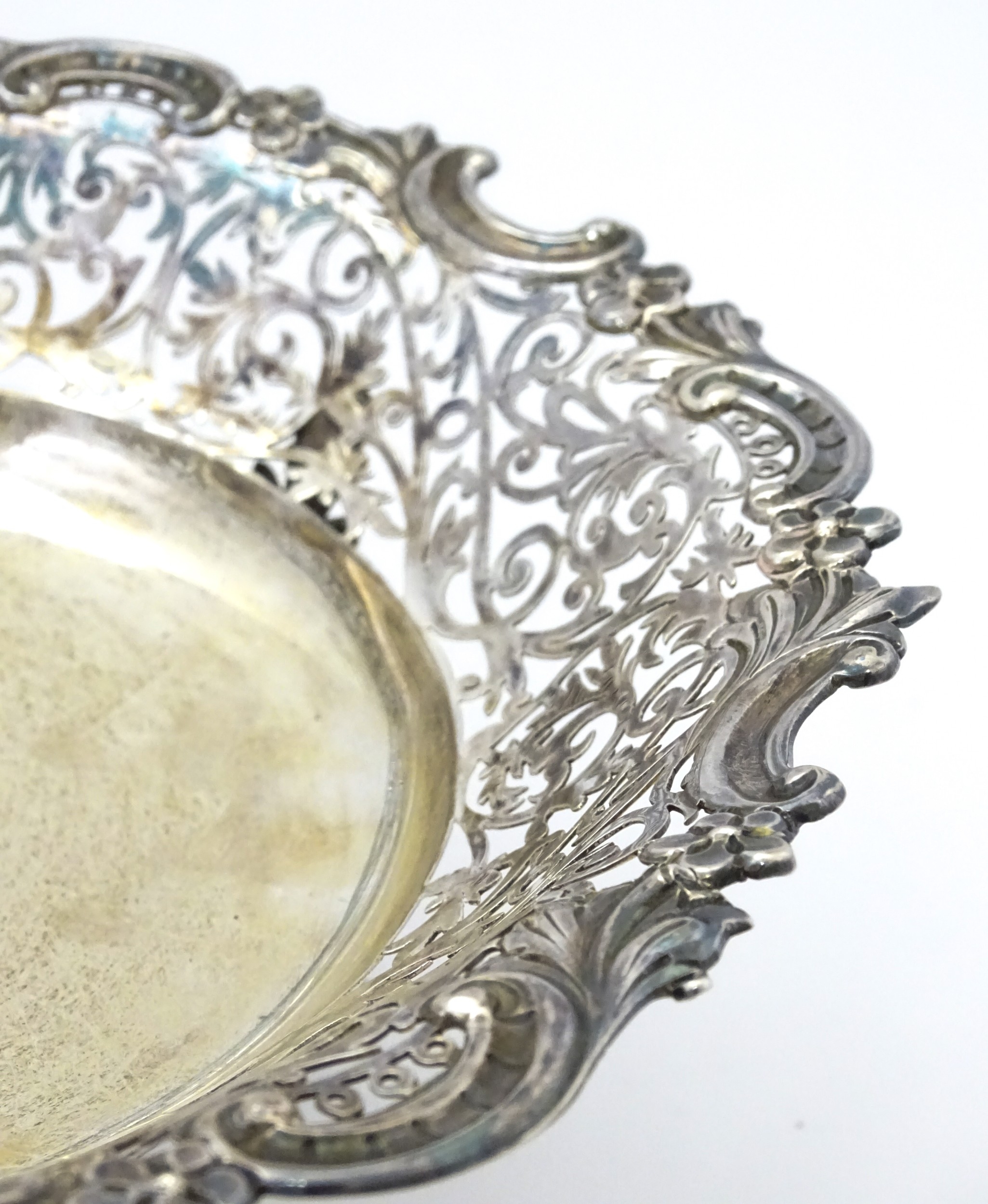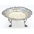 A silver dish raised on three feet with pierced scrolling decoration, hallmarked Sheffield 1901, maker James Dixon & Sons Ltd. Approx. 8 1/2" wide (TW approx. 310g)