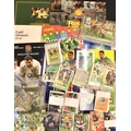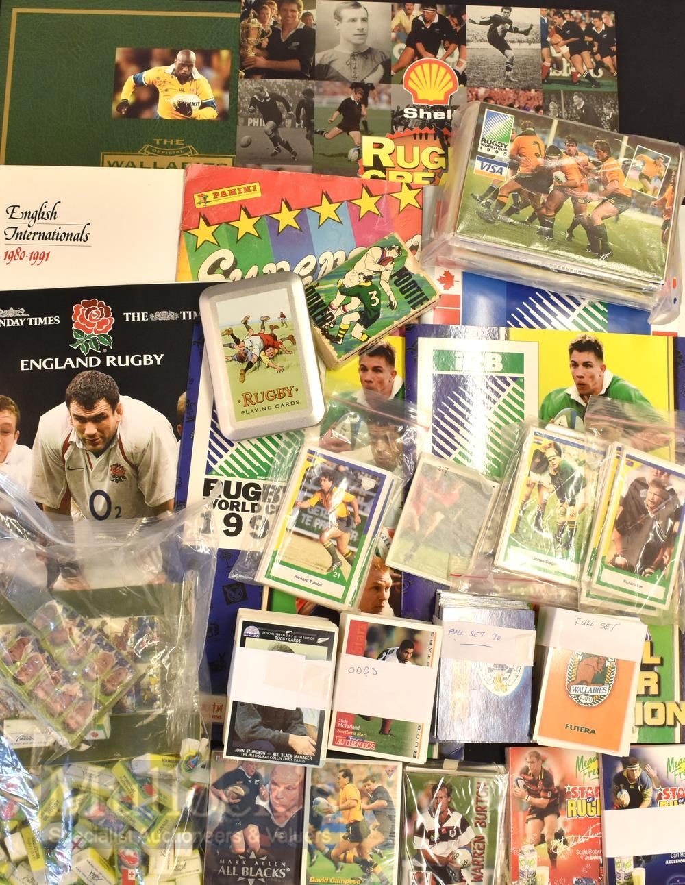 Rugby Cards of All Sorts (Qty): Card Heaven: a large and carefully managed collection of modern rugby cards, albums (some empty, e.g. RWC 1991 & 2003, Shell NZ Rugby Greats 1992), England Rugby (partially supplied) 2003, Panini Supersport (filled) 1987, English Internationals 1980-1991; phonecards (Hong Kong Set 1991), stickers, many rugby-themed greetings cards, playing cards, club sets, beer mats, even sets of those pictorially-wrapped French sugar lumps. Trade Cards themselves: thousands, inc many full, mint sets of NZ, Australian and South African Futera, Sports Deck, Card Crazy Authentics, Official All Black, Wallabies, Meadow Fresh and other issues over the last 30 years, plus lots of spares, stickers & some British moderns, inc a few R League. Postcards: hundreds of mint moderns, esp World Cup and Five/Six Nations, action pic and cartoon/caricature types. A lucky lot for the best bidder! Excellent