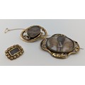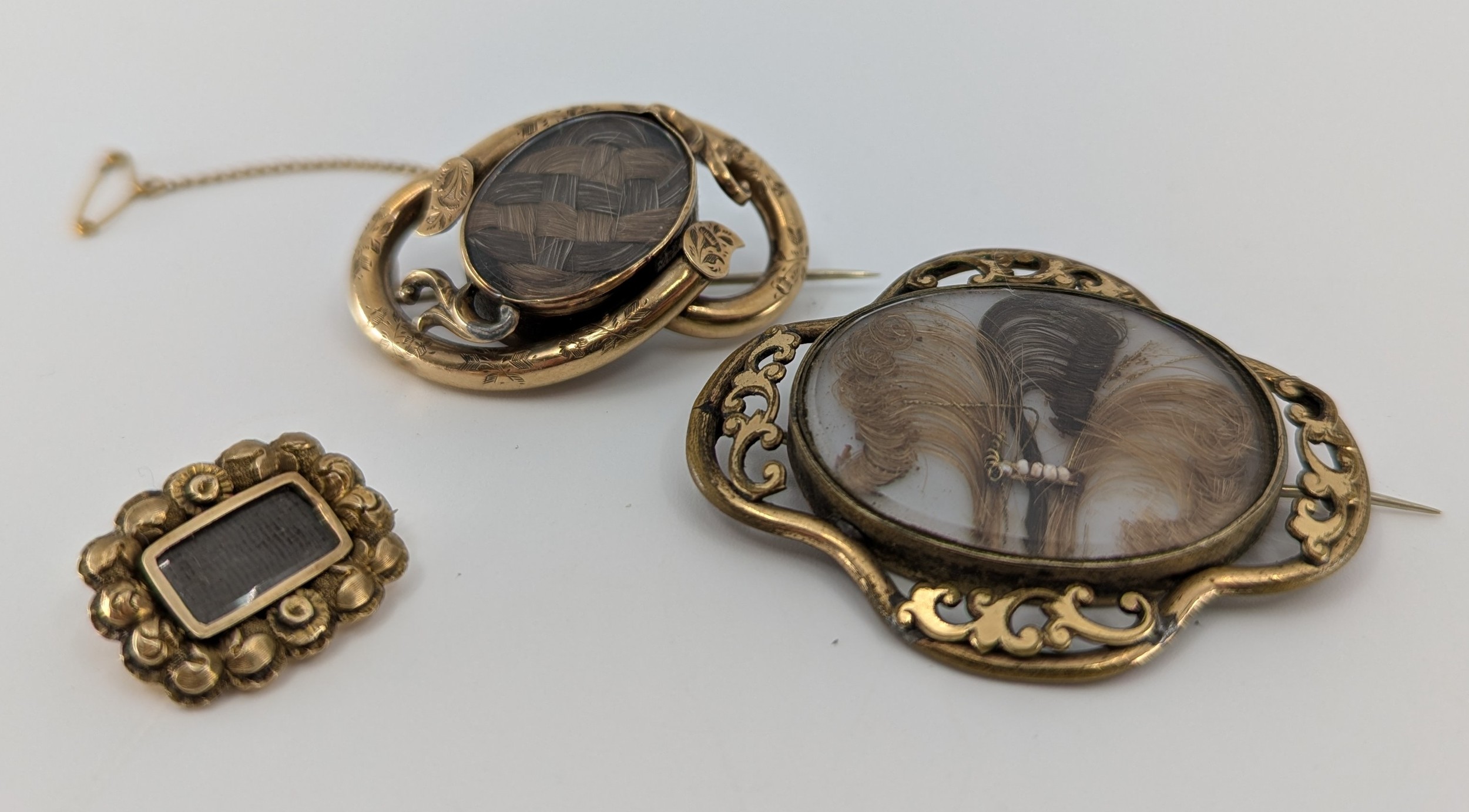 to include an unmarked yellow metal patterned mounted rectangular shaped mourning brooch with hair panel, approx. 2.2cm's long and 1.8cm's max height, approx. 5g gross, a unmarked yellow metal love knot mourning brooch with oval hair panel, approx. 4.5cm's long and 3cm's max height, safety chain, approx. 12.3g gross and a gold plated base metal Prince of Wales Feathers design panel brooch, approx. 5.5cm's long and 4.6cm's max height, a/f (3)
