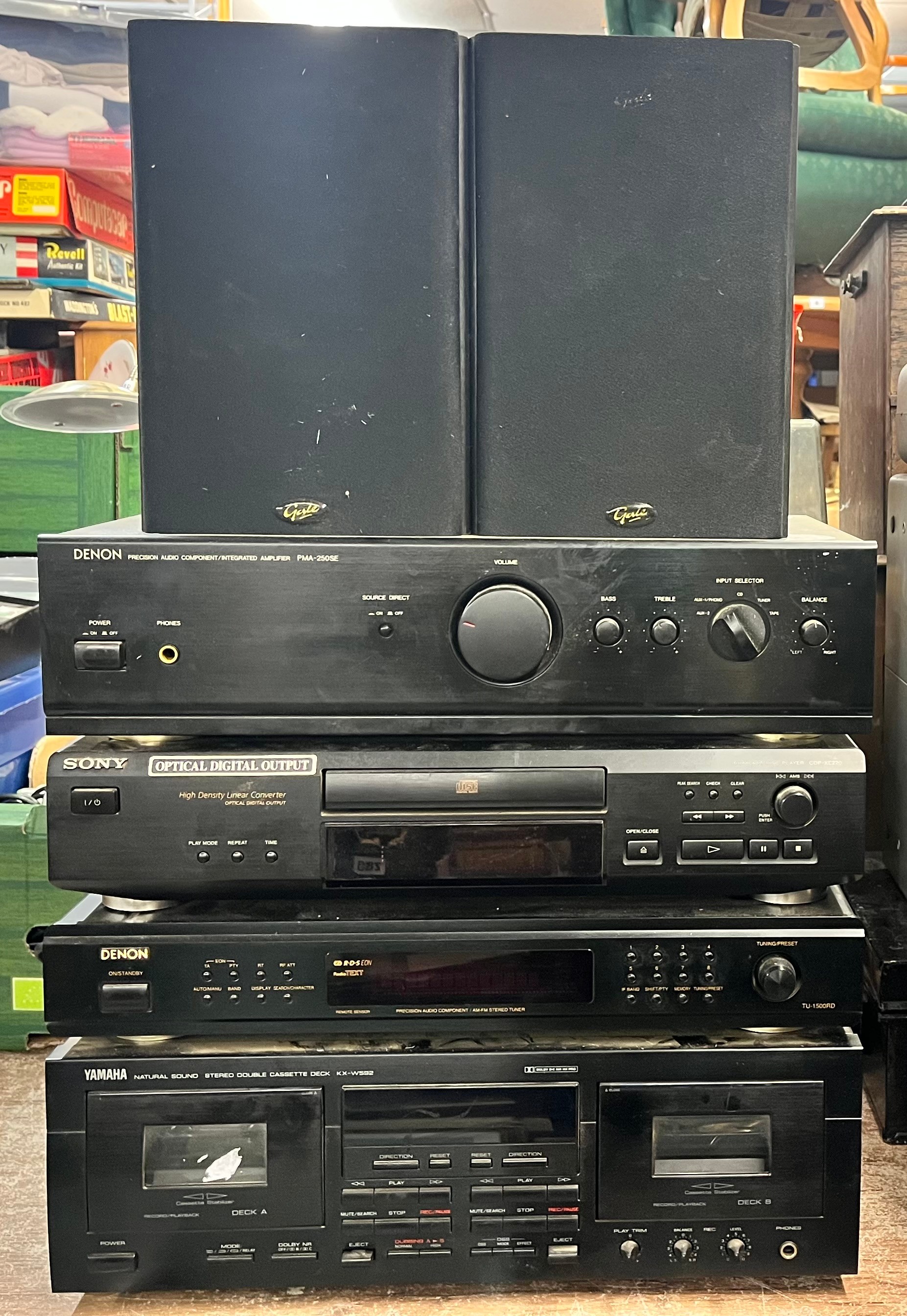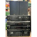 DENON INTEGRATED AMPLIFIER AND STEREO TUNER, SONY OPTICAL DIGITAL CD PLAYER AND YAMAHA DOUBLE CASETTE DECK