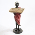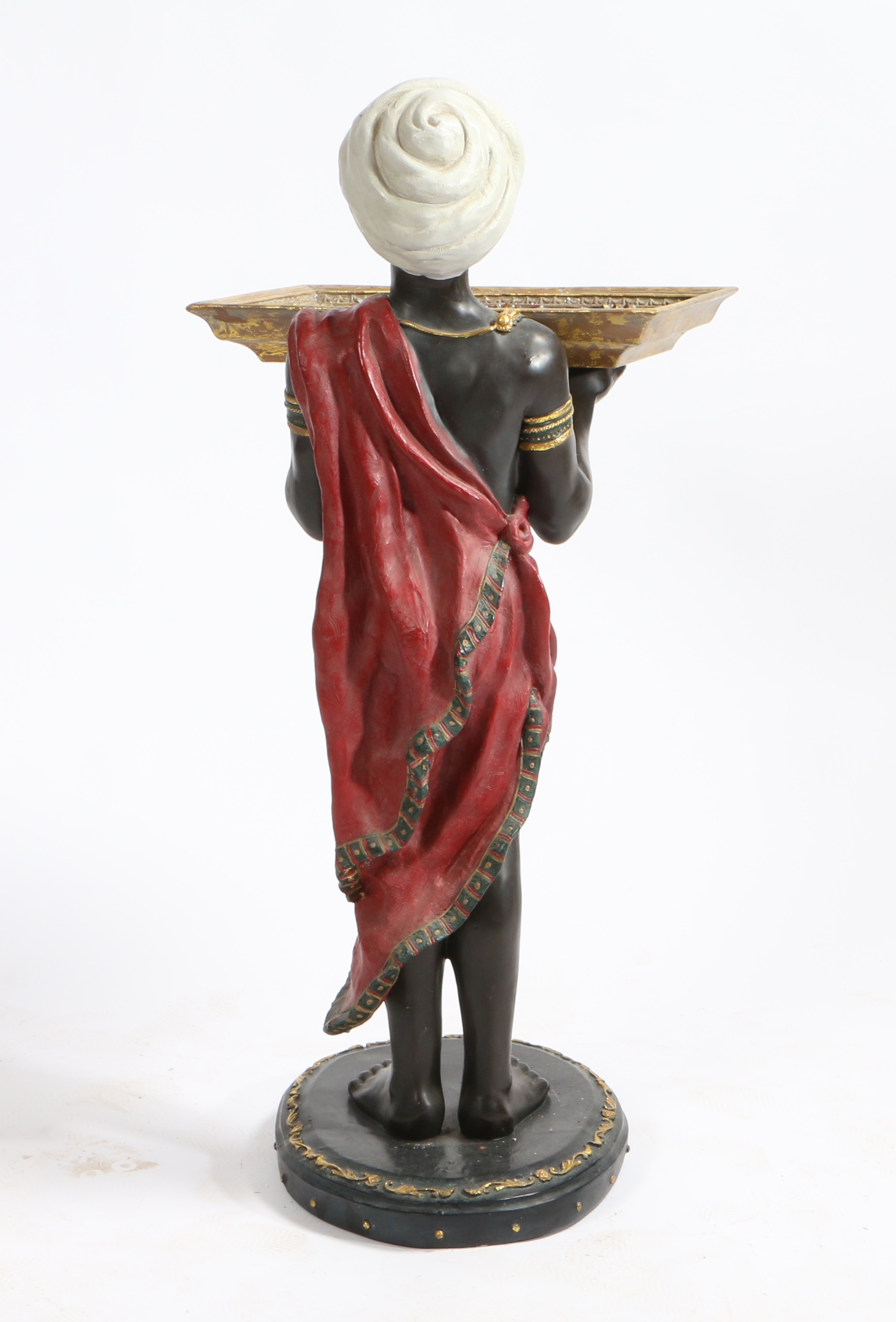 A 20TH CENTURY BLACKAMOOR FIGURE HOLDING FRUIT TRAY. depicting a figure wearing a red garment and holding a gilt tray raised on a oval base, 87cm high.