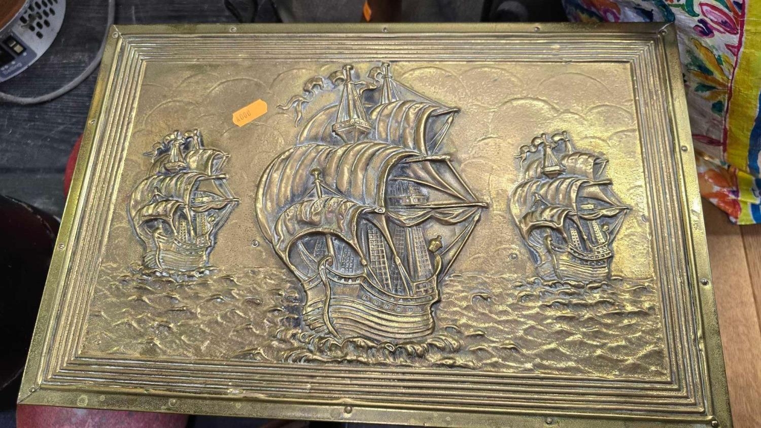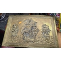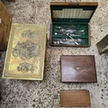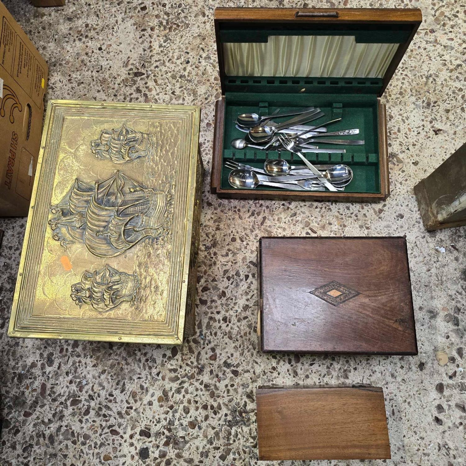 CUTLERY BOX WITH STAINLESS STEEL CUTLERY & A BRASS EMBOSSED BOX CONTAINING 2 OTHER BOXES
