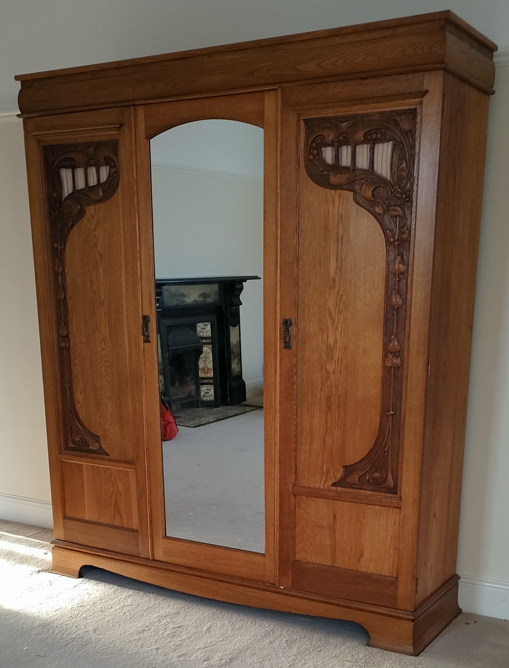 Early 20th century large oak three door mirrored wardrobe, with Art Nouveau style carving. Approx. 212cm H x 179cm W x 51cm D