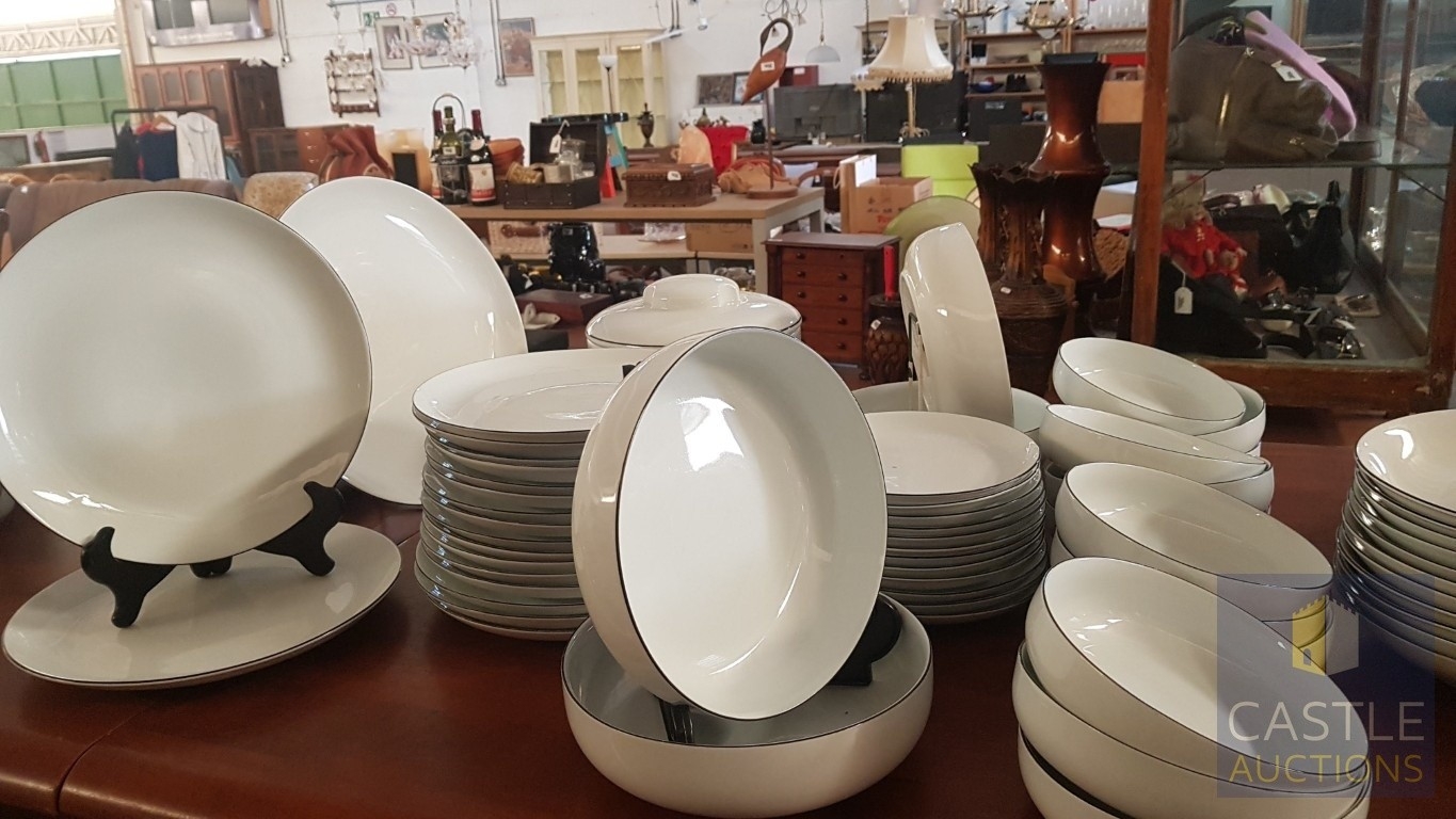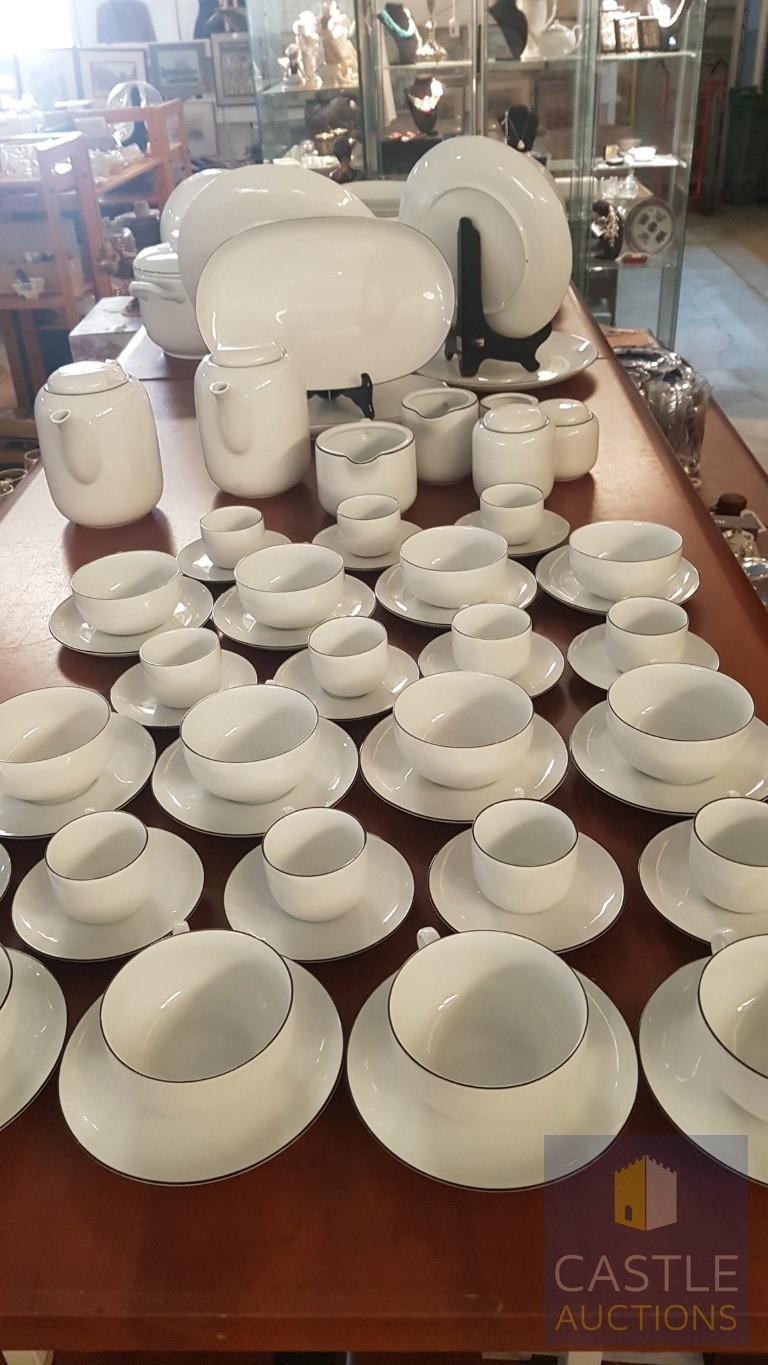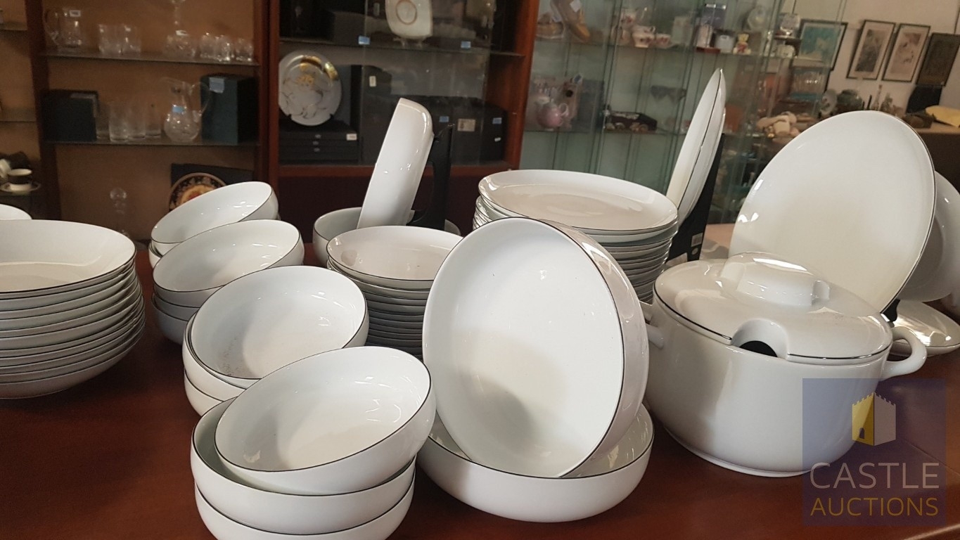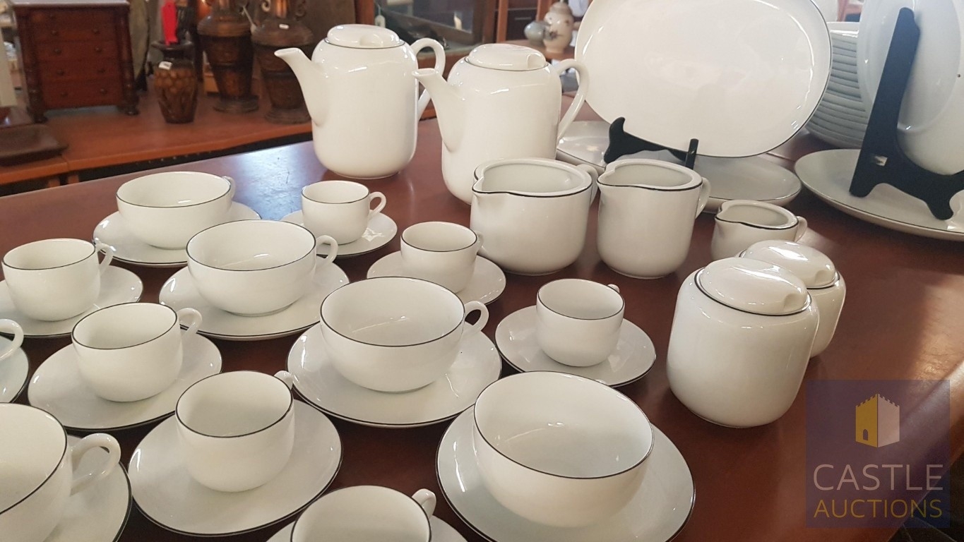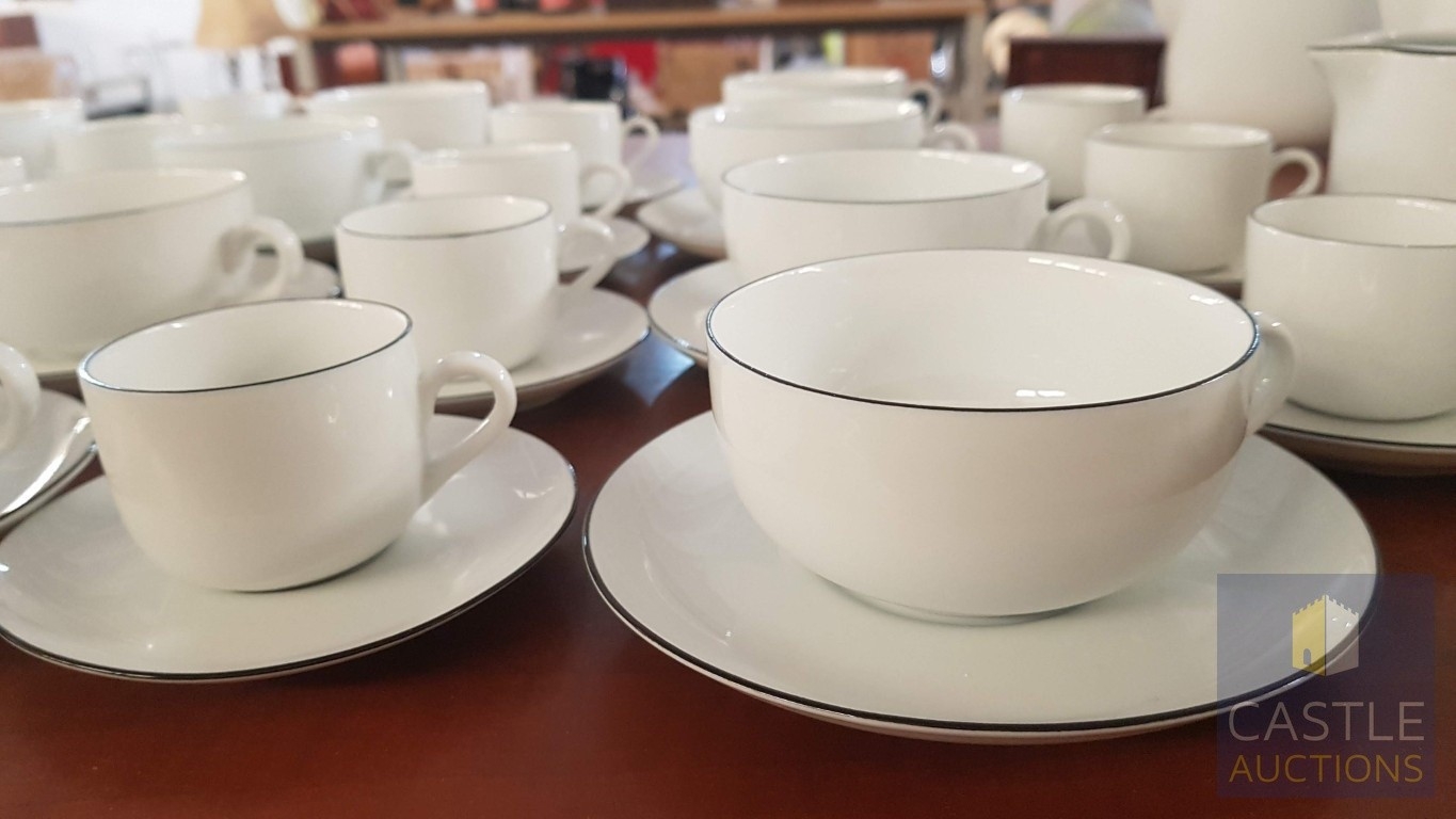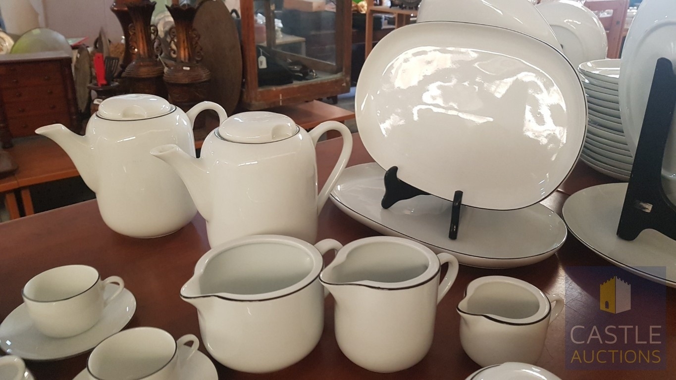 100 Pcs Modern White Porcelain Dinner Set, Decorative with Black Trim, Karolina Factory- Jaworzyna/Slaska Poland; Inc. 2 x Pots, 3x Milk Jugs (Different Sizes), 2x Lided Sugar Bowls (Different Sizes), 12x Tea Cups with Saucers, 12x Coffee Cups with Saucers, 2x Oval Serving Dishes, 3x Round Serving Dishes, 16x Dinner Plates, 12x Cake Plates, 18x Side Plates, 11x Soup Plates, 12x Small Bowls, 4x Large Serving Bowls and 1x Tureen Dish with Lid (Approx. 110 Pcs)