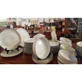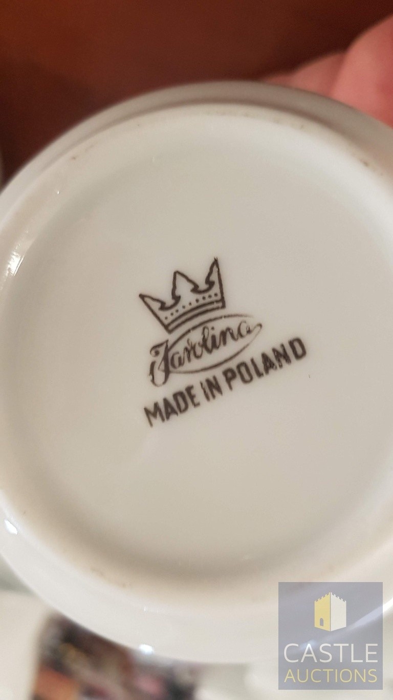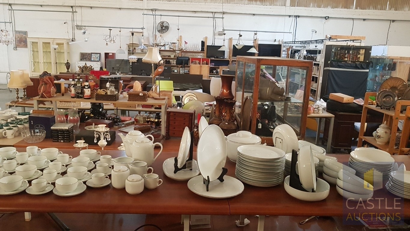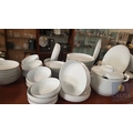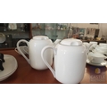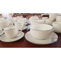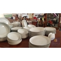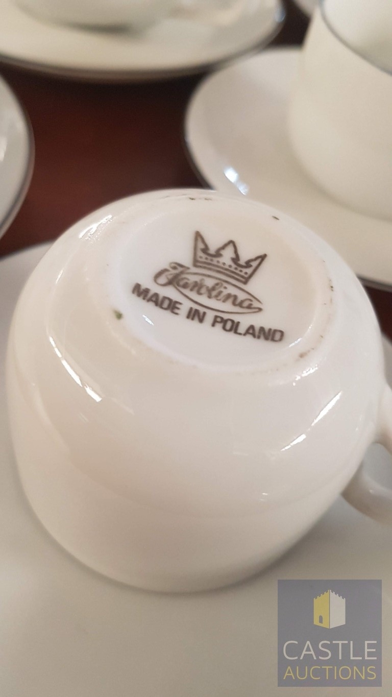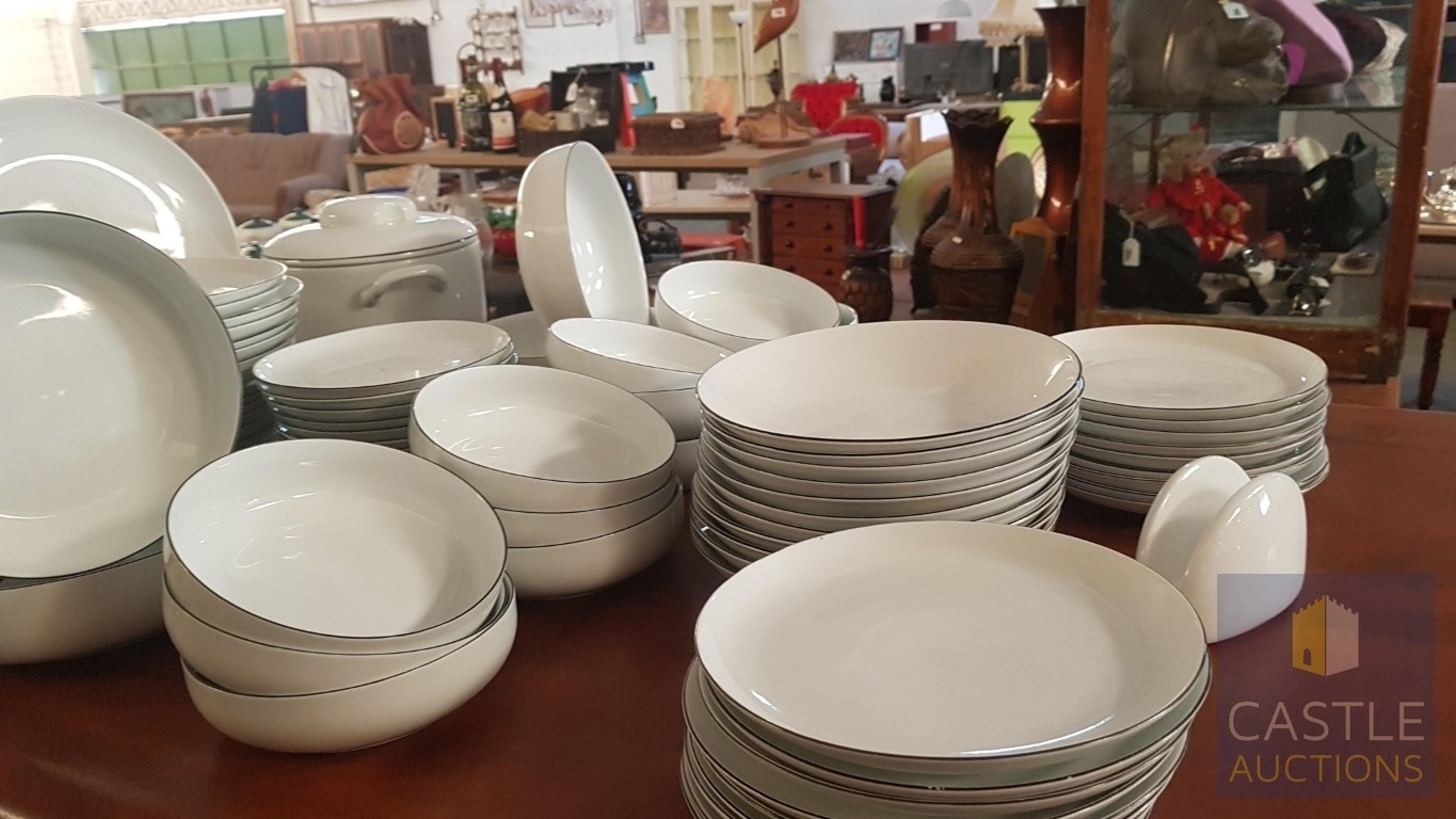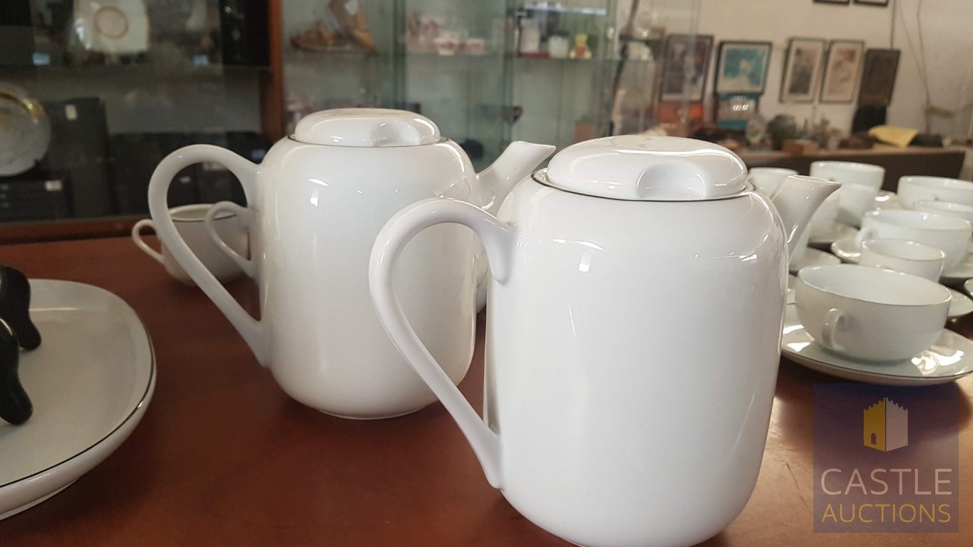 100 Pcs Modern White Porcelain Dinner Set, Decorative with Black Trim, Karolina Factory- Jaworzyna/Slaska Poland; Inc. 2 x Pots, 3x Milk Jugs (Different Sizes), 2x Lided Sugar Bowls (Different Sizes), 12x Tea Cups with Saucers, 12x Coffee Cups with Saucers, 2x Oval Serving Dishes, 3x Round Serving Dishes, 16x Dinner Plates, 12x Cake Plates, 18x Side Plates, 11x Soup Plates, 12x Small Bowls, 4x Large Serving Bowls and 1x Tureen Dish with Lid (Approx. 110 Pcs)