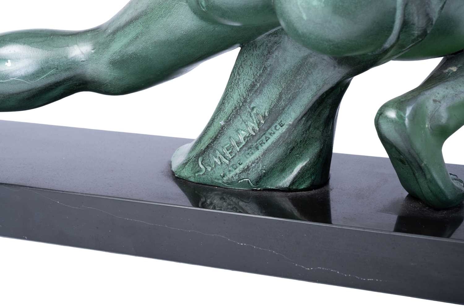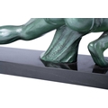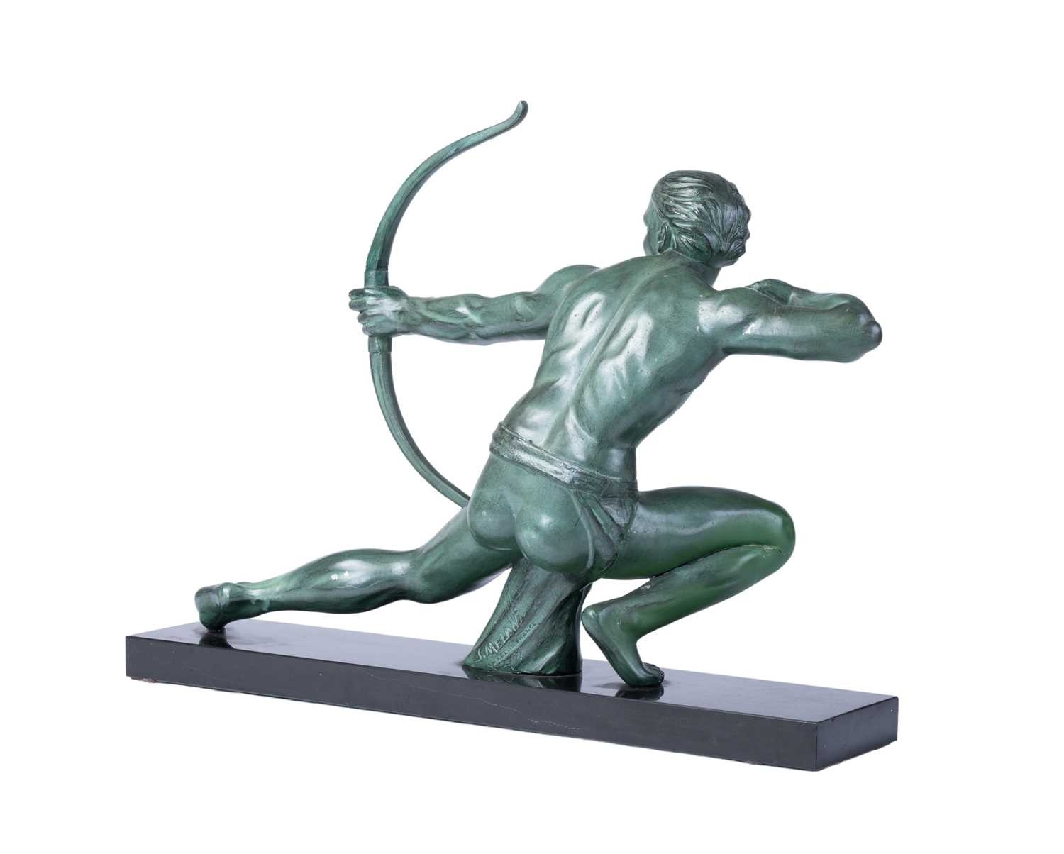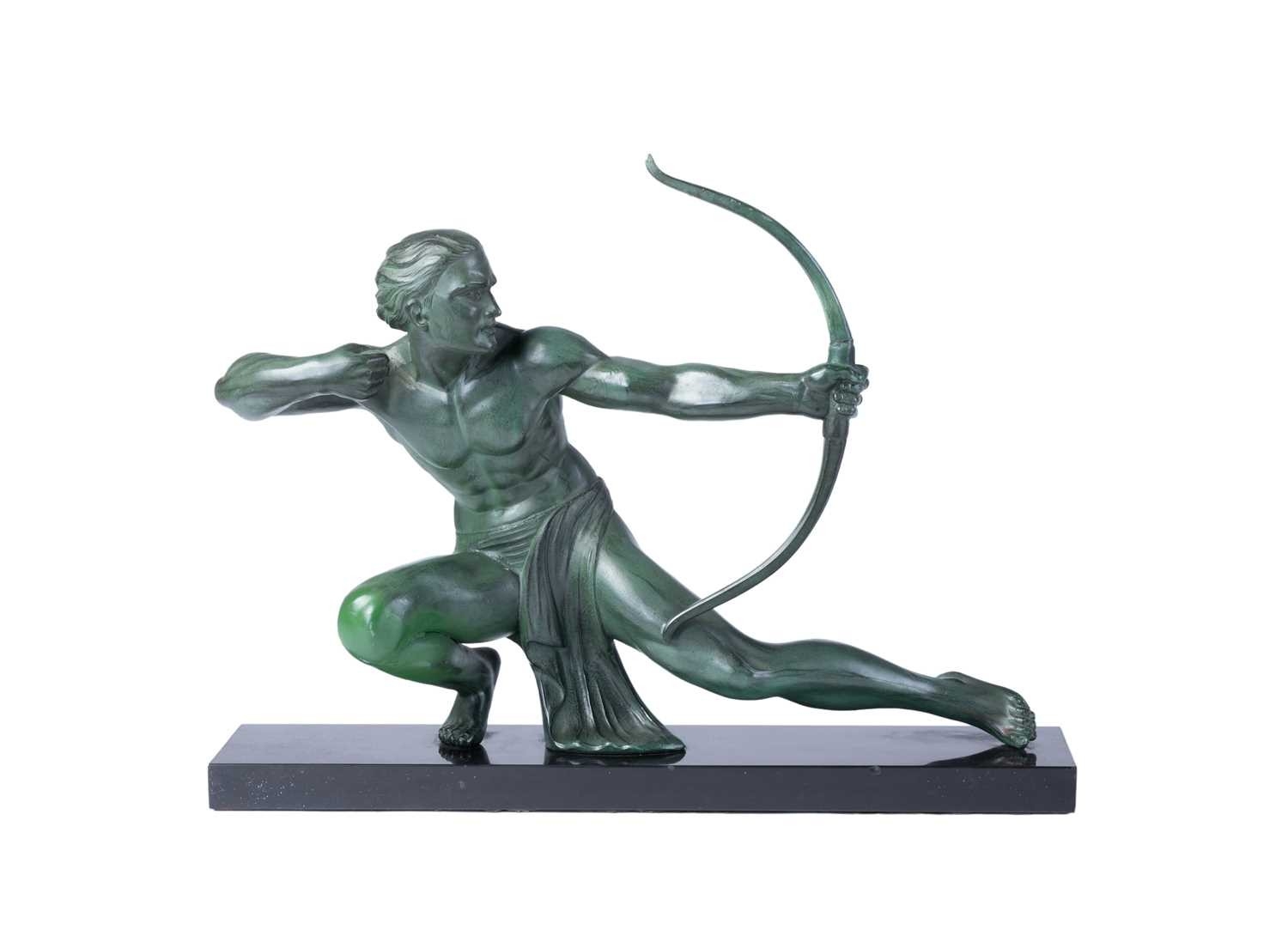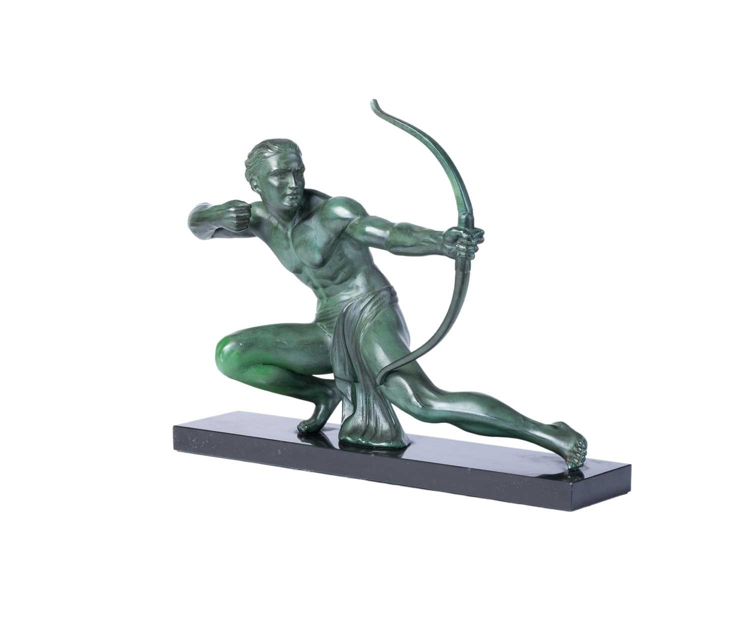 A French sculptural figure of a kneeling archer, second quarter of the 20th century, cast in patinated spelter with green-bronze finish, on a rectangular marble plinth. 42 cm high x 55.5 cm.