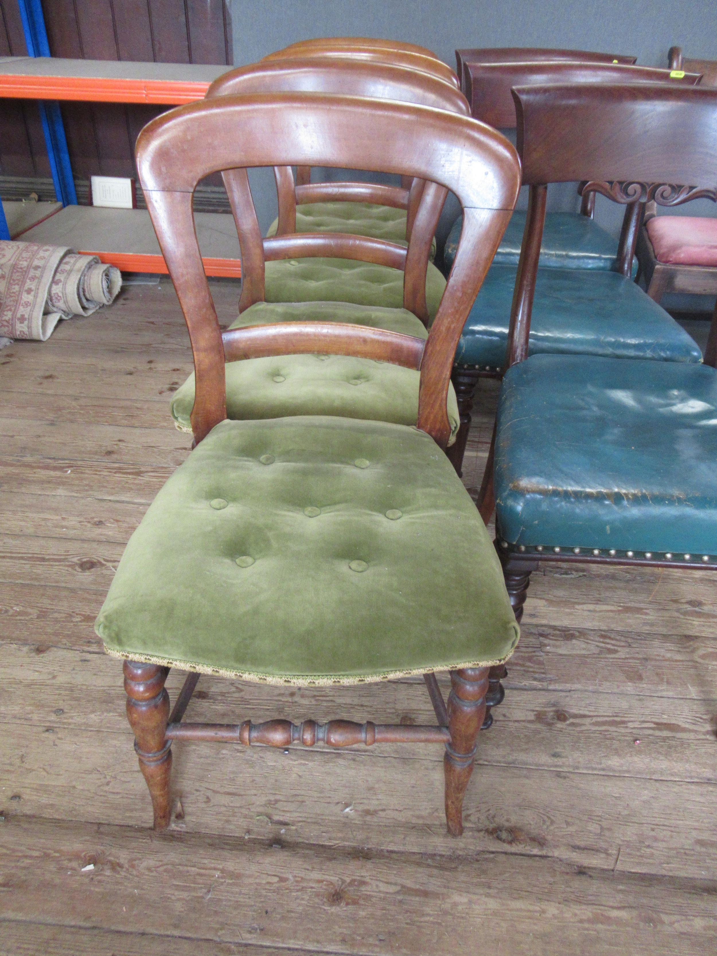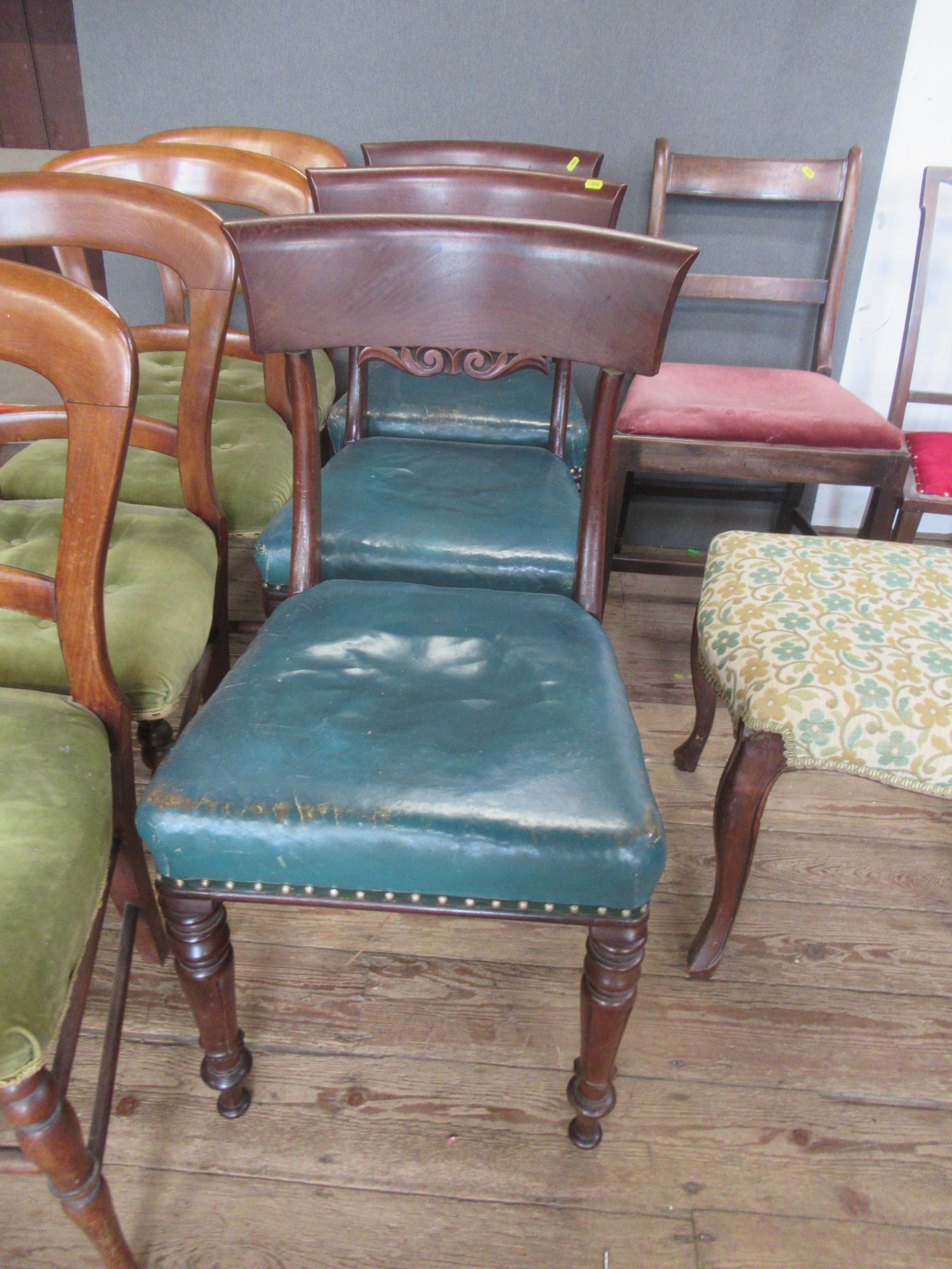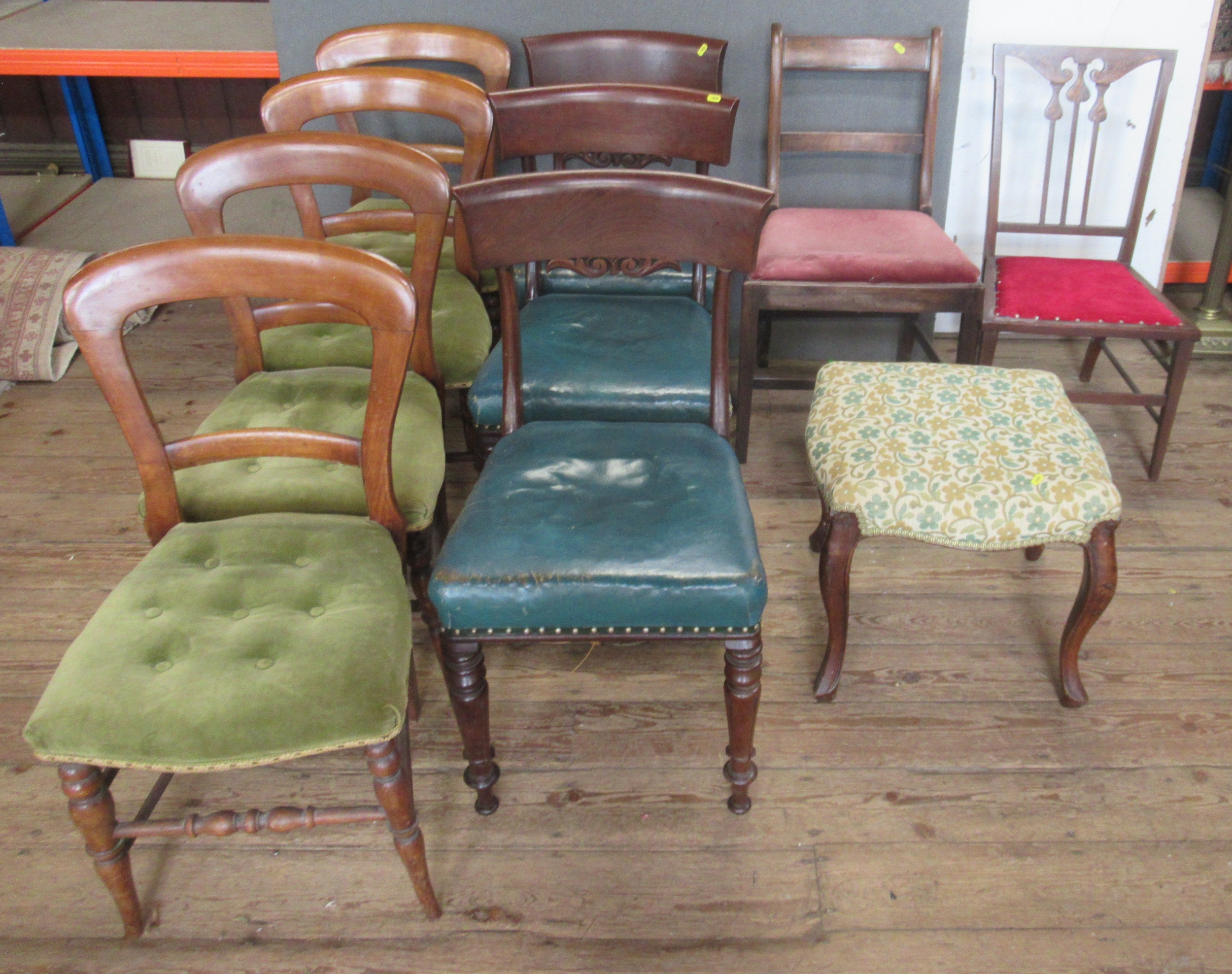 A set of four 19th century mahogany balloon back chairs, together with three bar back dining chairs, two other chairs and a stool
