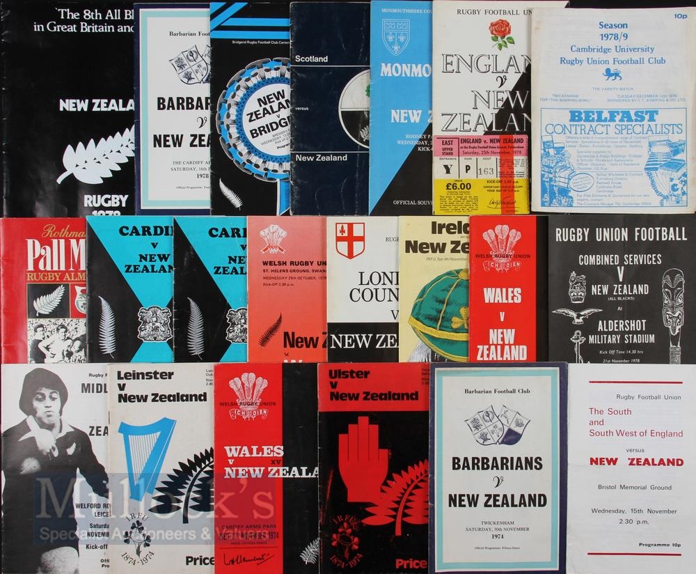 1974 & 1978 NZ All Blacks Tours Rugby Programmes etc (22): Leinster, Ulster, Wales XV & Barbarians games from the 1974 visit, plus 15 issues inc all tests from 1978, inc one duplicate and one ticket (England) plus the Rothmans Rugby Almanack for the tour & a NZ News Souvenir Brochure. VG