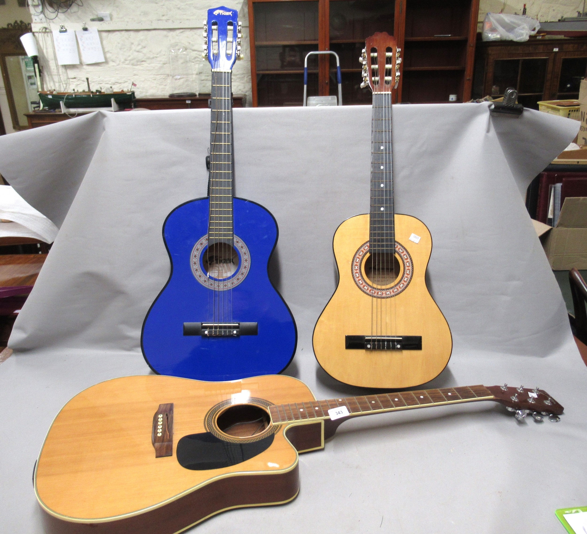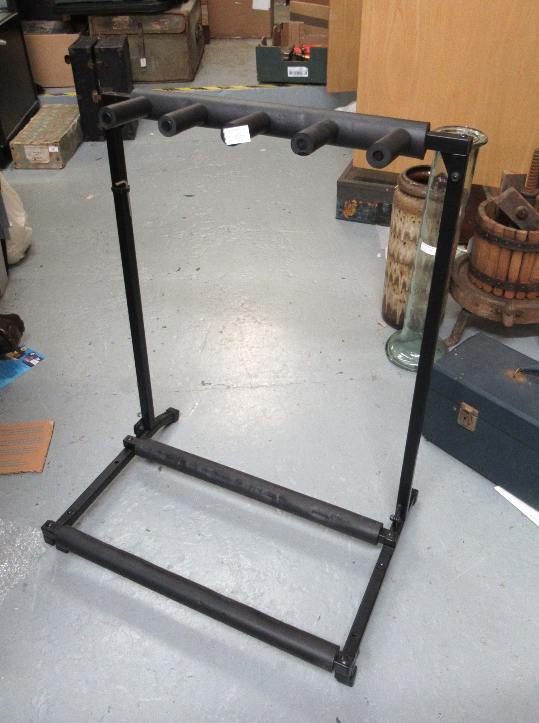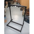 Three various guitars, including a Johnson, together with a metal guitar stand