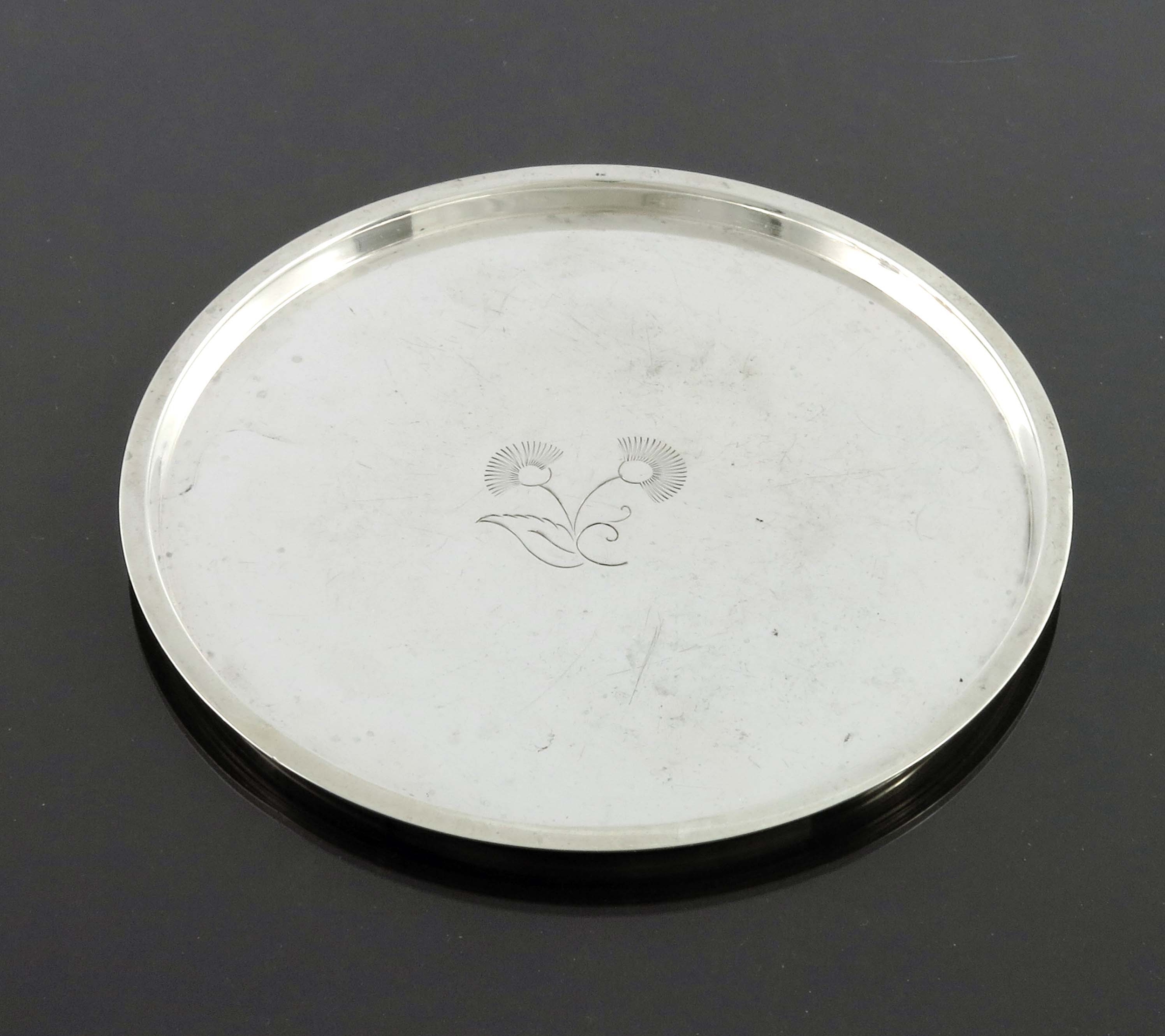 Just Andersen, a Danish Modernist silver dish, plain circular form engraved with a floral motif, stamped marks 1427, 14cm diameter, 3.91ozt