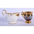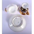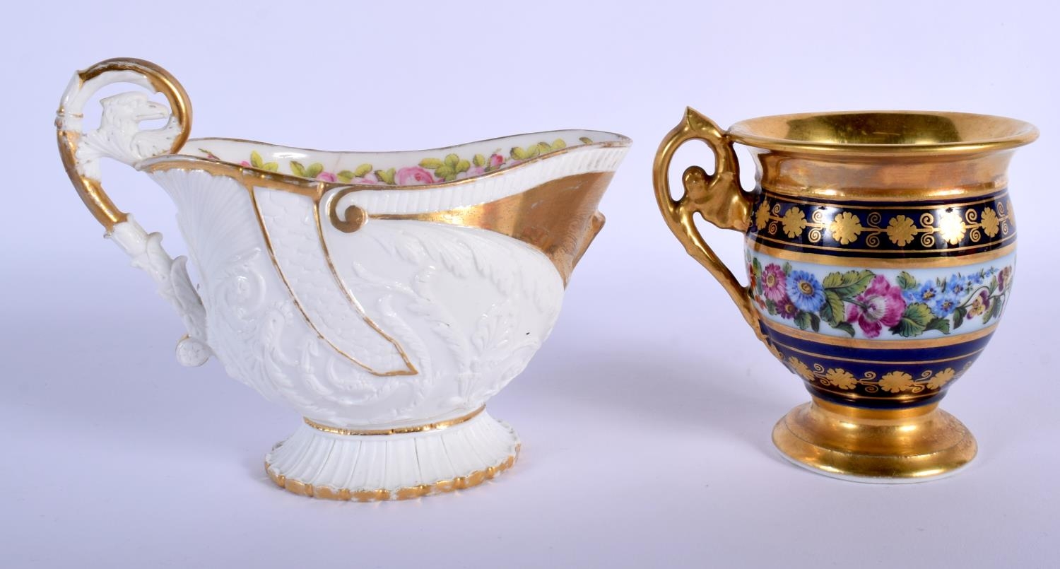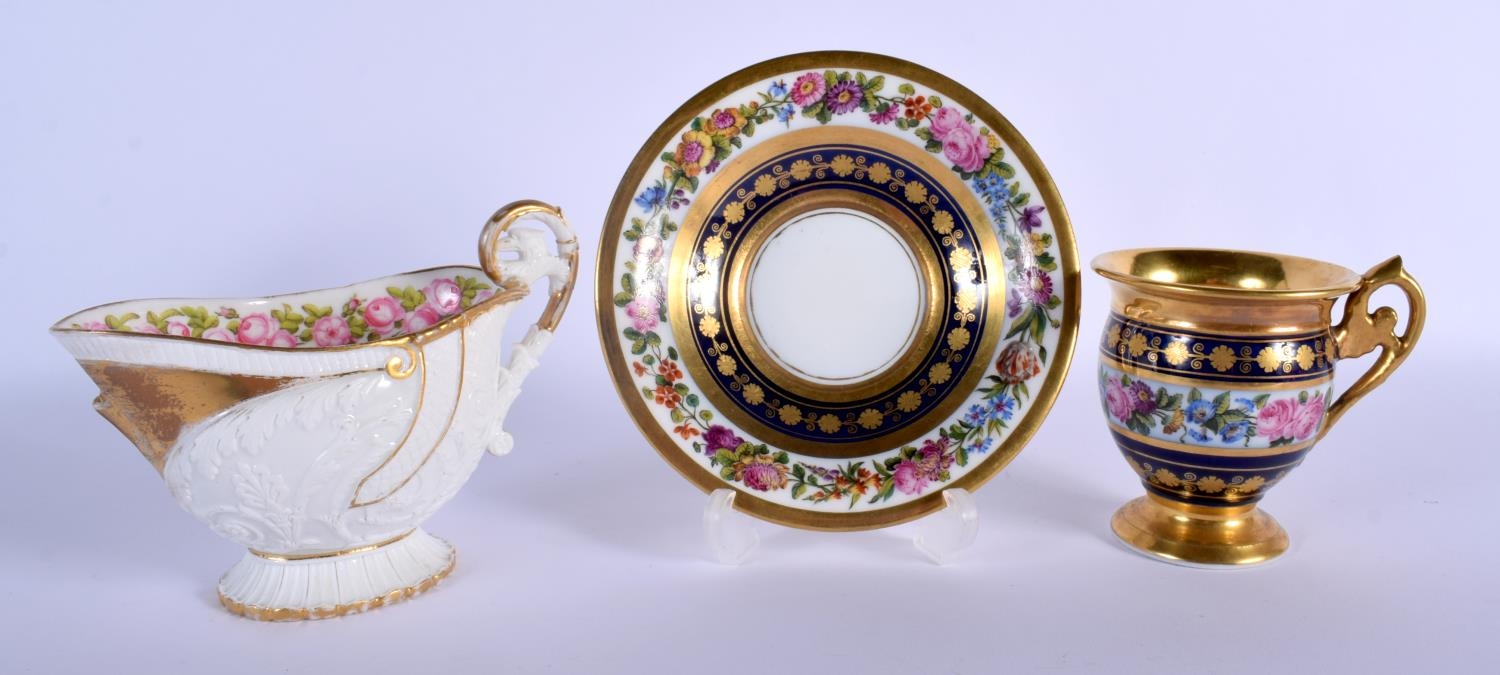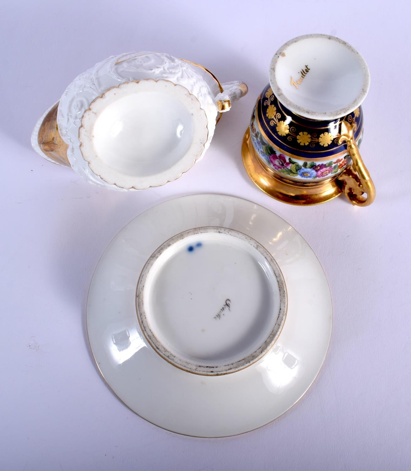 EARLY 19TH C. FEUILLET, RUE DE LA PAIX, PARIS EMPIRE CUP AND SAUCER PAINTED WITH A COLOURFUL FLORAL BAND, WITH GILDED WITH BANDS AND GILT FLOWERS ON A DARK BLUE BORDER, BOTH SIGNED 'FEUILLET' AND A FRENCH EMPIRE STYLE CREAM JUG WELL MOULDED AND PAINTED INTERNALLY WITH ROSES. Cream jug 10cm high, Cup 9cm high, Saucer 14cm diameter (3)