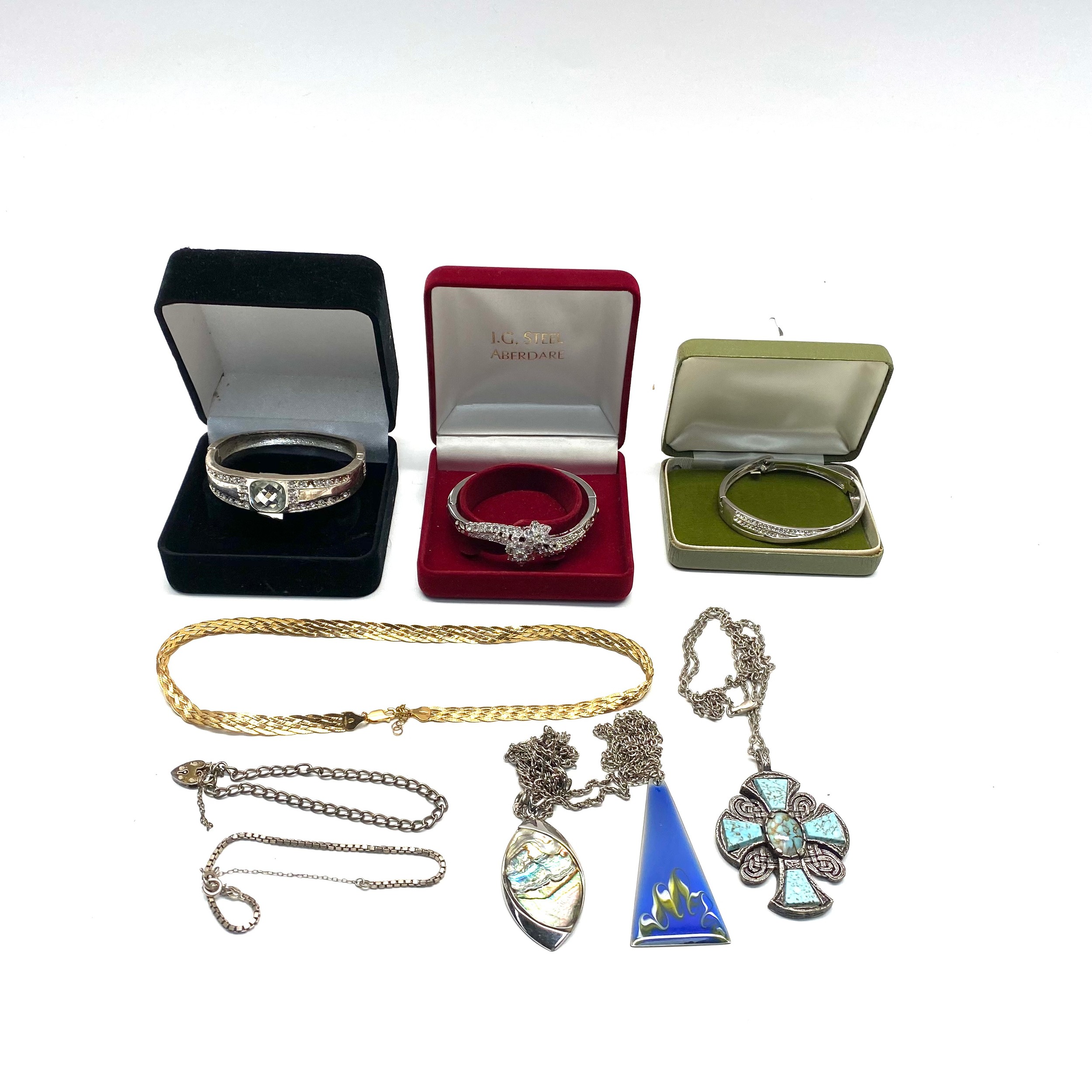 Gold on silver fine necklace, hand made necklaces, sterling silver gate bracelet and three quality boxed bangles.