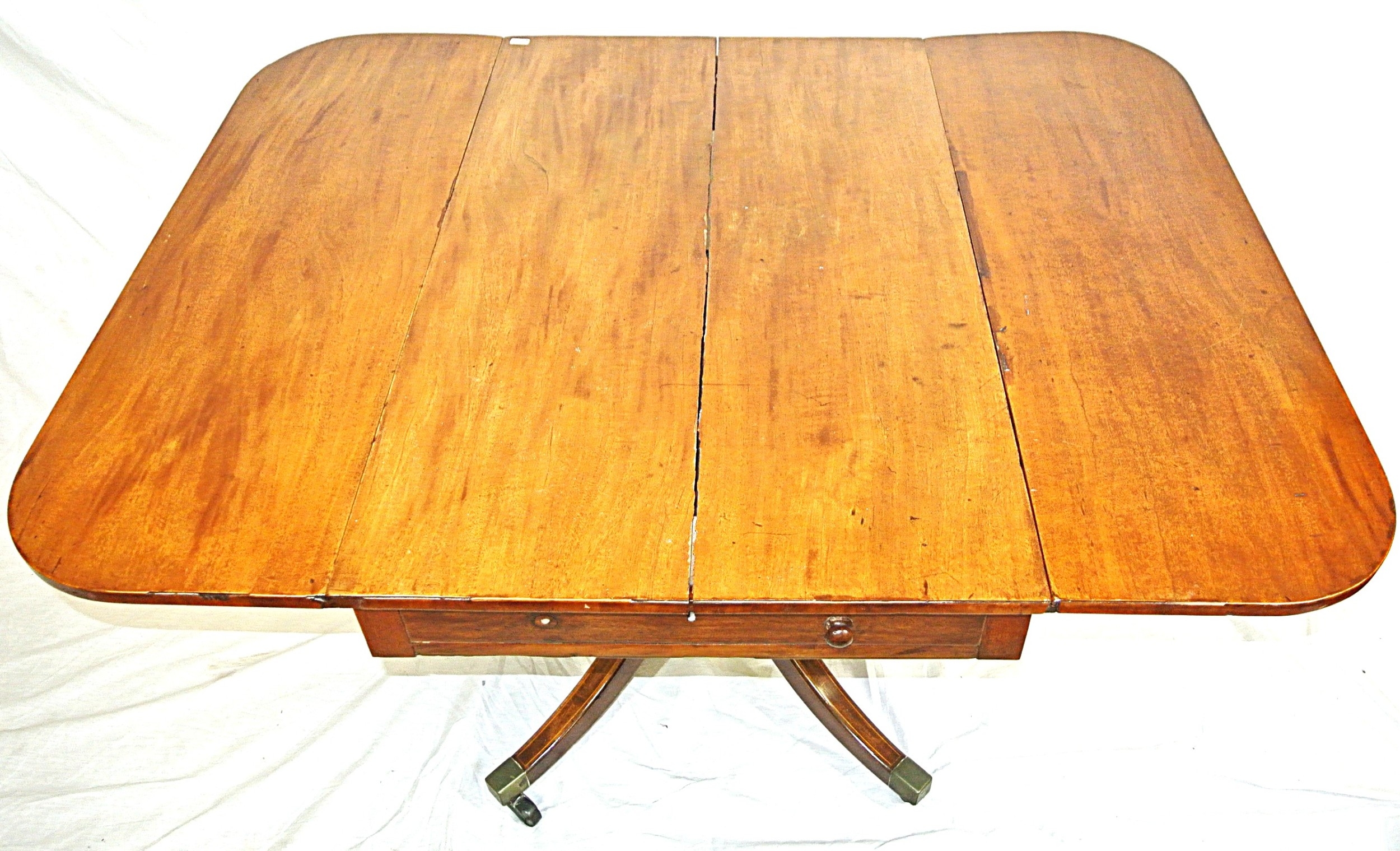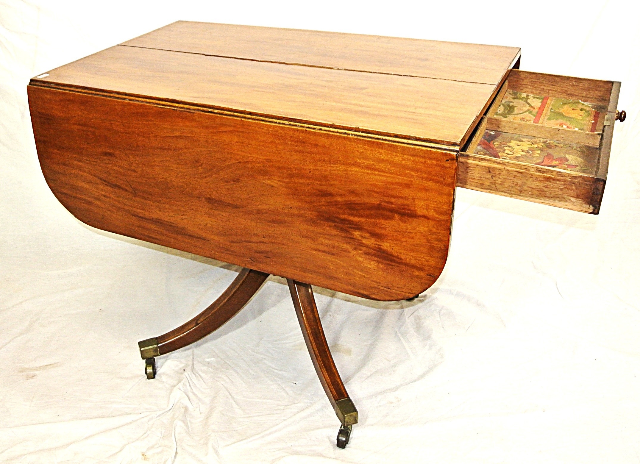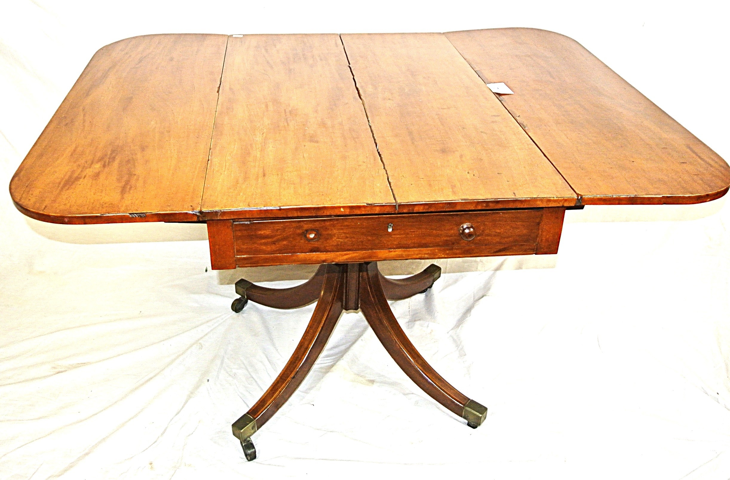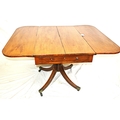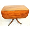 Edwardian mahogany Pembroke table with drop leaves, frieze drawer, on turned column, on quadrapod with caster