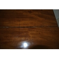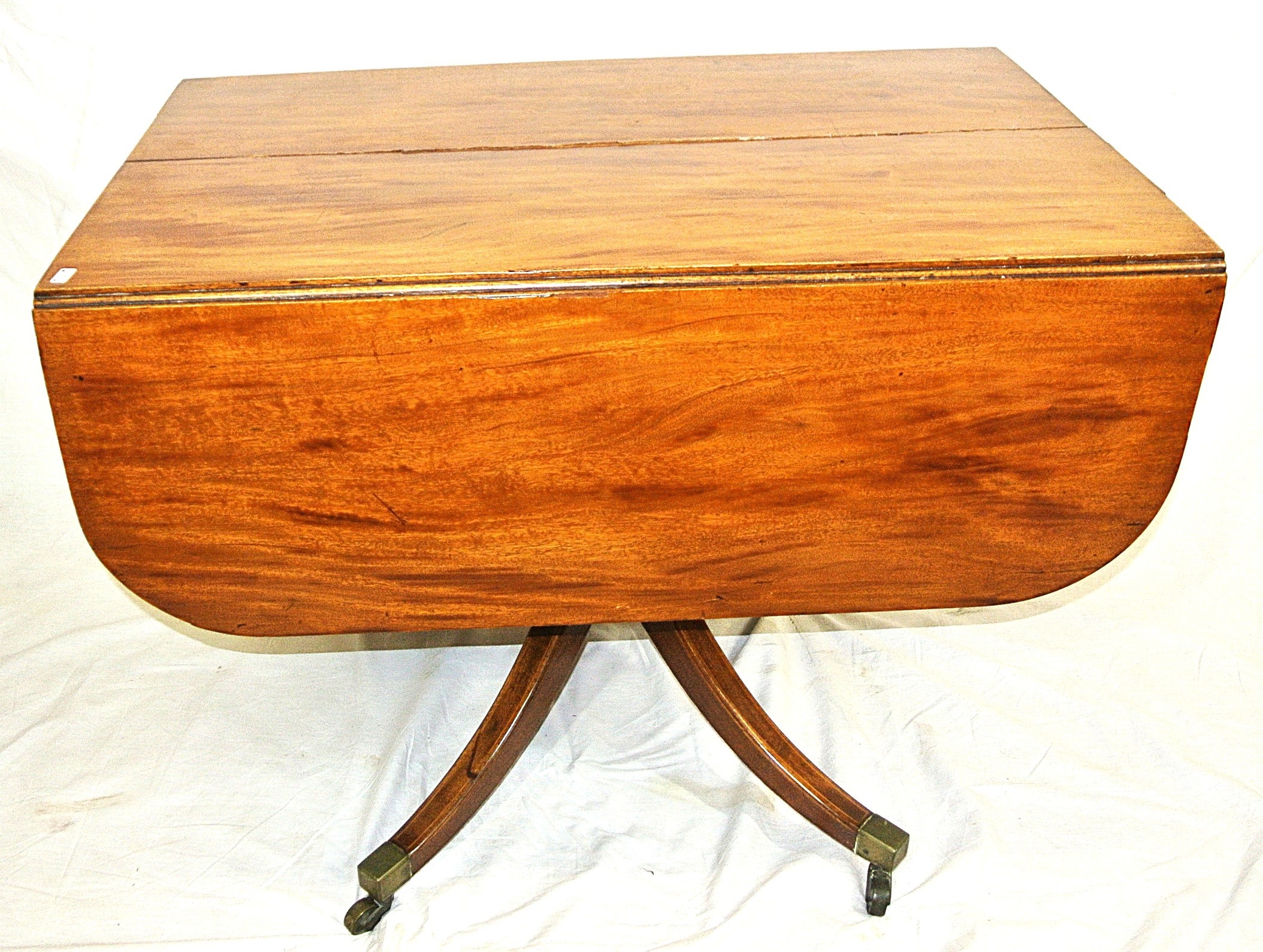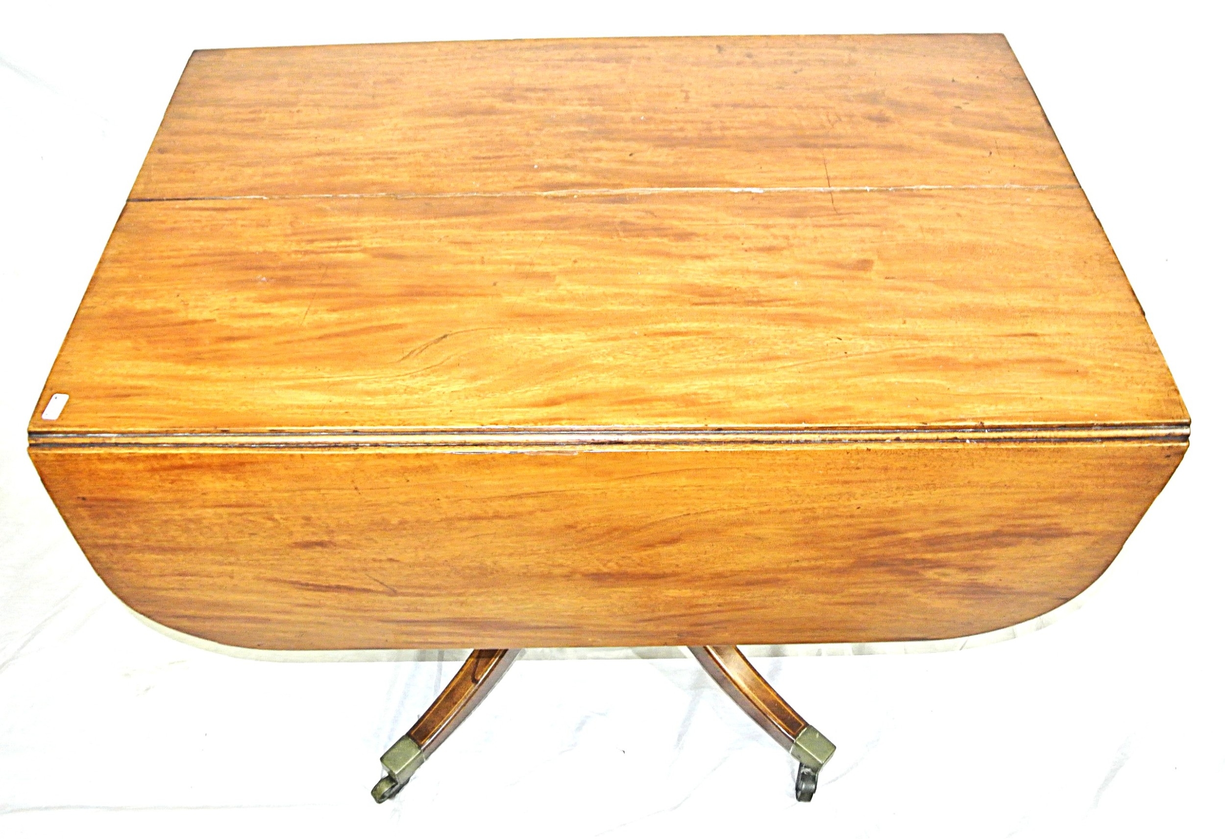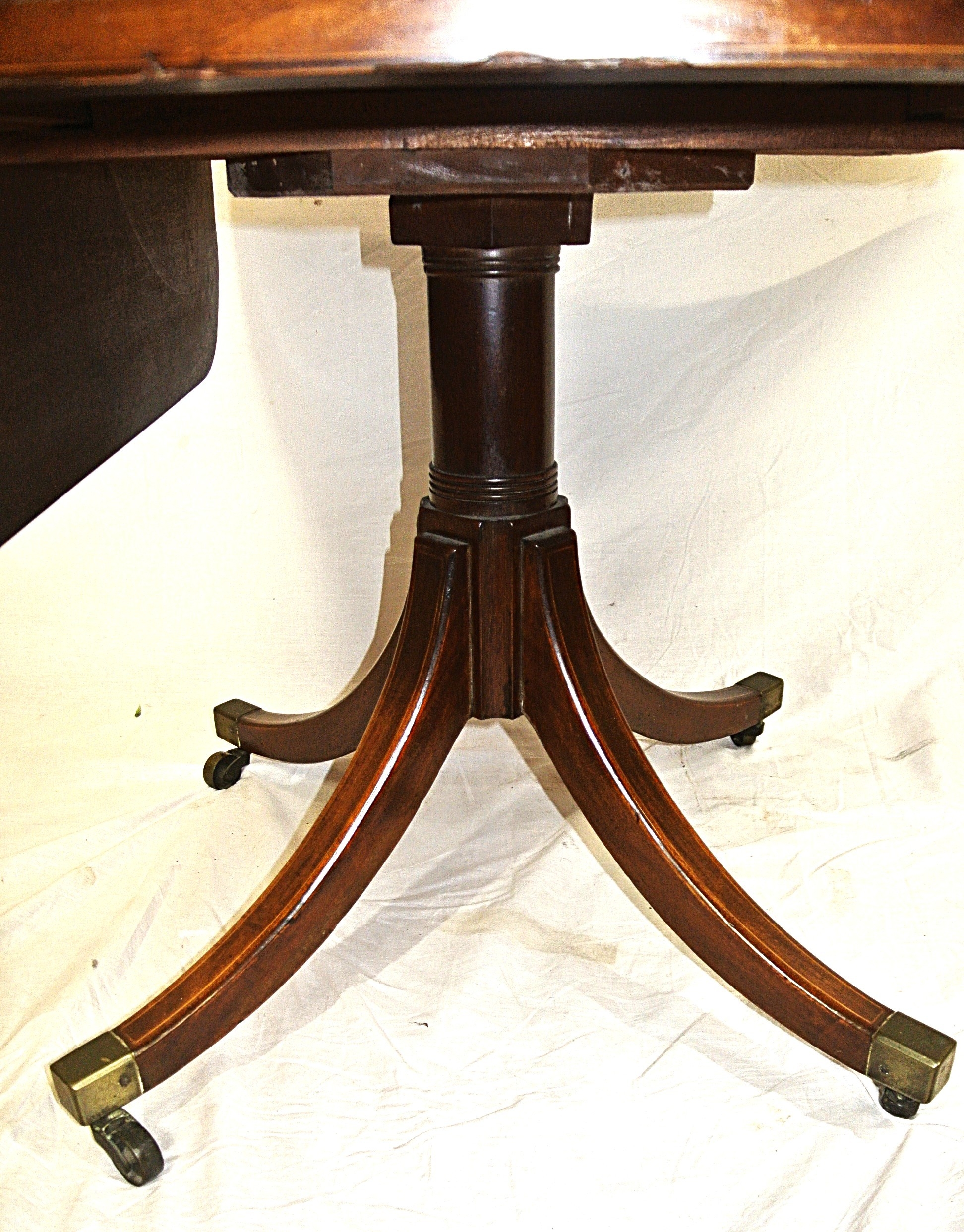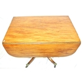 Edwardian mahogany Pembroke table with drop leaves, frieze drawer, on turned column, on quadrapod with caster