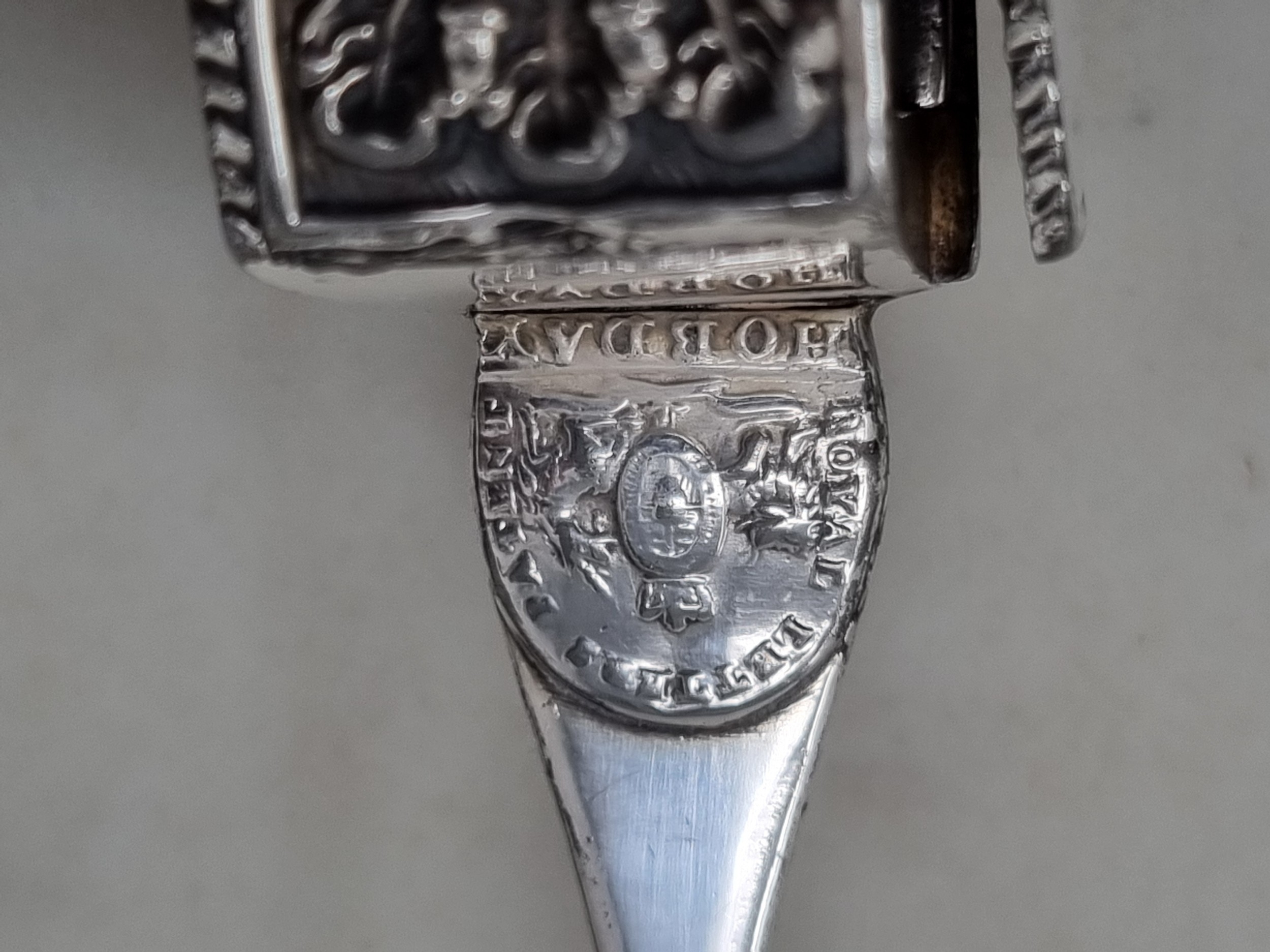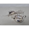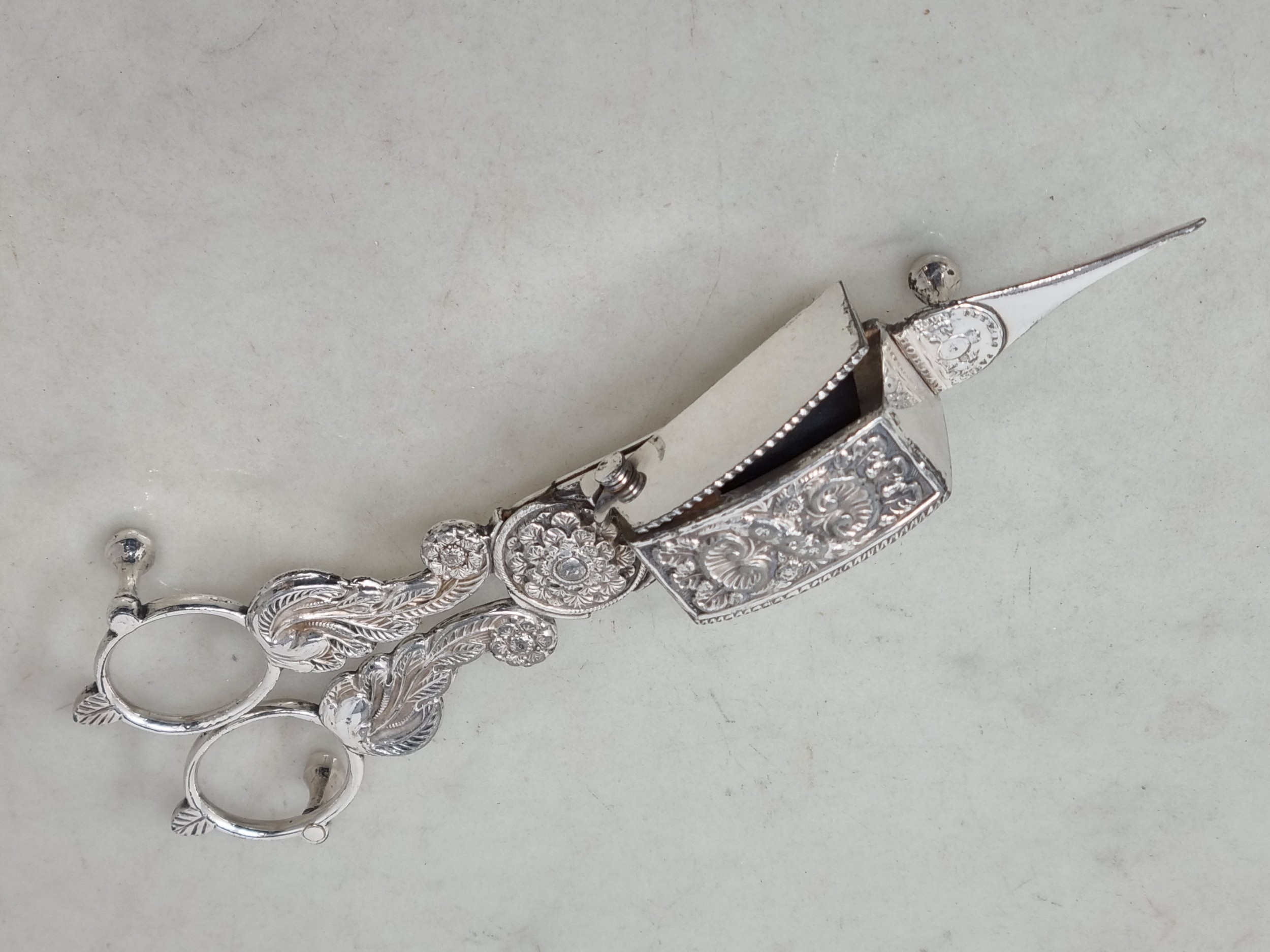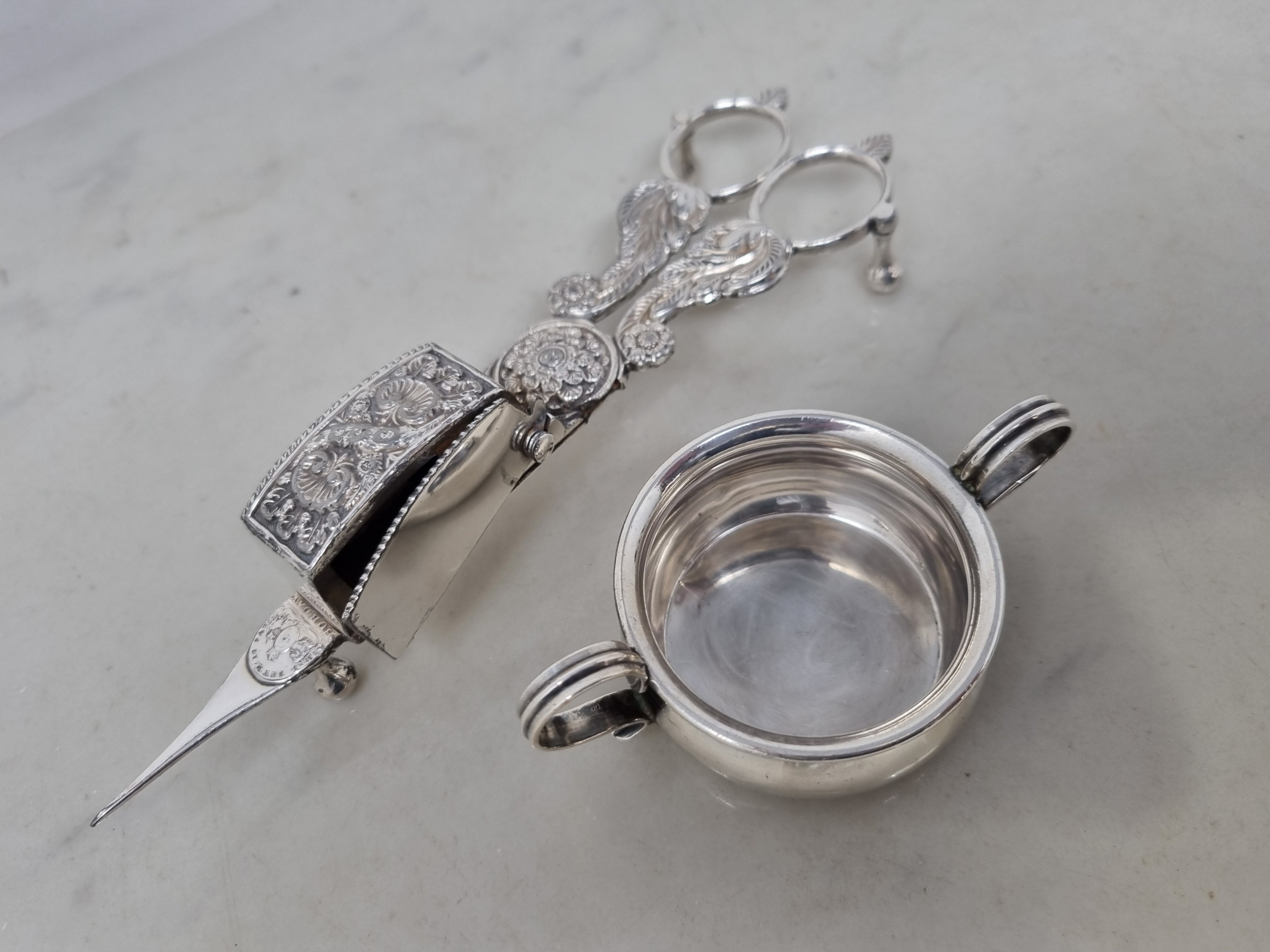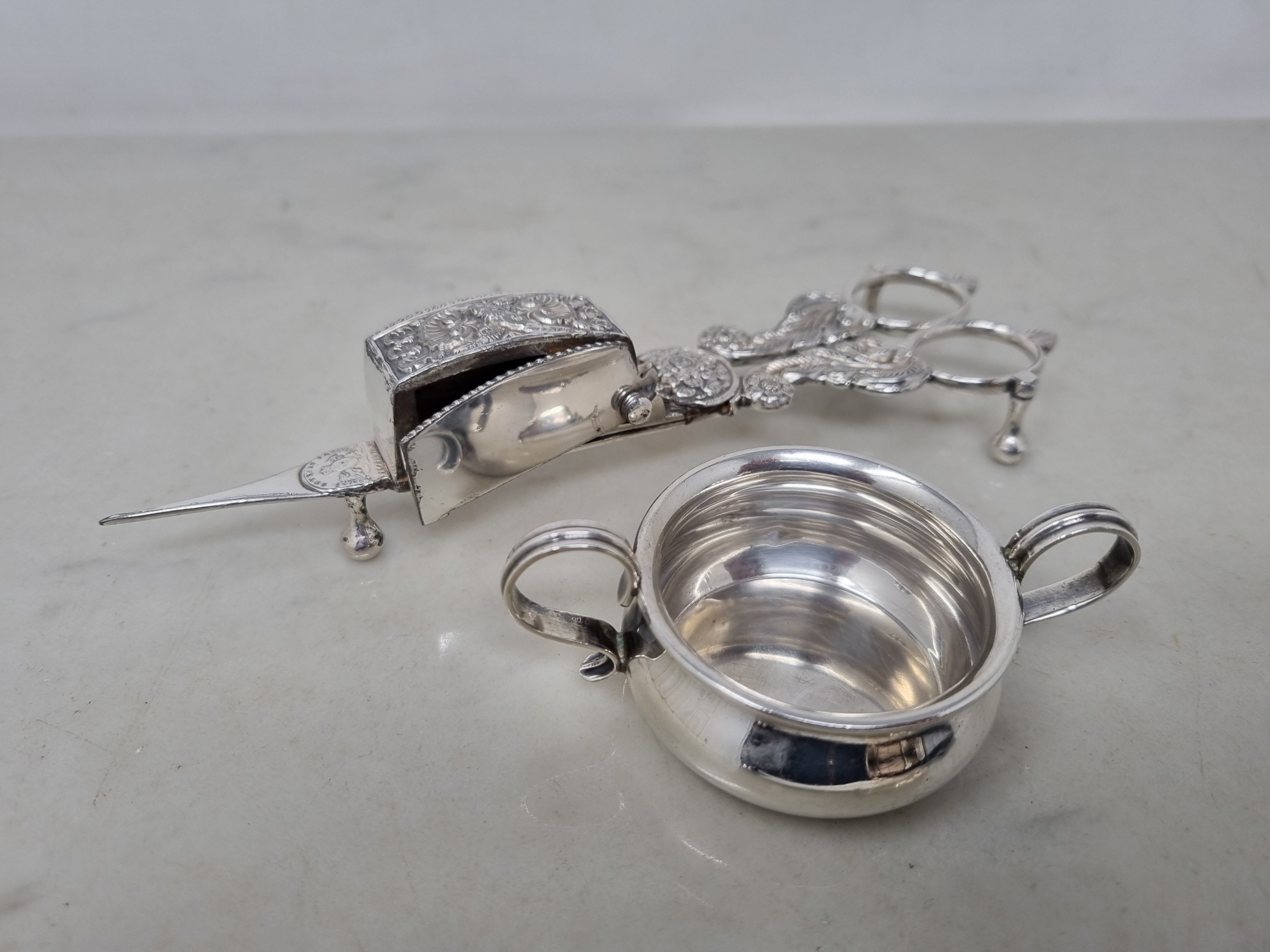 A George V silver two handled Pot, London 1911,and a pair of plated Hobday patent Candle Snuffers with floral, leafage and scallop decoration