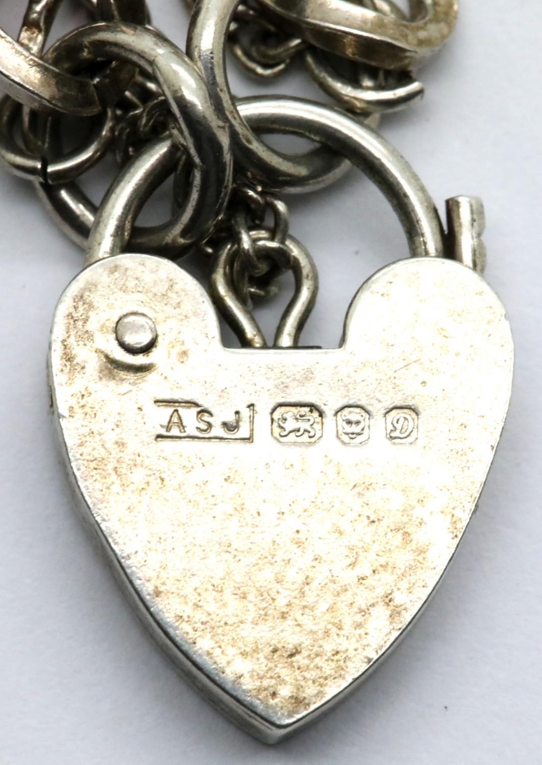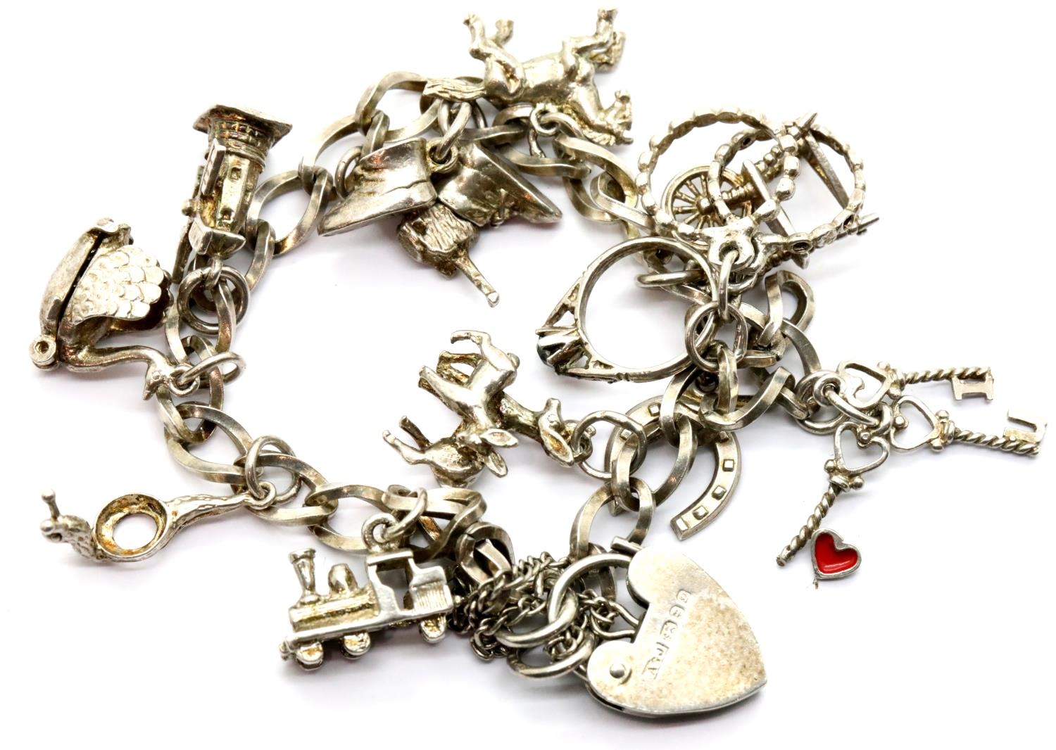 Silver charm bracelet with twelve charms, 27g. P&P Group 1 (£14+VAT for the first lot and £1+VAT for subsequent lots)