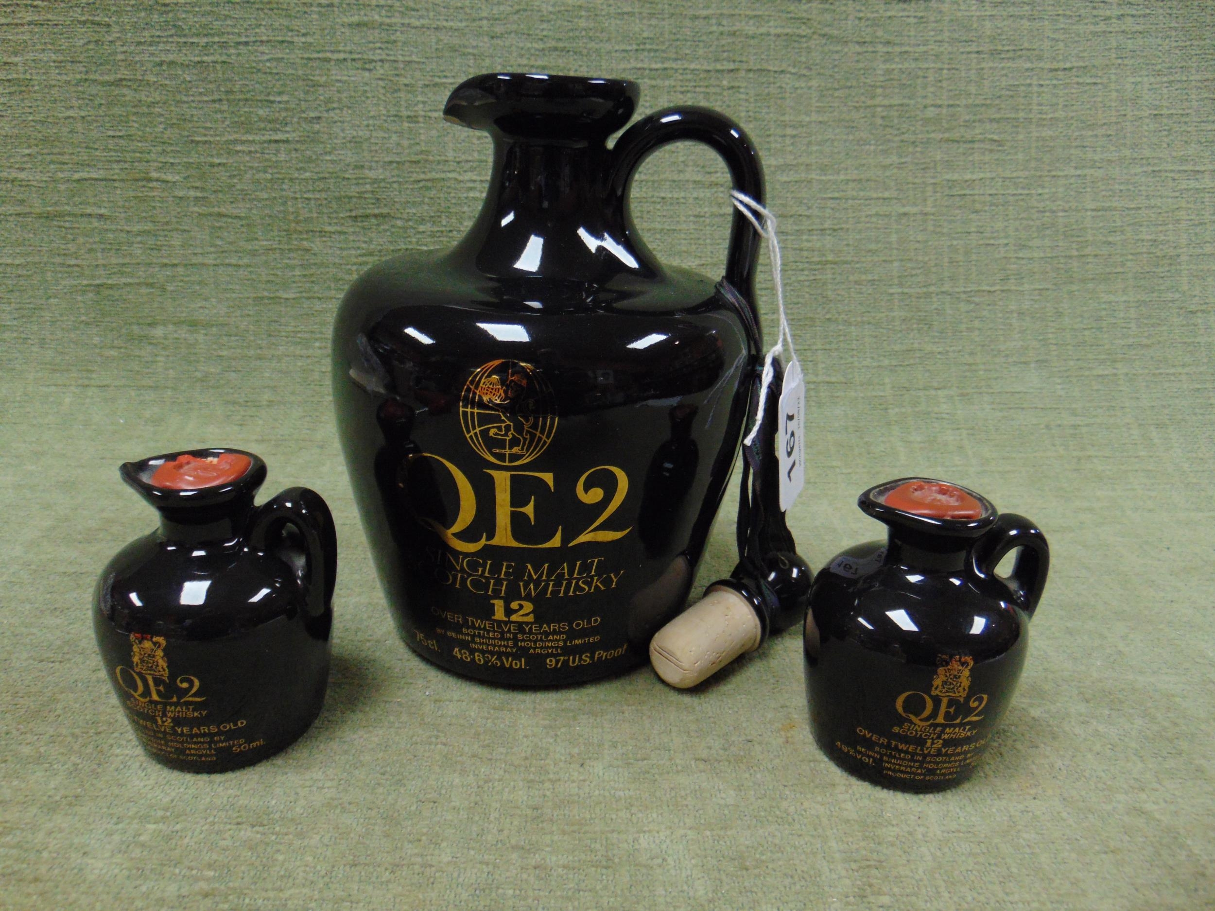 75cl decanter of QE2 Single Malt Scotch Whisky, over 12 years old, with two smaller empty decanters.