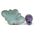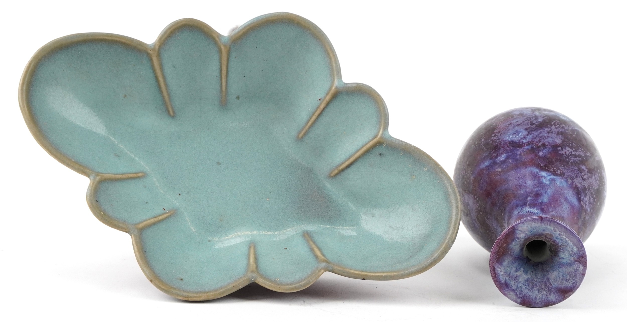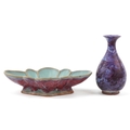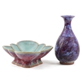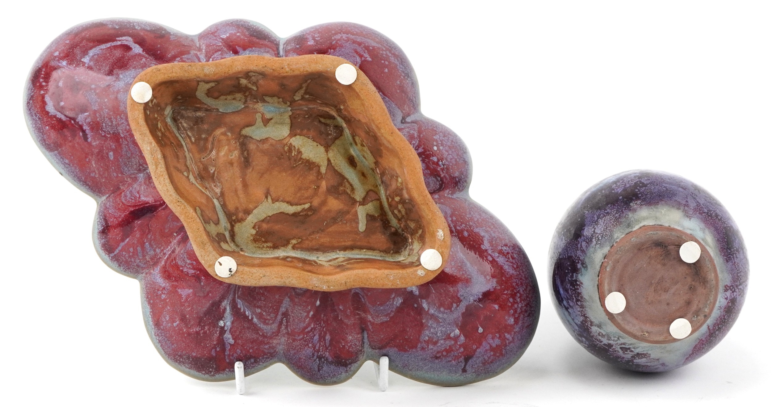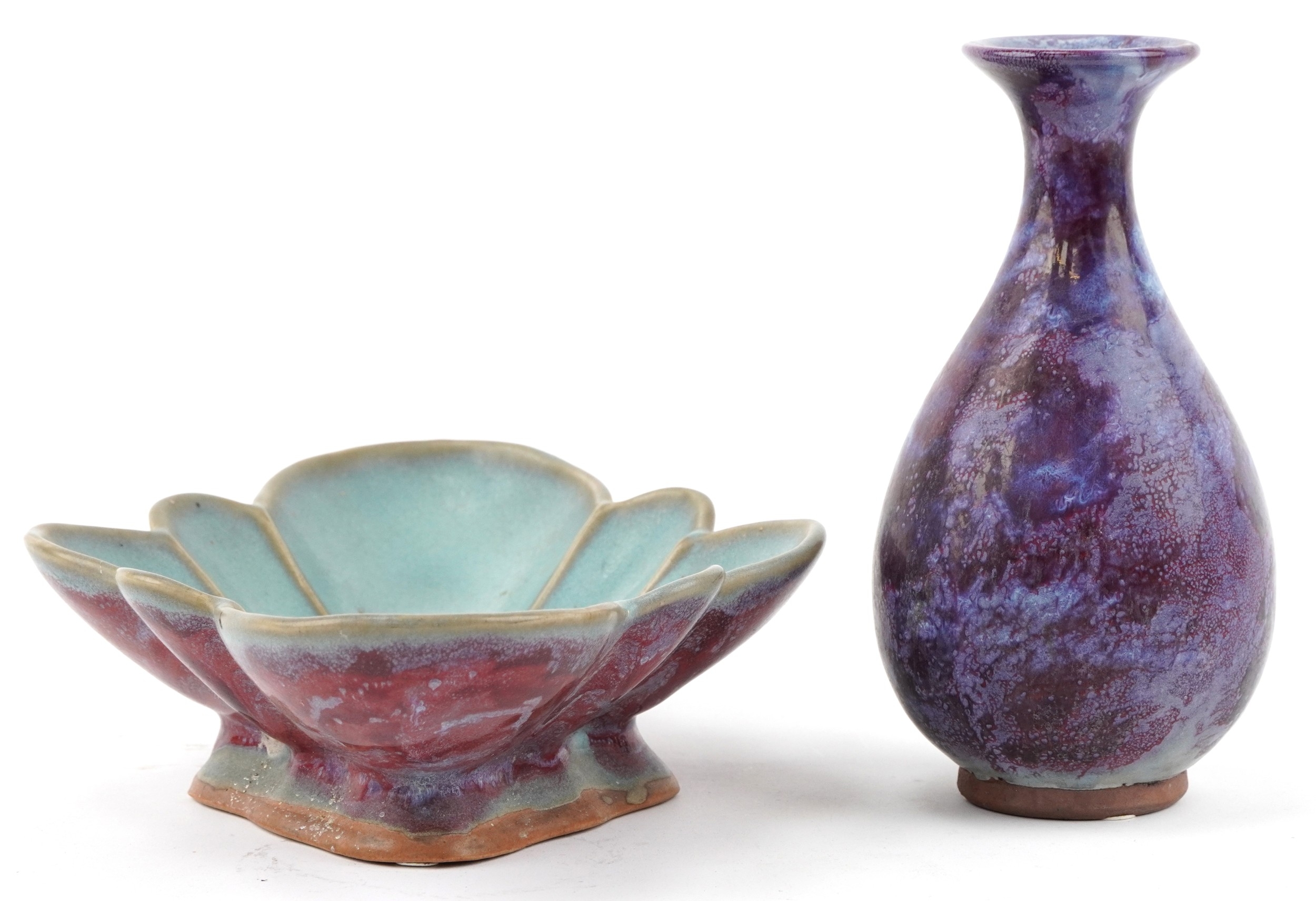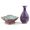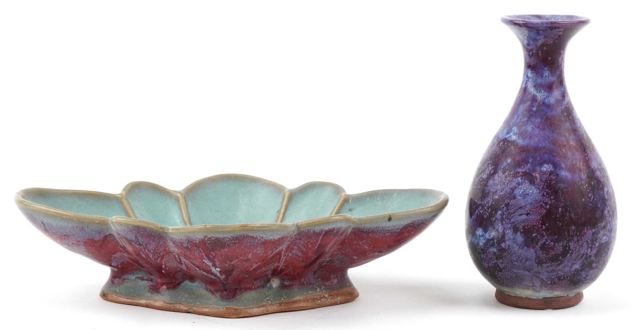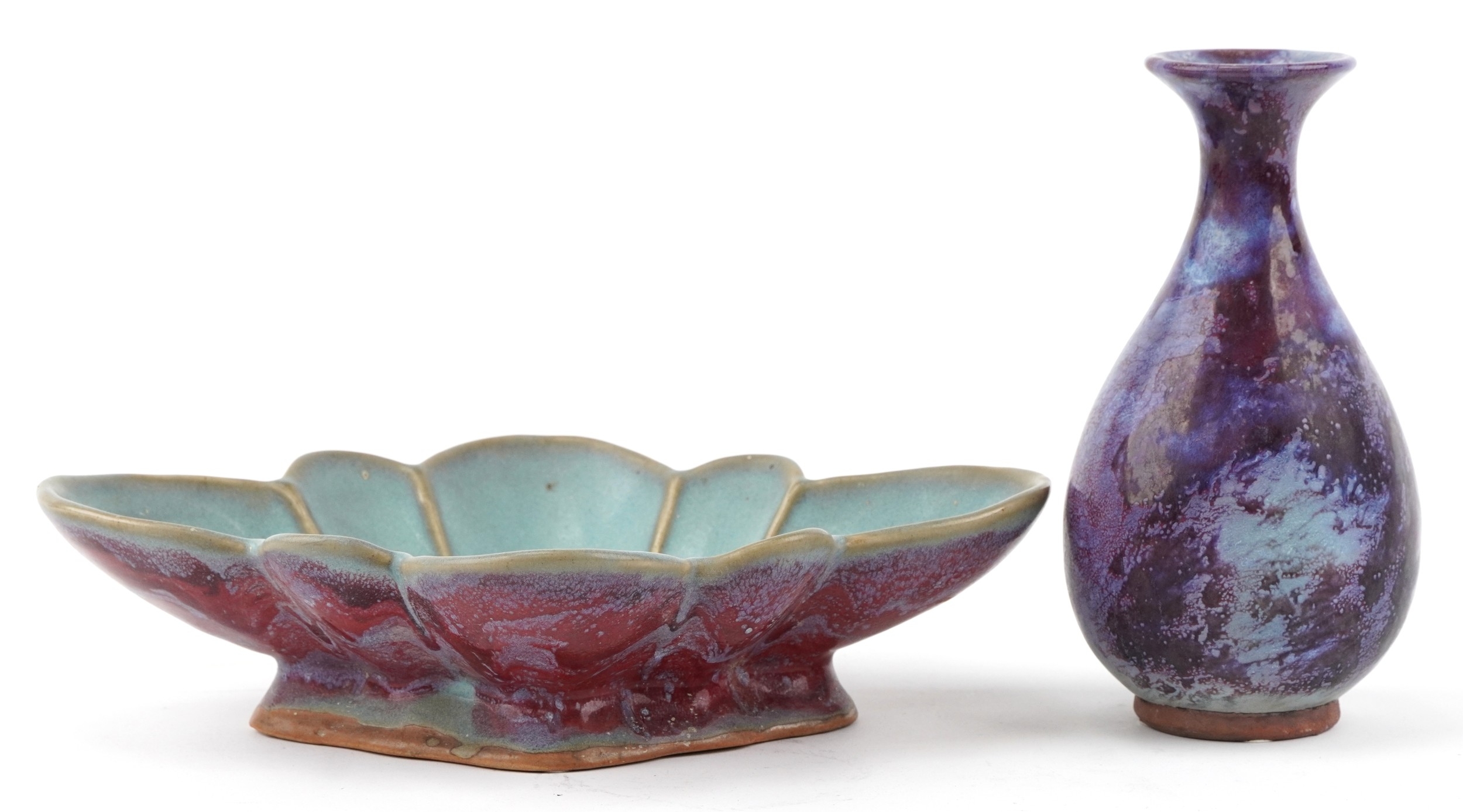 A Chinese pottery vase and similar lobed dish, 20th century, each with rich red/purple glazes, largest H-19cm