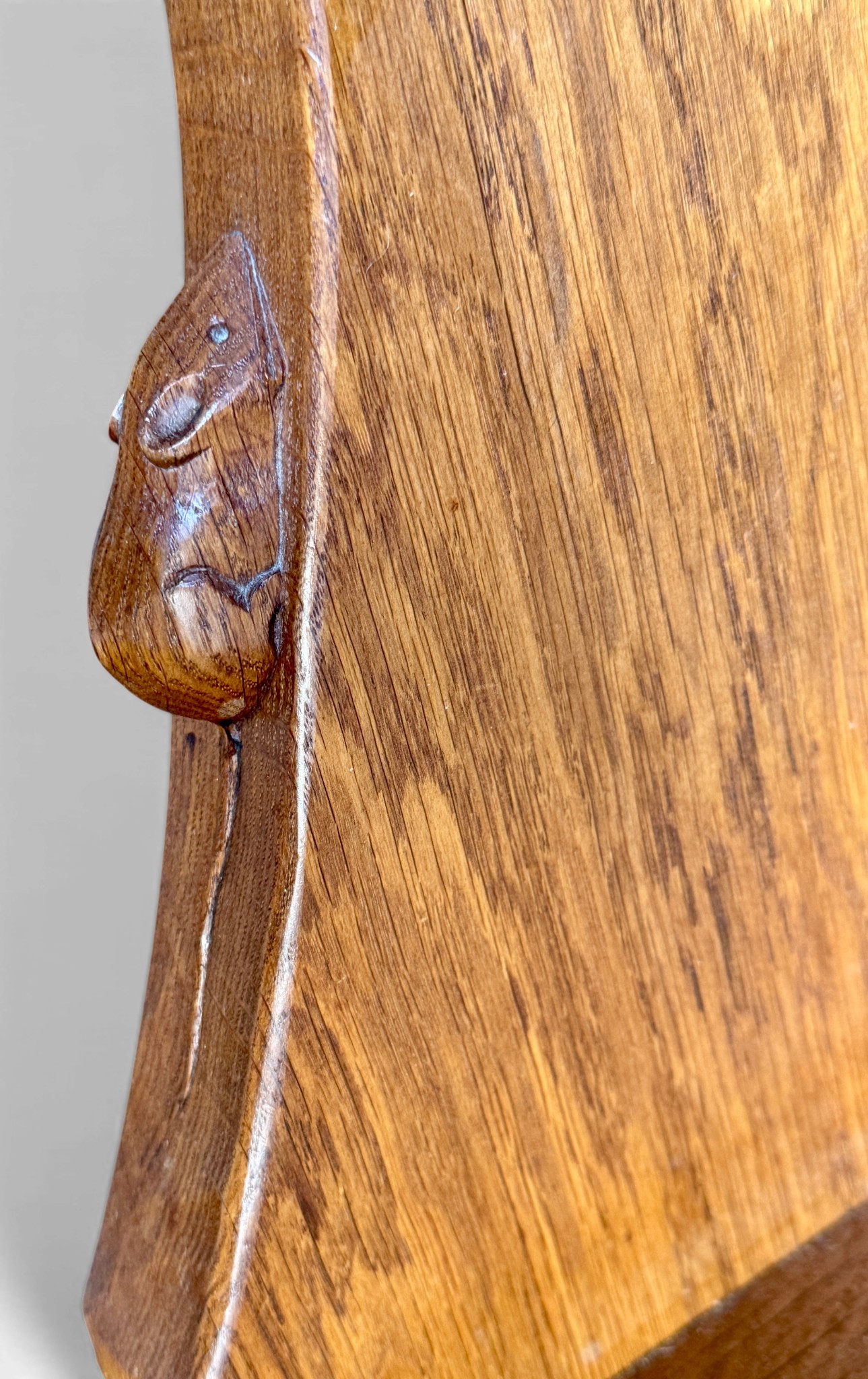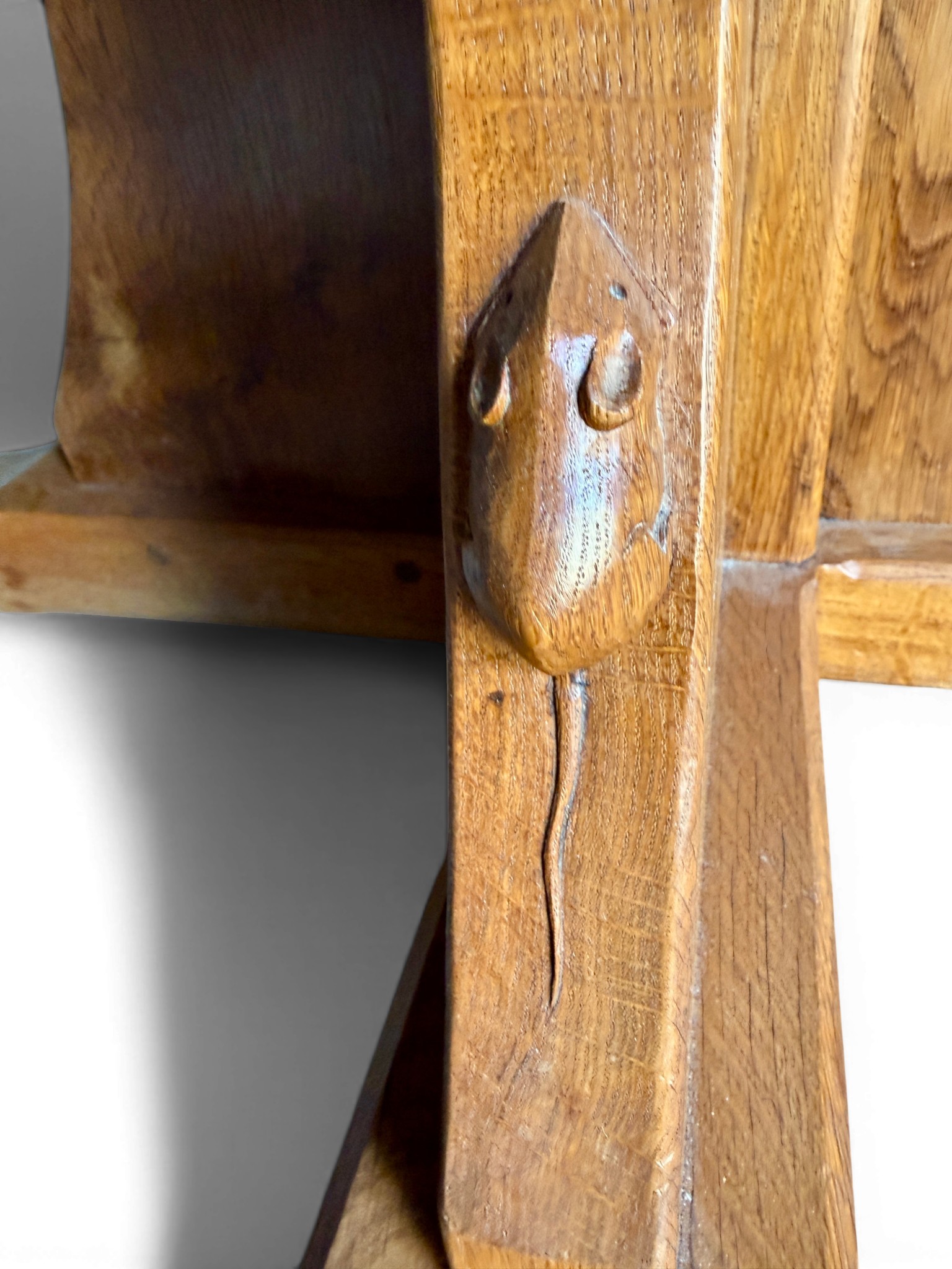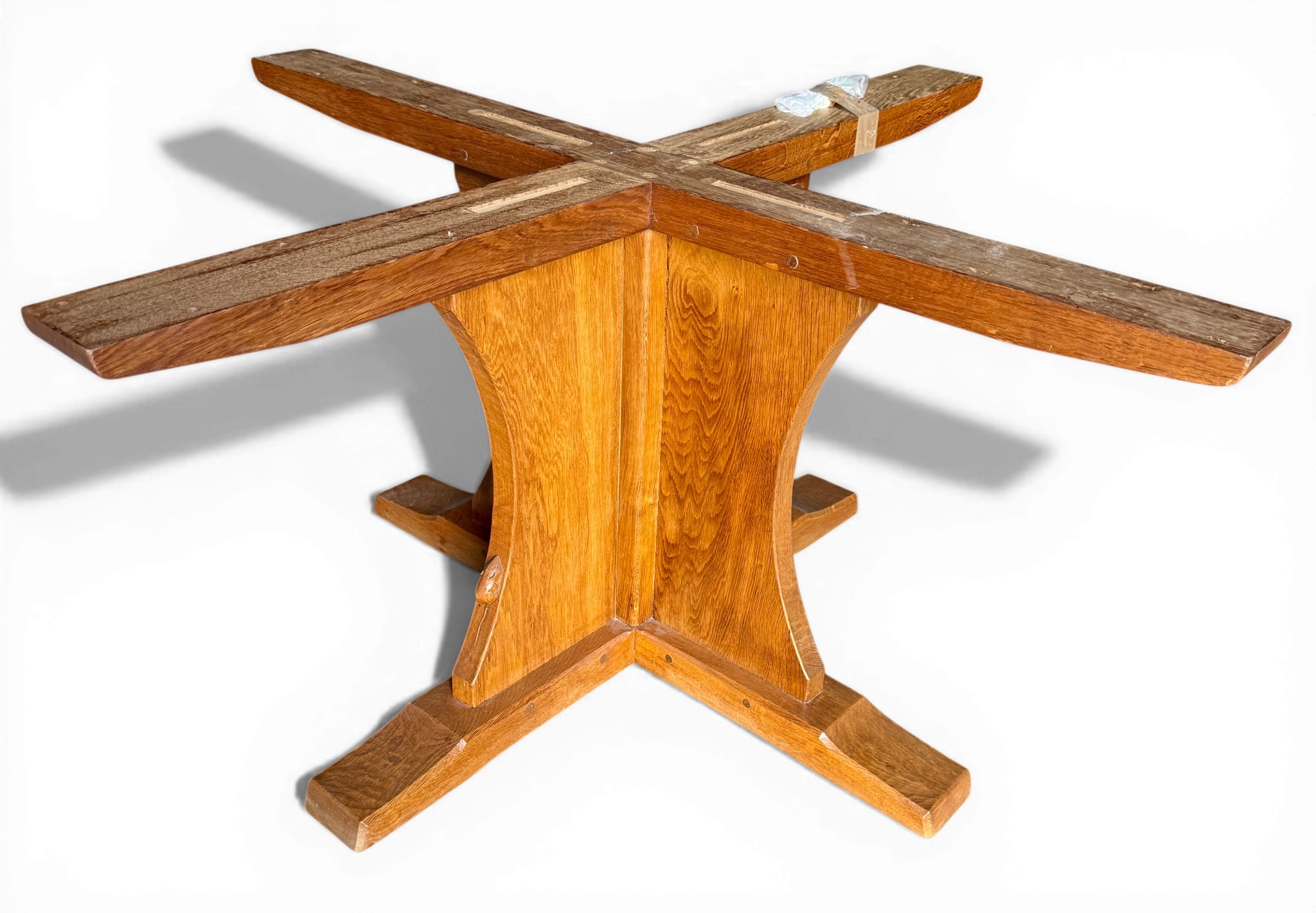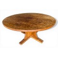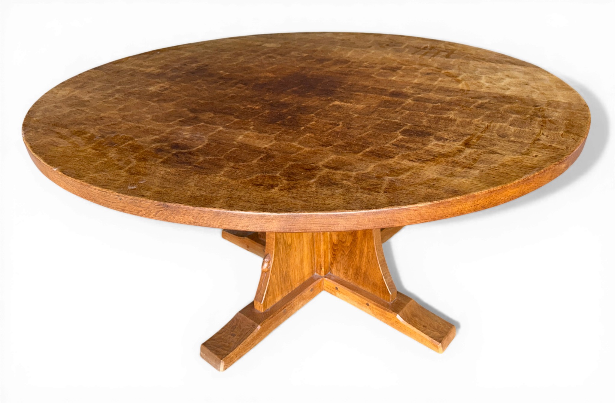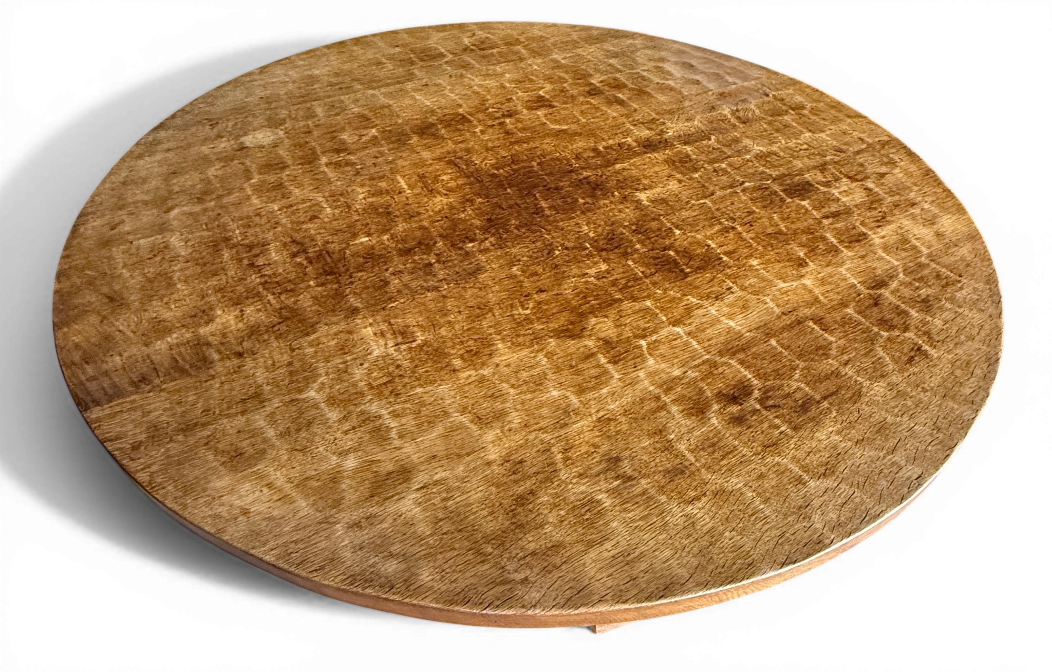 A Robert Thompson, Mouseman, 5’ circular dining table with adzed top and signature mouse. 152cm d x 74cm h.