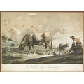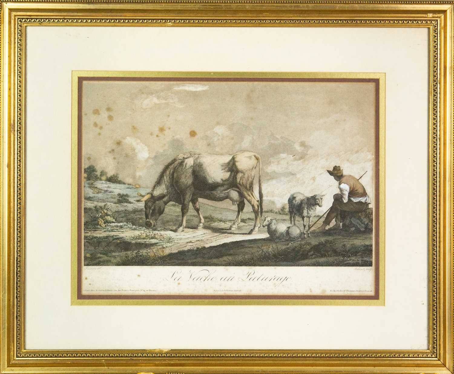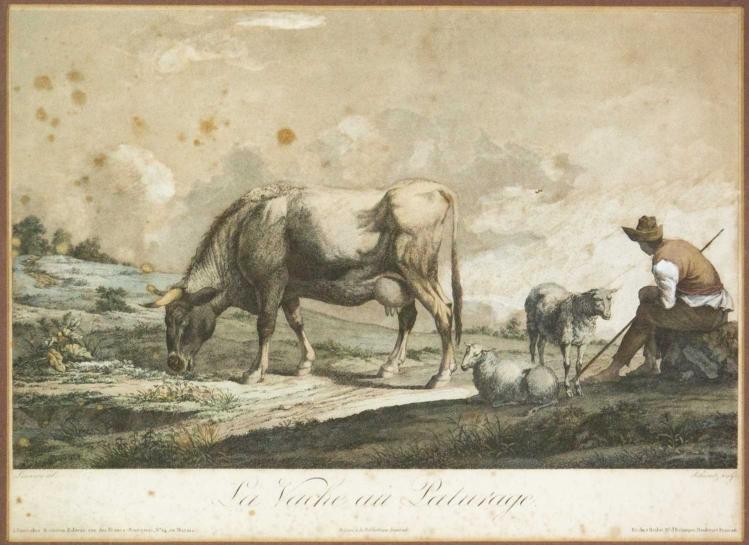A French lithograph Schwartz, after Laurenty. La Vache au Pâturage, 28 x 39cm, framed 50 x 62cm.