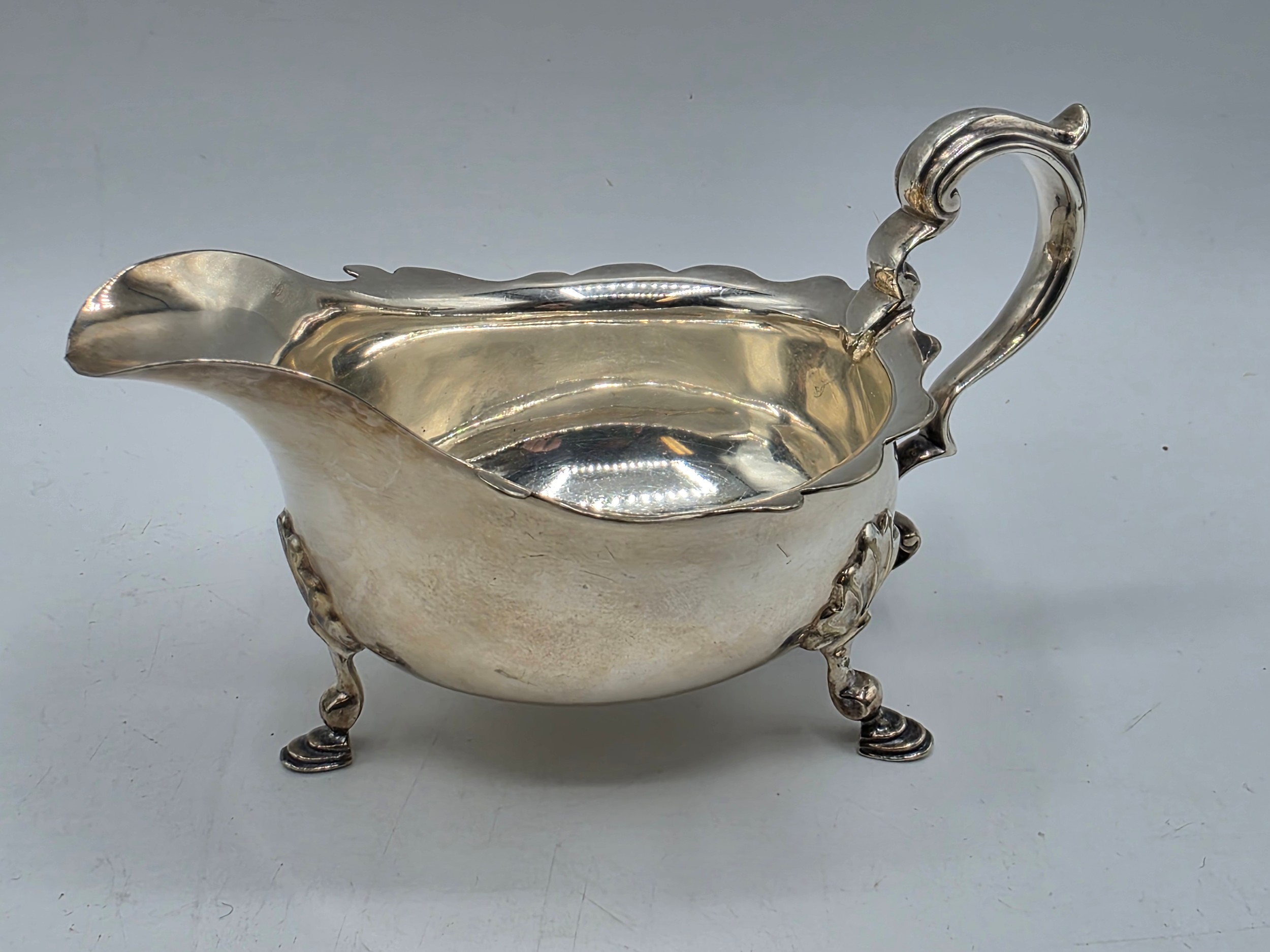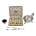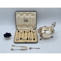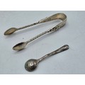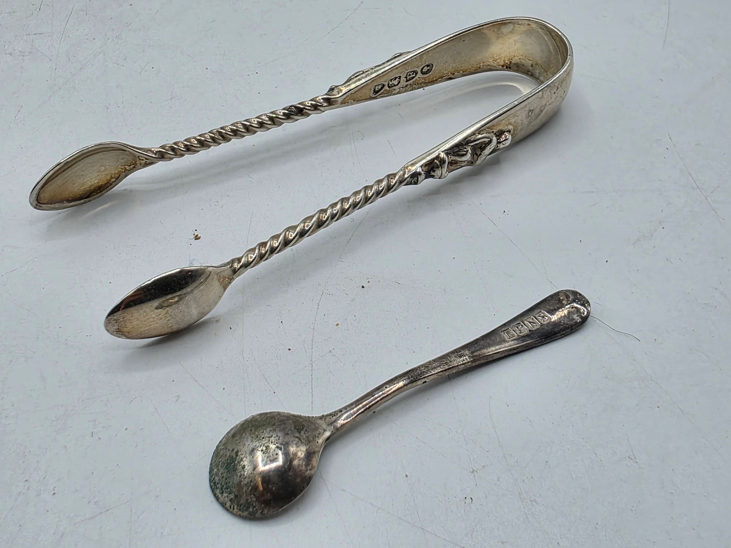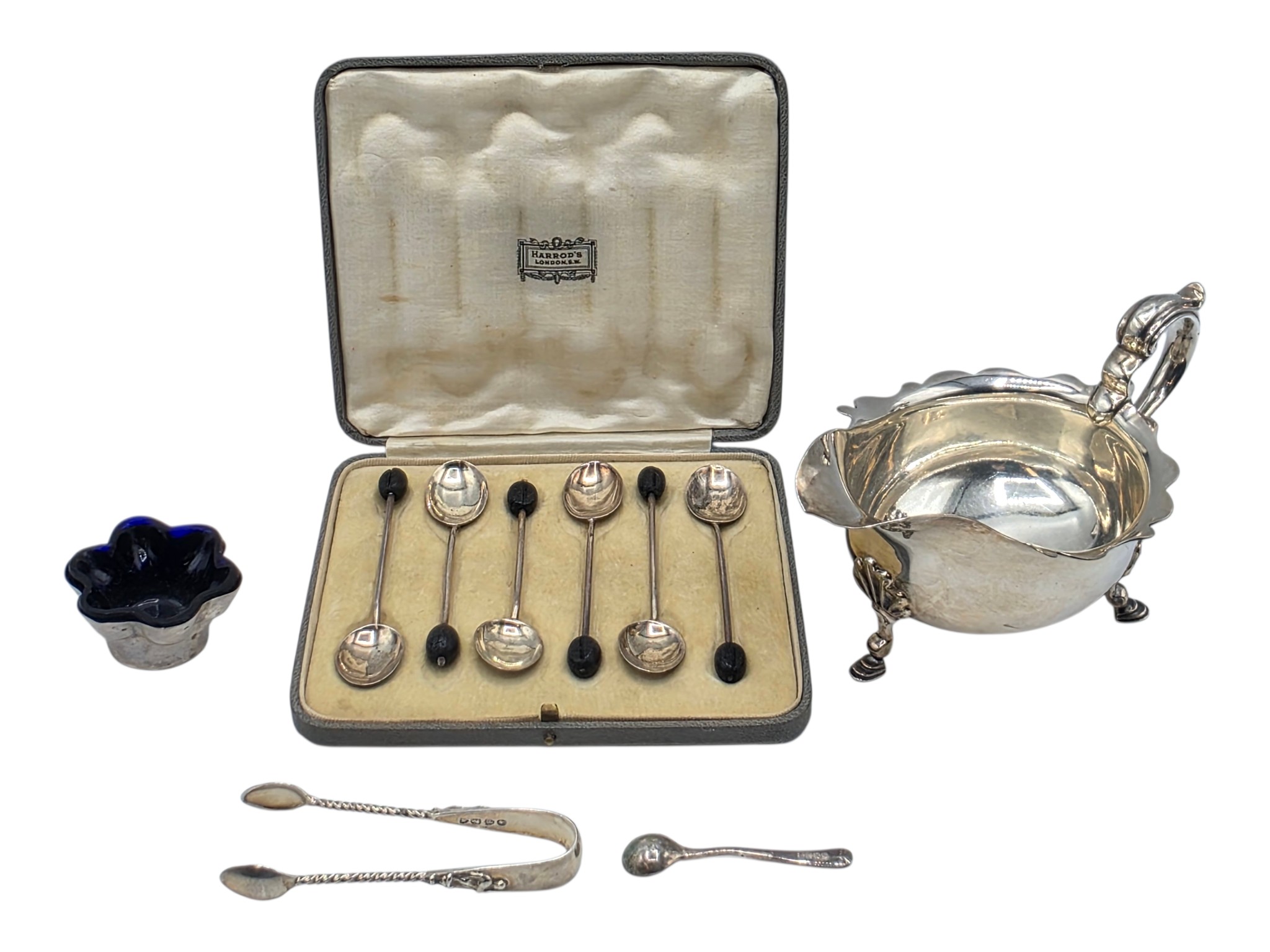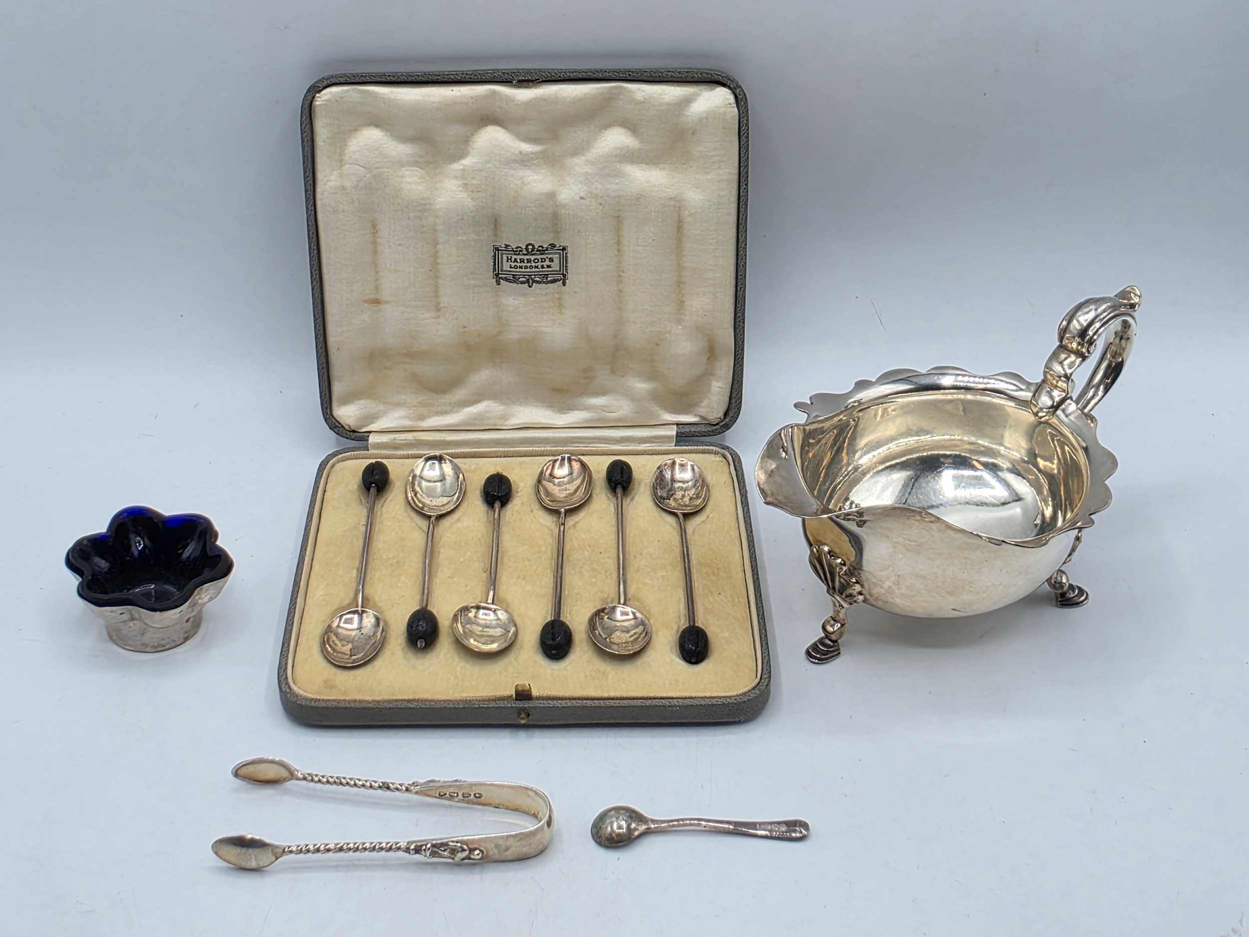 A boxed set of six sterling silver coffee spoons with finials, a pair of Victorian silver sugar tongs, silver salts with glass liner and a white metal sauce boat. Total hallmarked sterling items 66g.