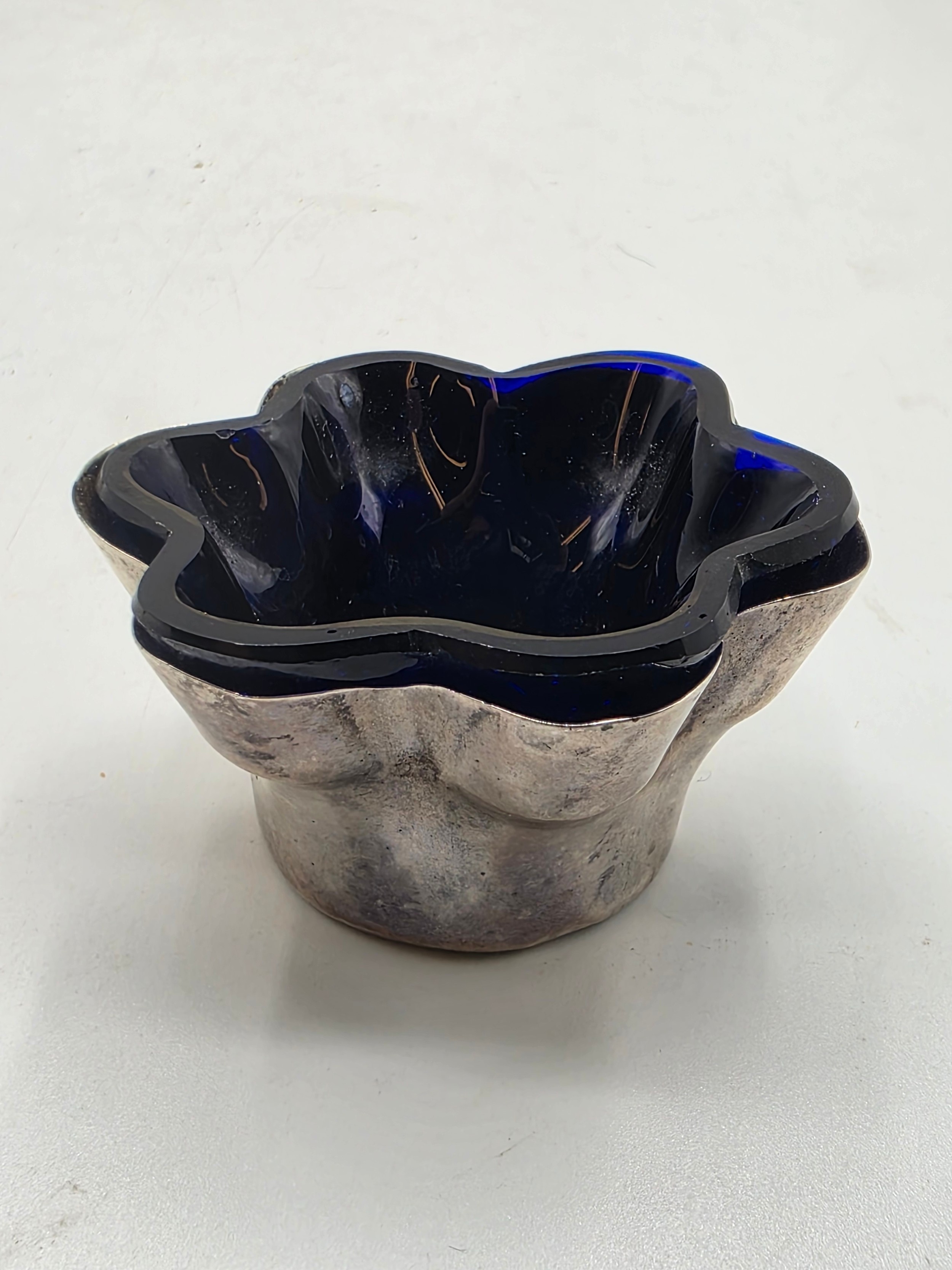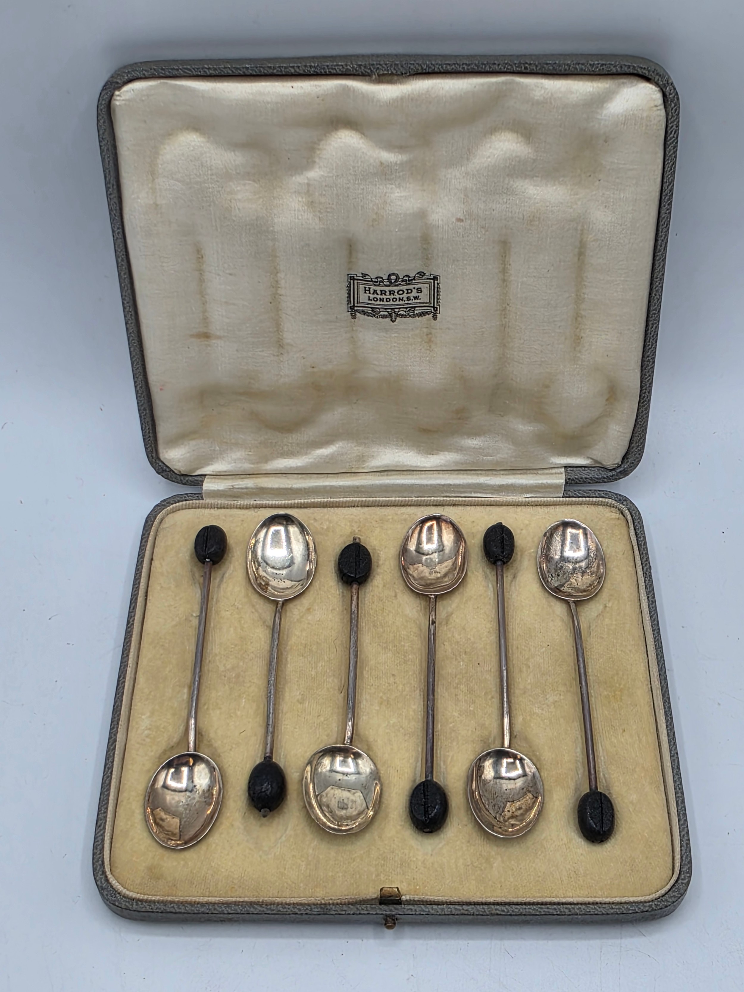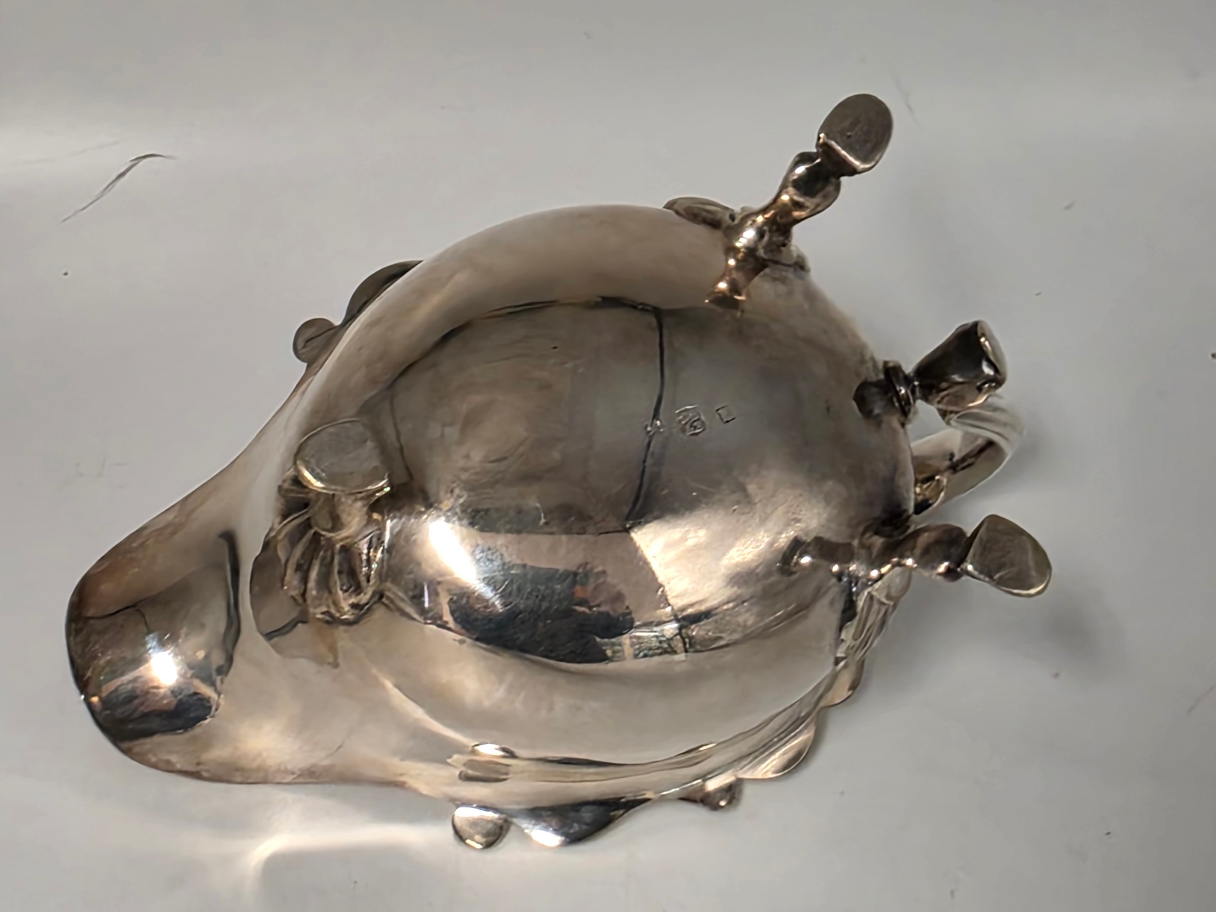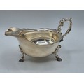 A boxed set of six sterling silver coffee spoons with finials, a pair of Victorian silver sugar tongs, silver salts with glass liner and a white metal sauce boat. Total hallmarked sterling items 66g.
