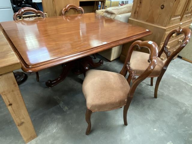 Victorian mahogany pedestal dining table 73H 145W 117D and 4 balloon back chairs