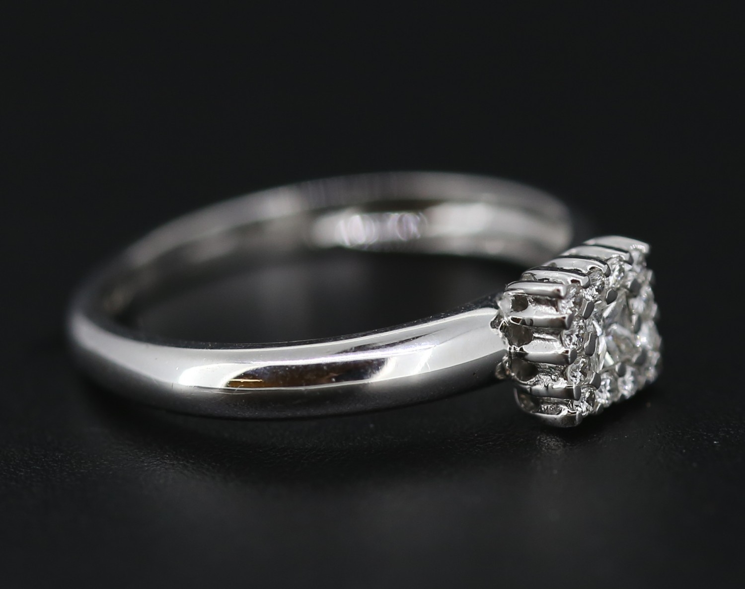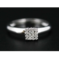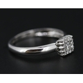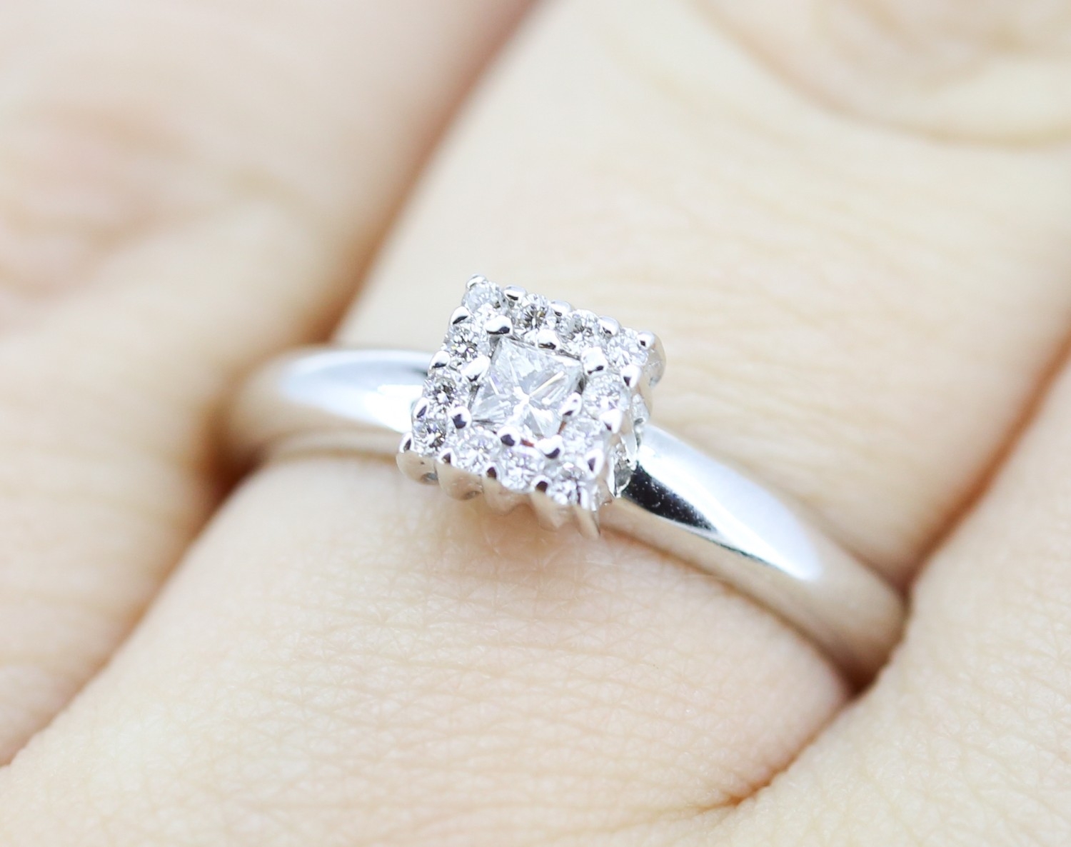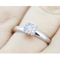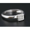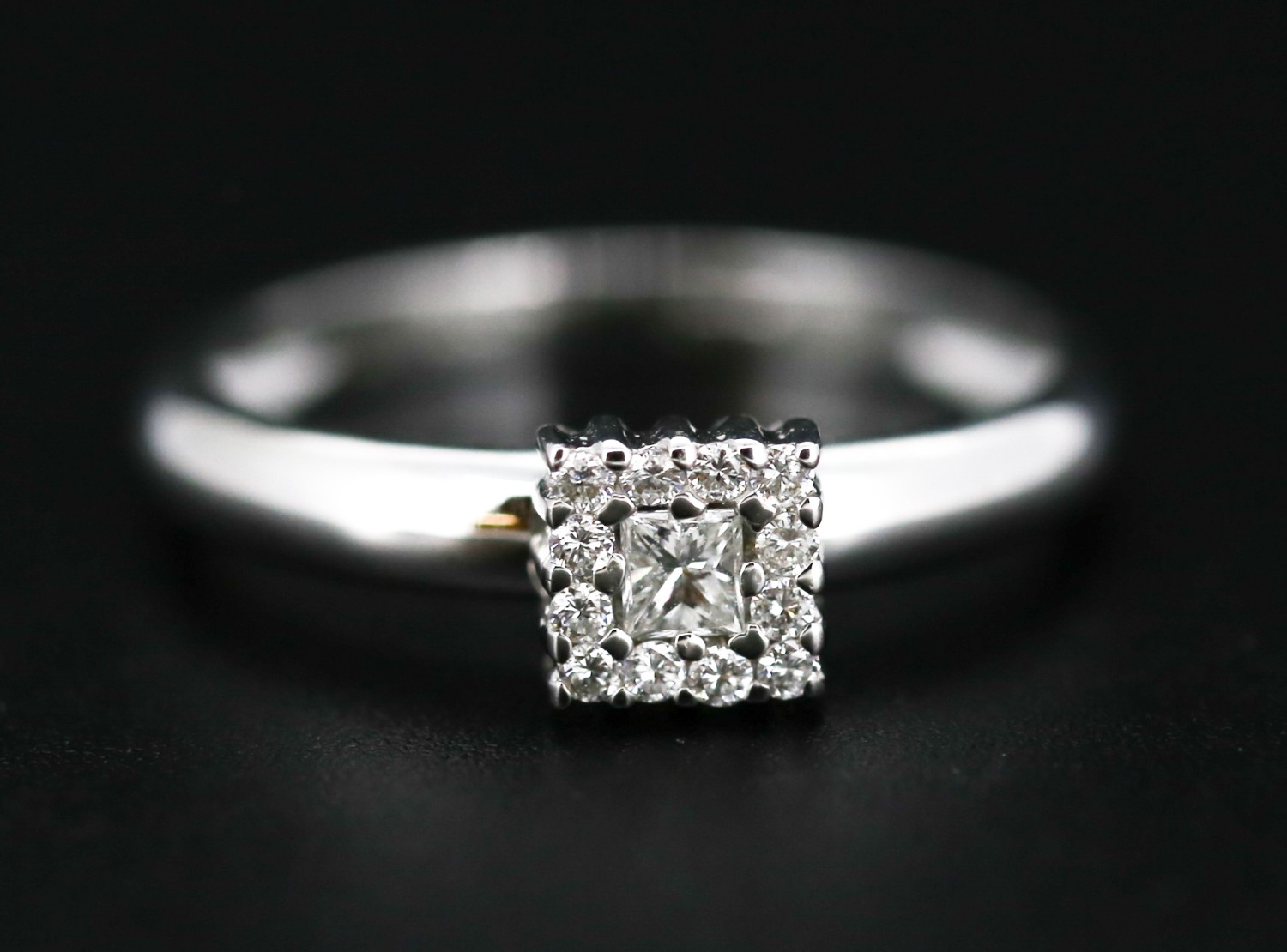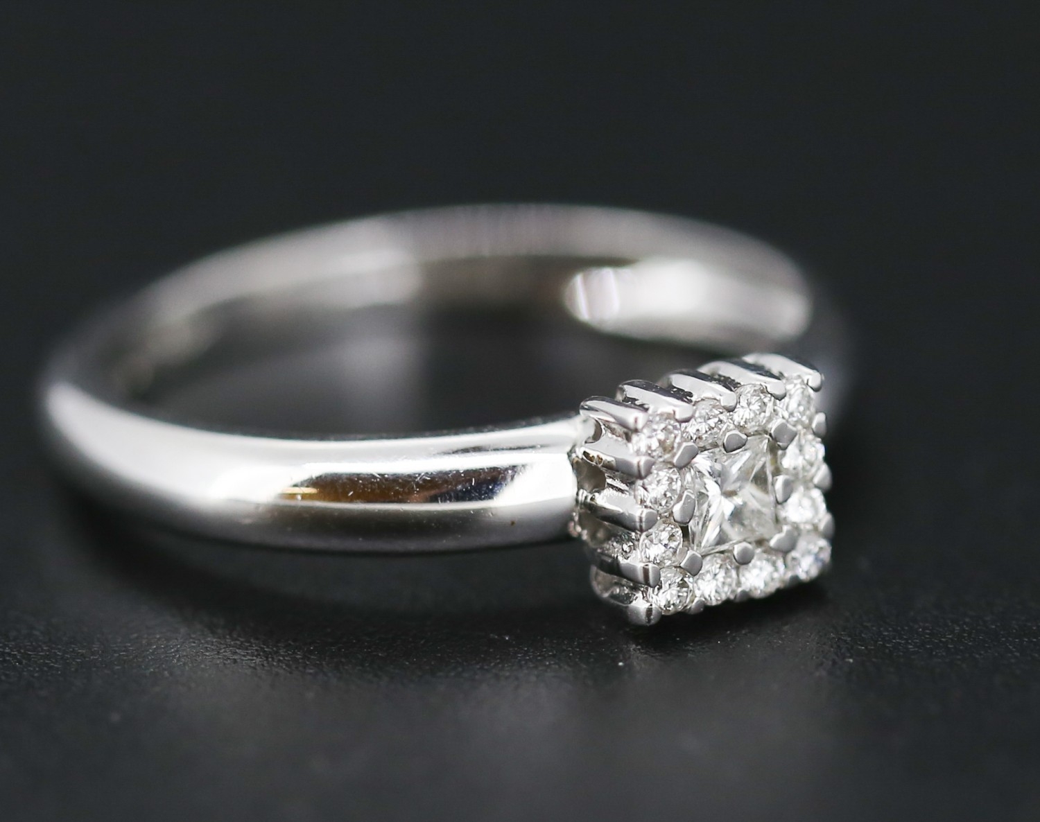 Princess Cut Diamond Centre Stone Ring with Round Cut Diamond Set Surround Mounted in 18 Carat White Gold Ring Size O
