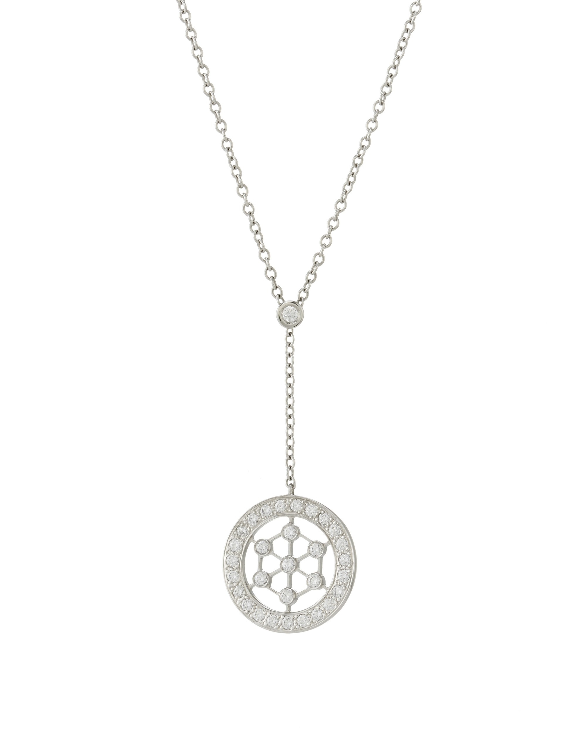 Tiffany & Co., a platinum brilliant-cut diamond Voile Lariat openwork pendant, suspended from an integral trace-link chain, signed Tiffany & Co., estimated total diamond weight 0.10ct, mount stamped PT950, length of pendant 2.9cm, length of chain 41cm, 3.5g