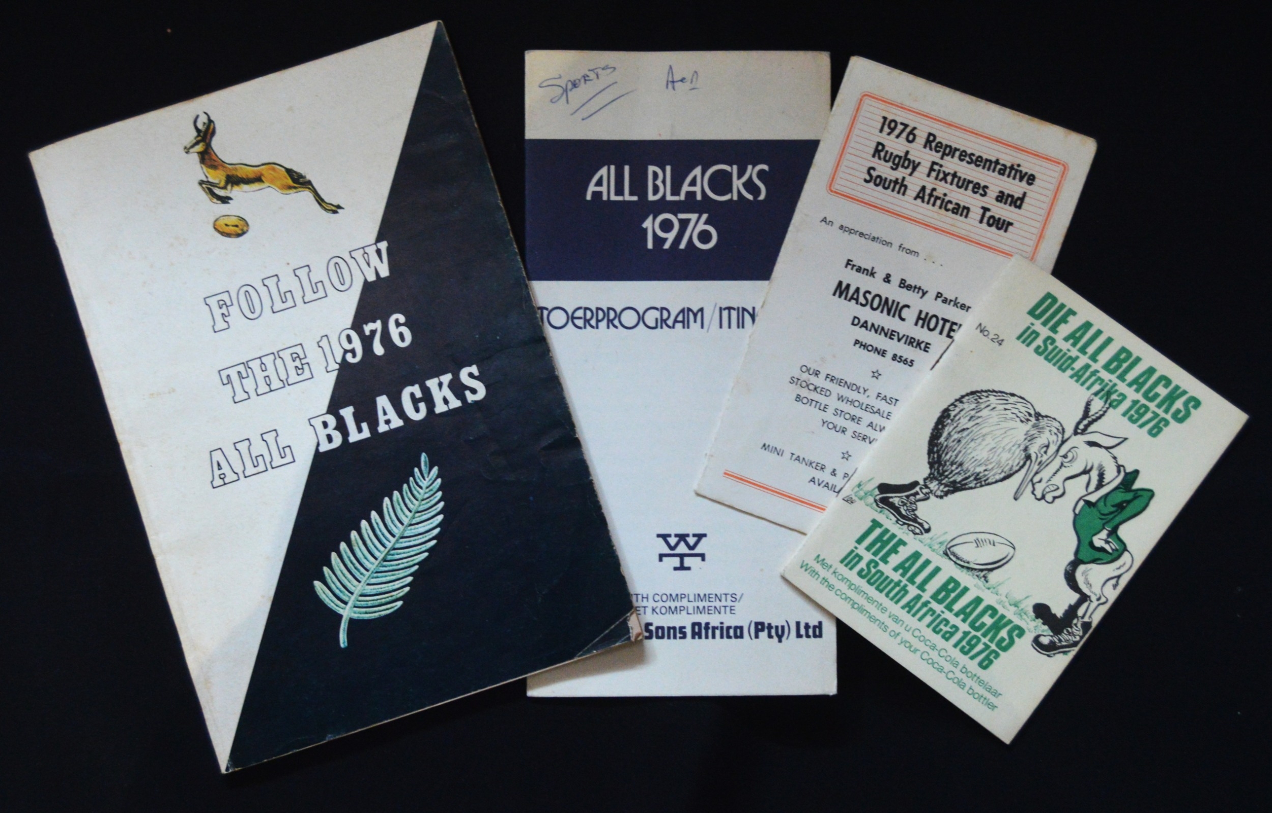 1976 in SA, NZ Rugby Itineraries and Booklet (4): Really packed and interesting 96pp softback A5 'Follow the 1976 All Blacks', plus fine Coca Cola itinerary of the tour and two others. Lovely lot, G/VG