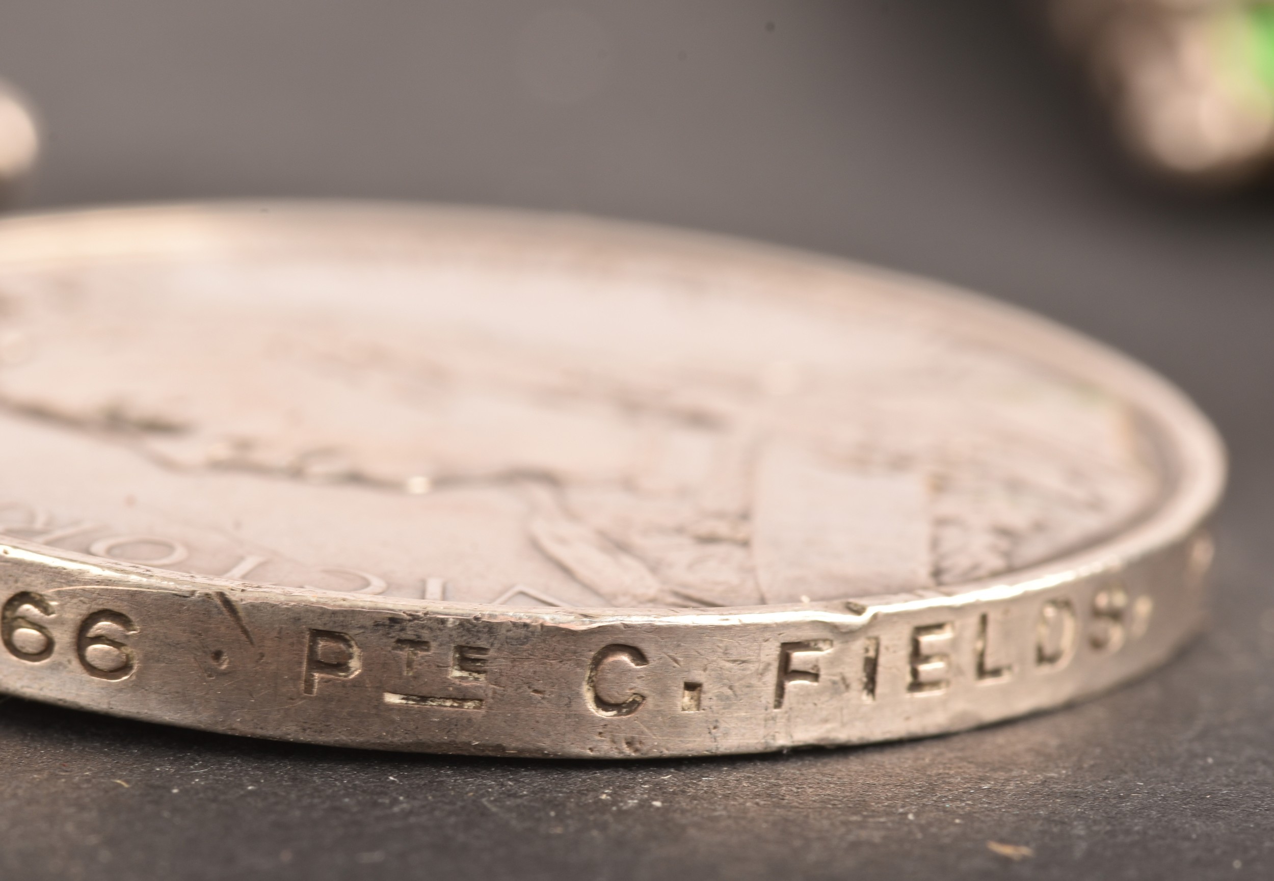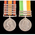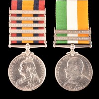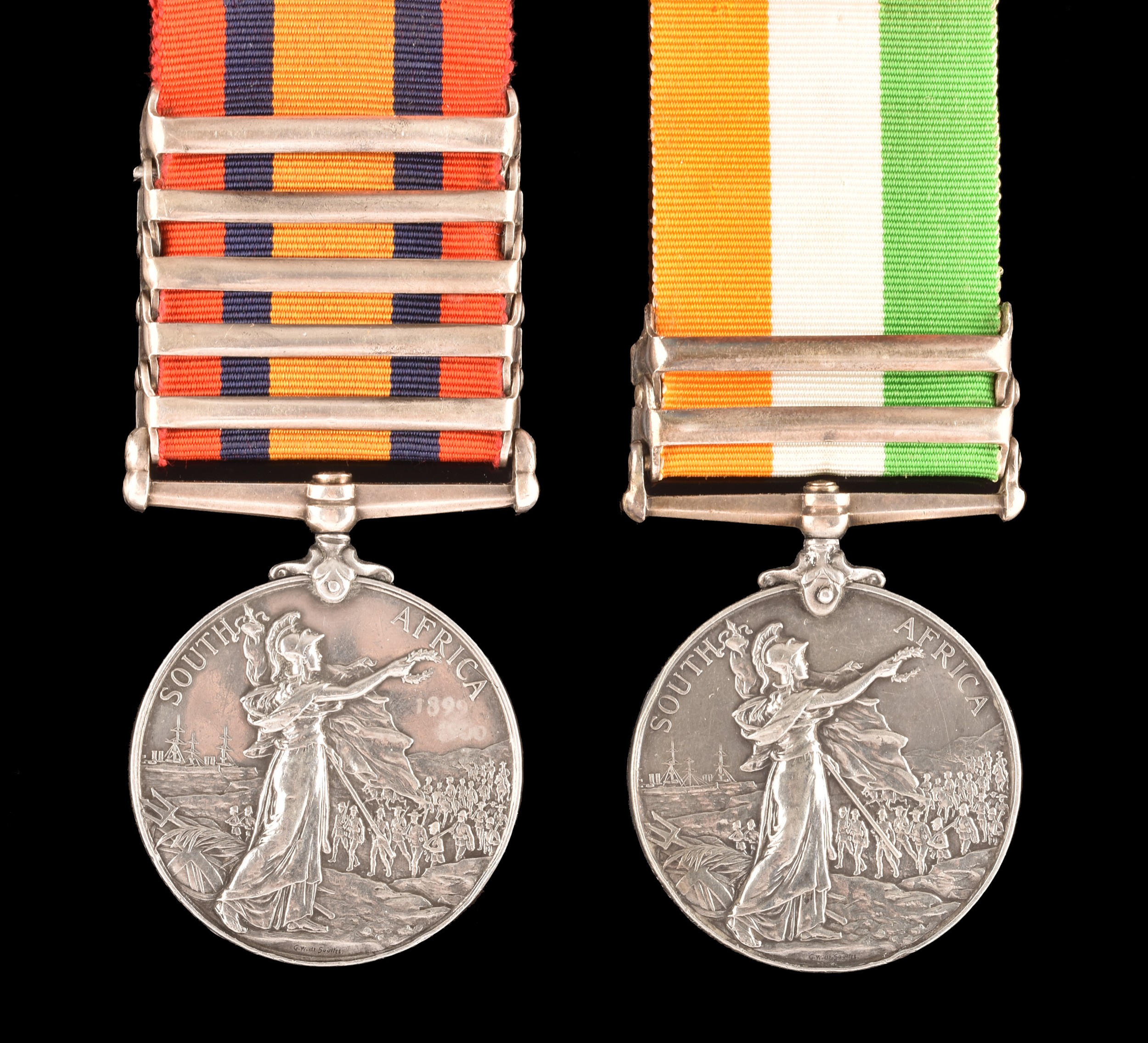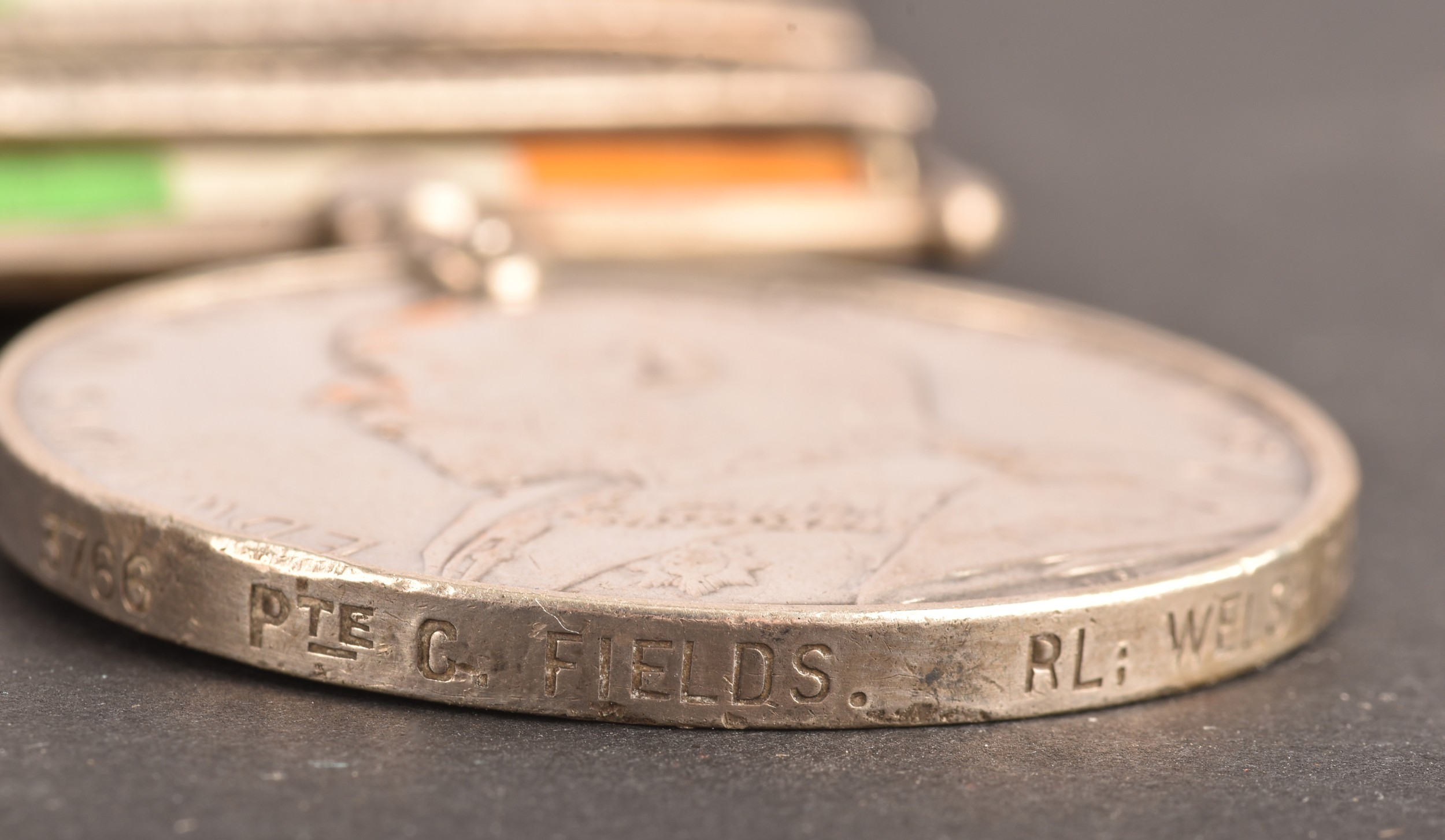 A Boer War medal pair awarded to: 3766 Private. C. Fields, Royal Welsh Fusiliers. Comprising: a QSA Queen’s South Africa medal with 5 clasps Cape Colony, Tugela Heights, Relief of Ladysmith, Transvaal, Orange Free State (3766 Pte. C. Fields, R. Welsh Fus:); and a KSA King's South Africa medal with 2 clasps South Africa 1901 and South Africa 1902 (3766 Pte. C. Fields, Rl Welsh Fus:).