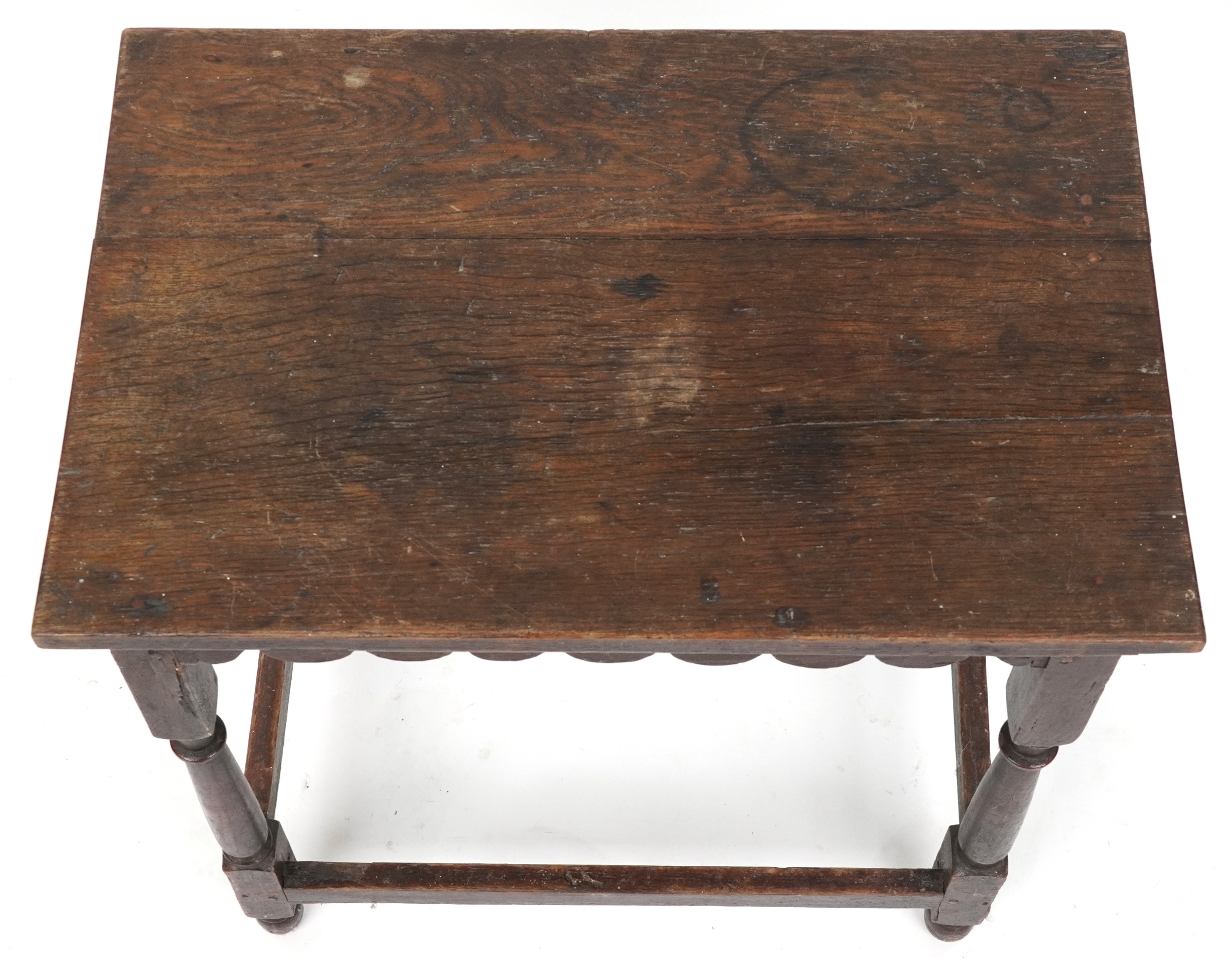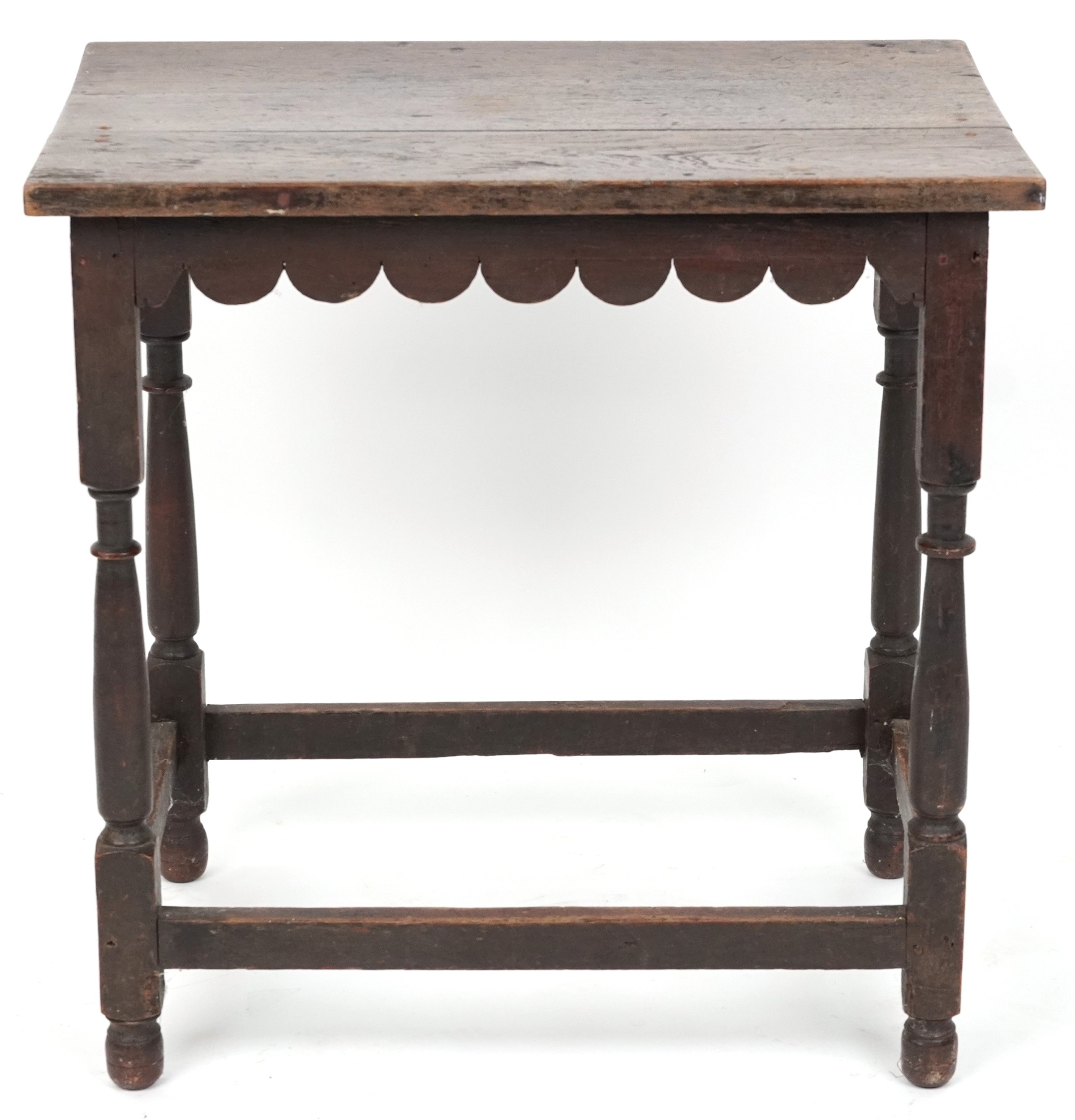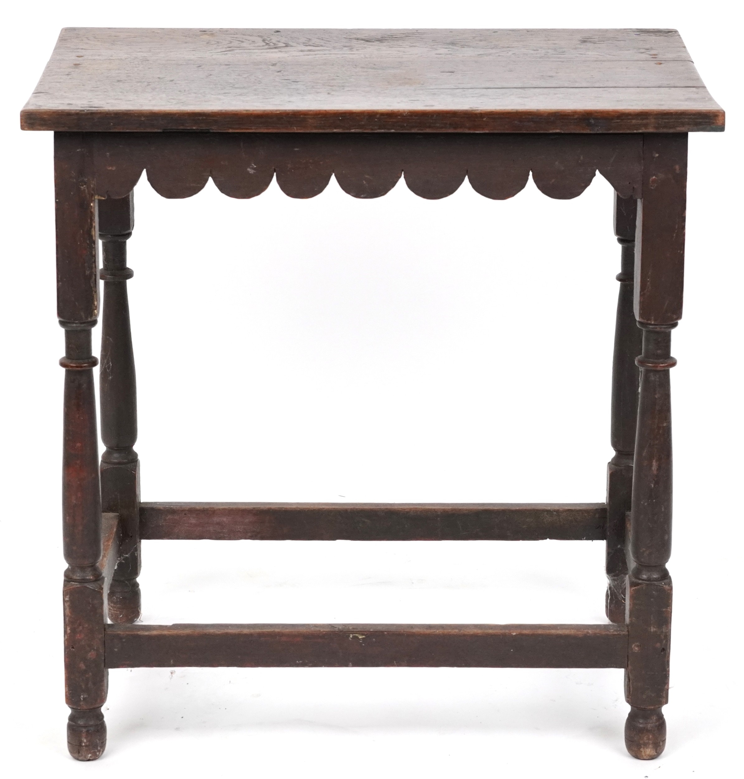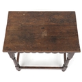 A Victorian oak rectangular side table raised on turned and block legs united by stretchers, 62cm H x 61cm W x 40cm D.