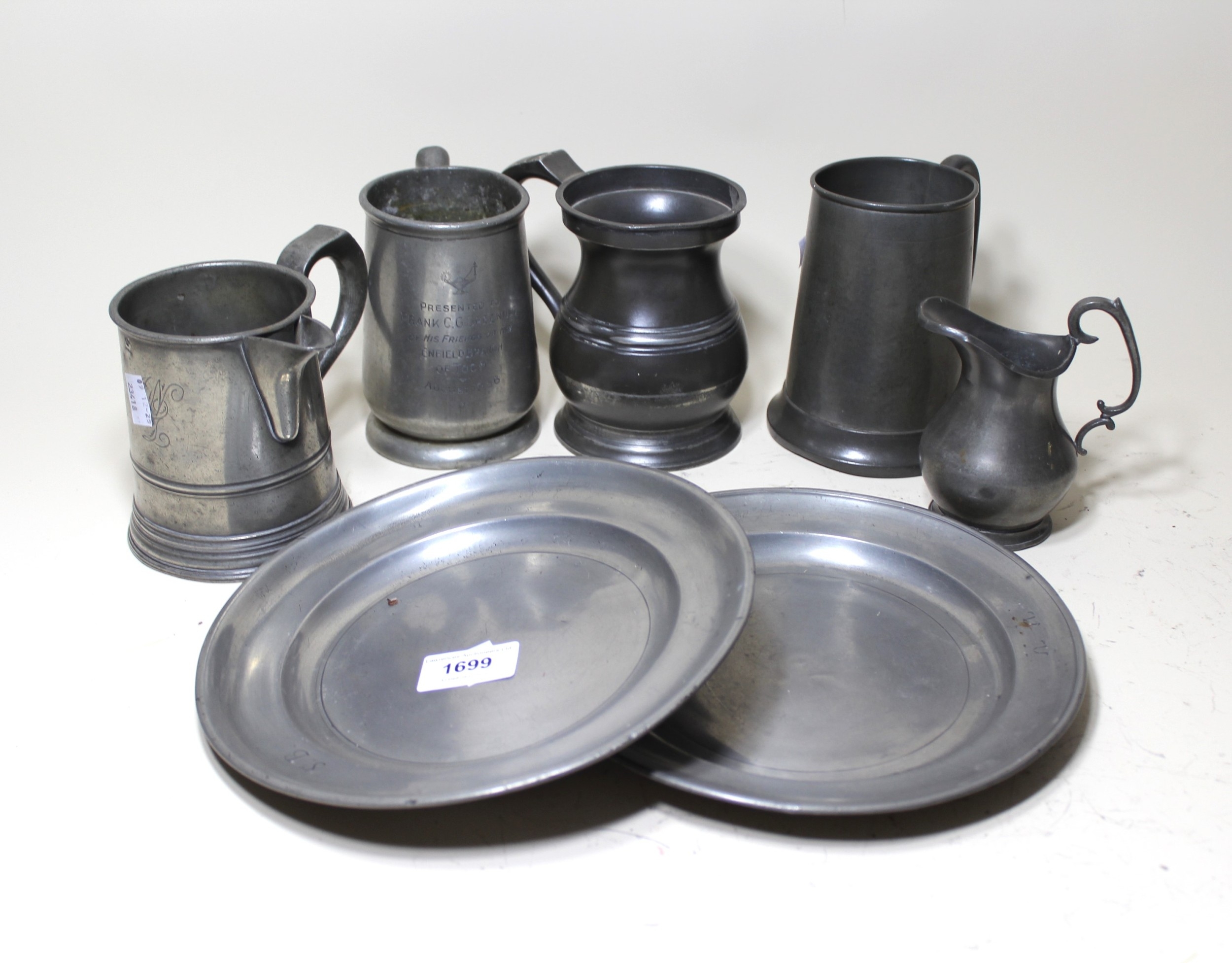 Two 18th Century pewter plates, 22cm diameter, together with three pewter tankards and two pewter jugs