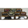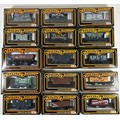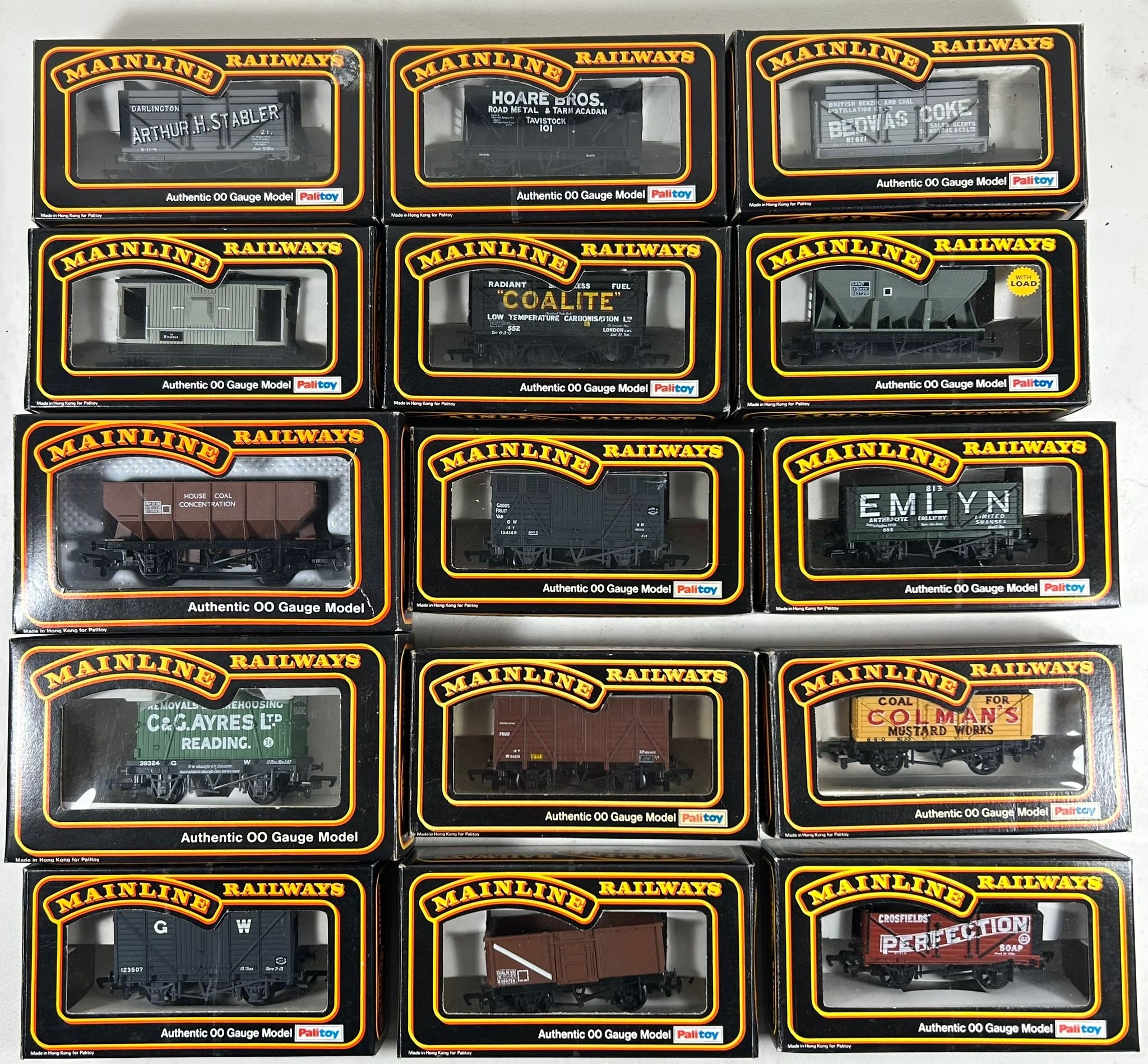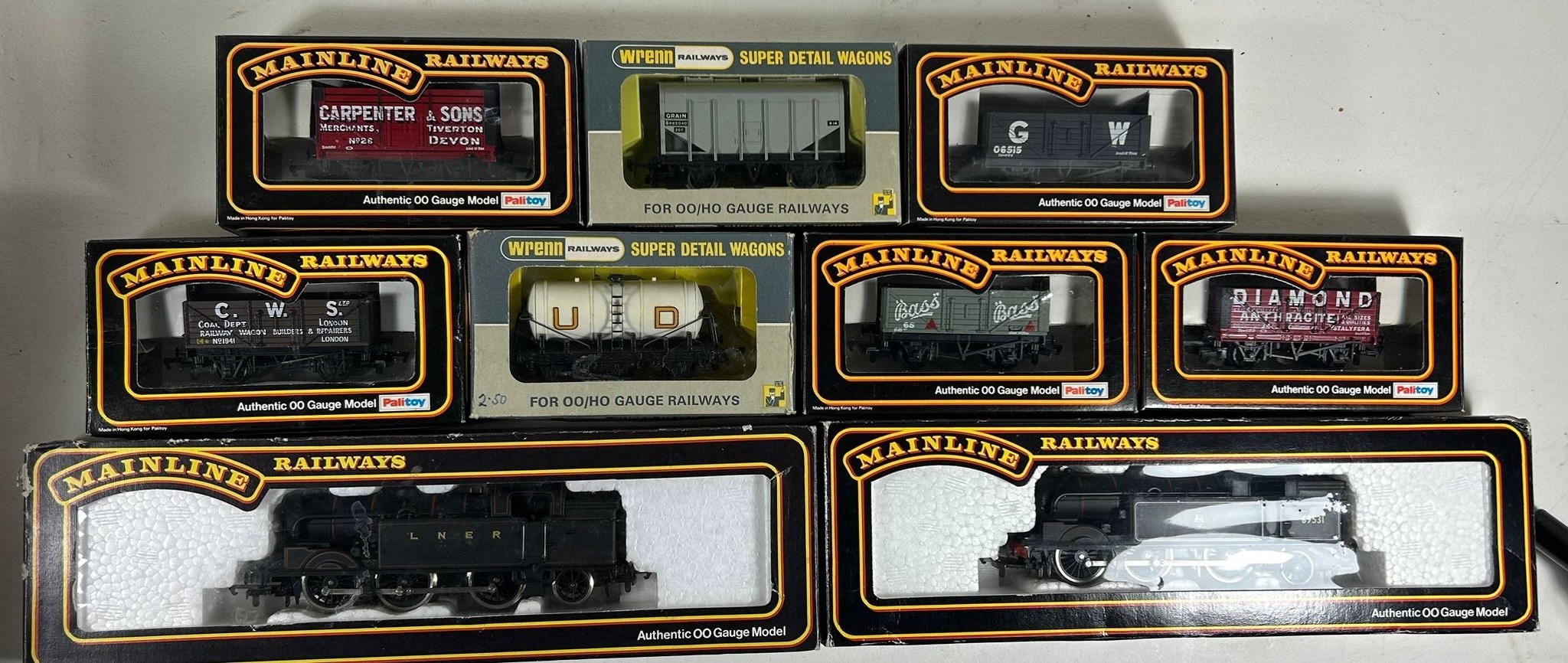 A quantity of Mainline etc OO Railway. 2 Class N2 0-6-2 tank locomotives, an un-numbered example in LNER livery and a BR example 69531. Plus 20 various Mainline freight wagons including Private owners, hopper, covered vans, Conflat with a container and a brake van etc. Plus 2 Wrenn - United Dairies 6 wheel tank wagon and a bulk grain wagon. All boxed, minor wear. Contents VGC. (24). £80-100