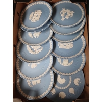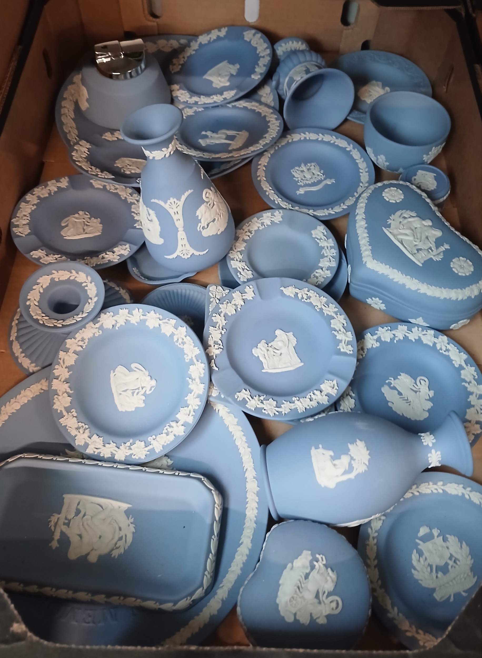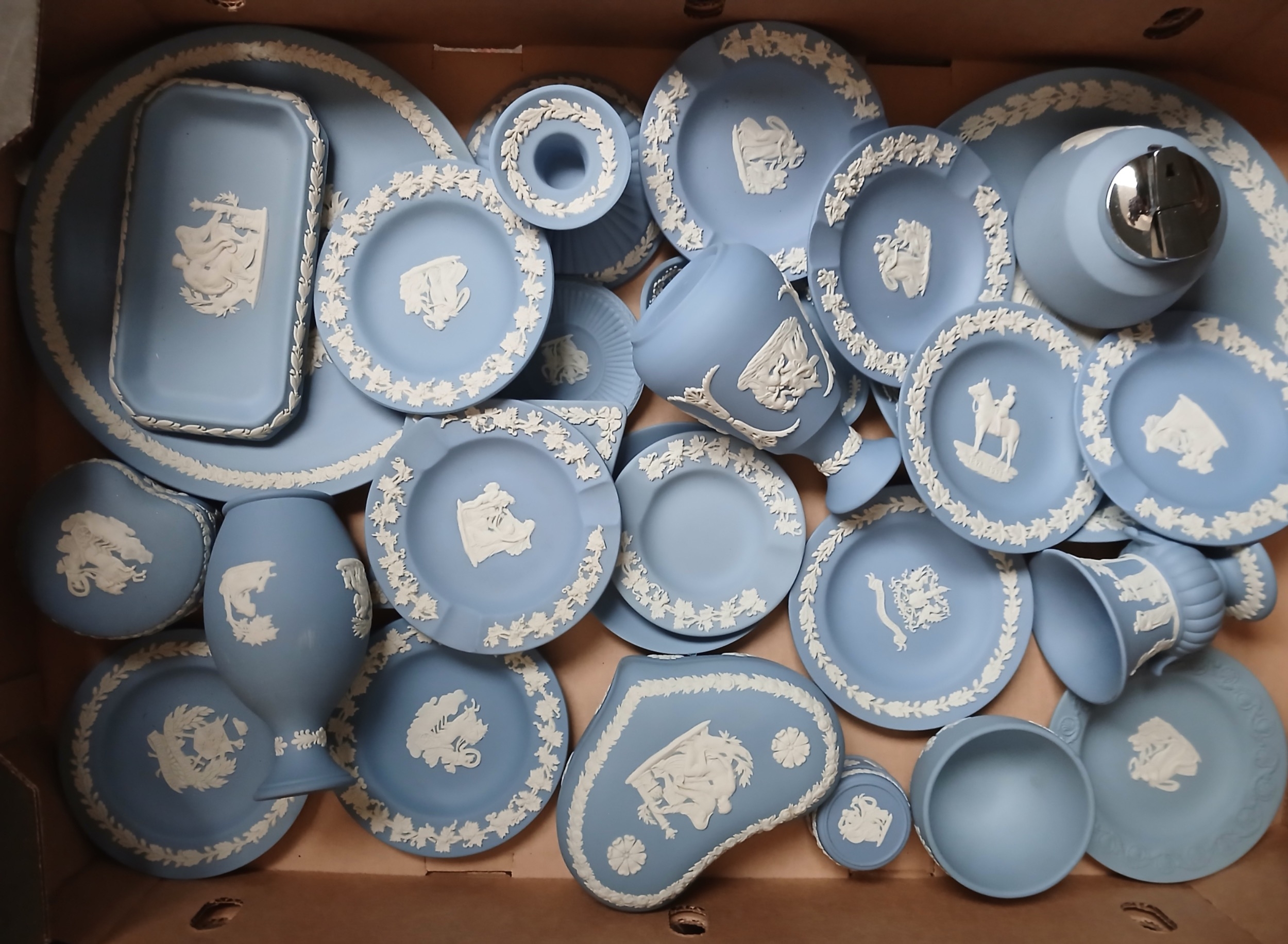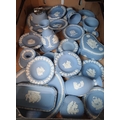 A box of assorted blue Wedgwood Jasperware.