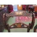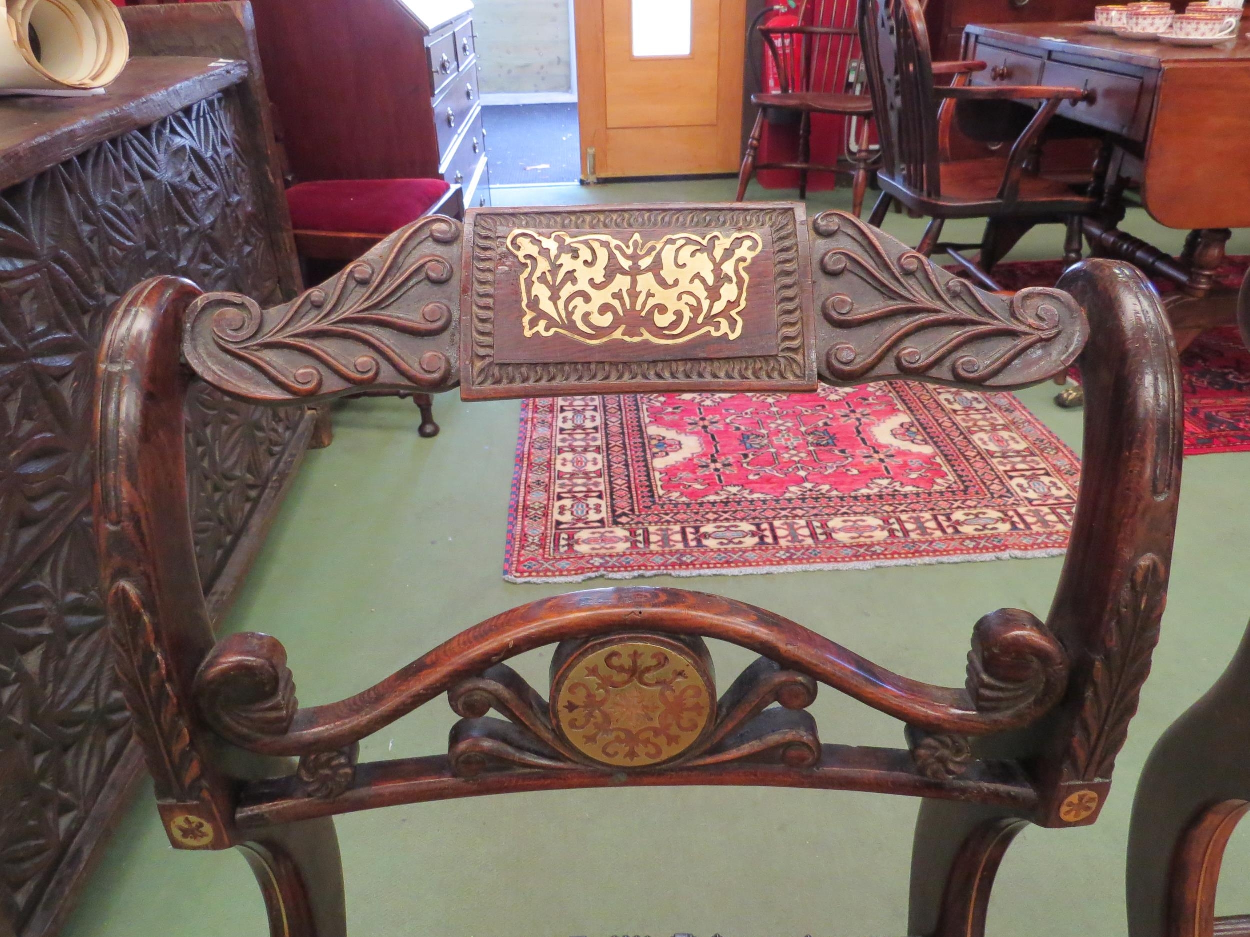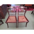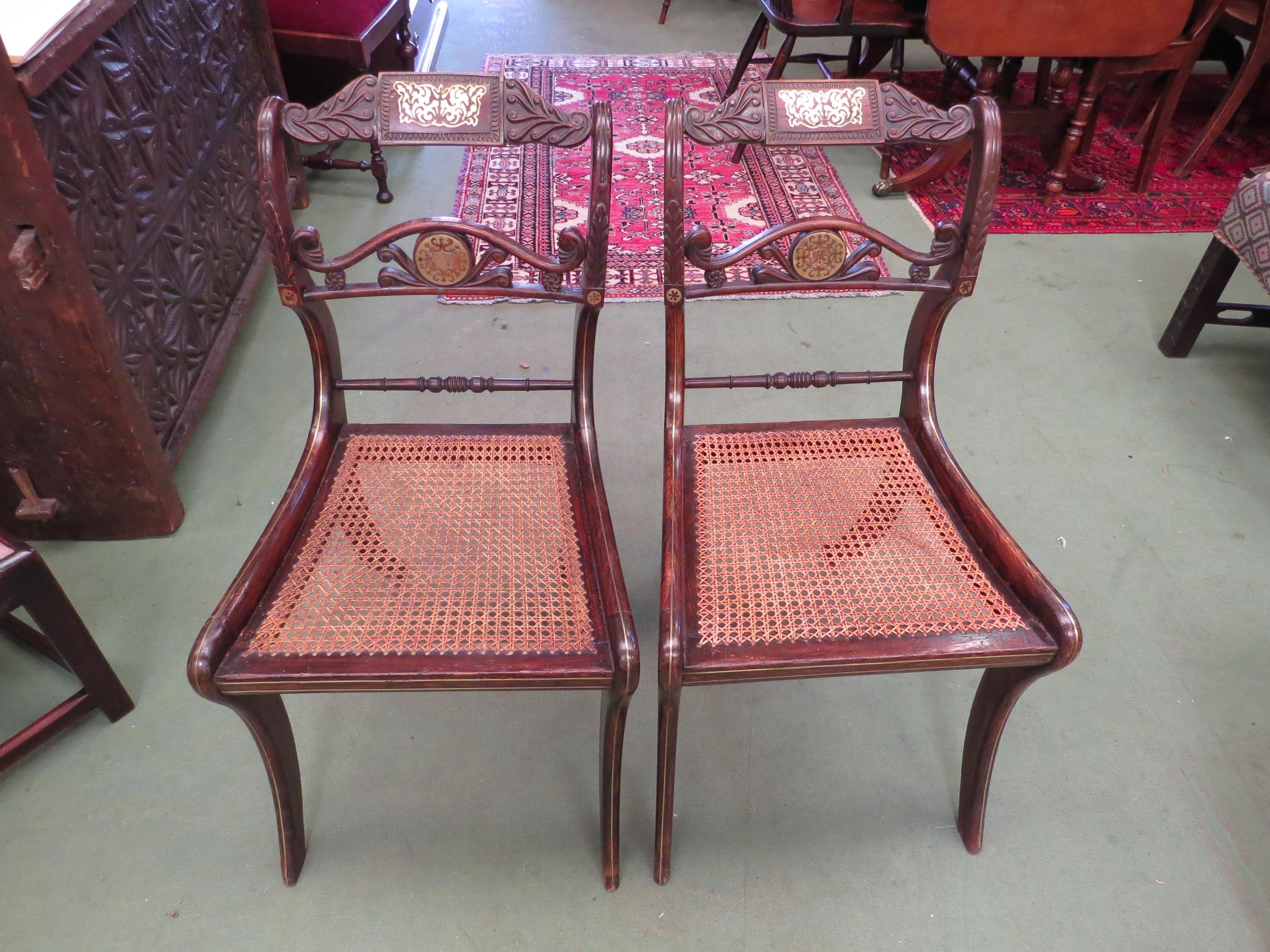 A pair of Regency hall chairs, simulated rosewood with brass inlay, carved back rest, cane seats on sabre front and back legs