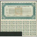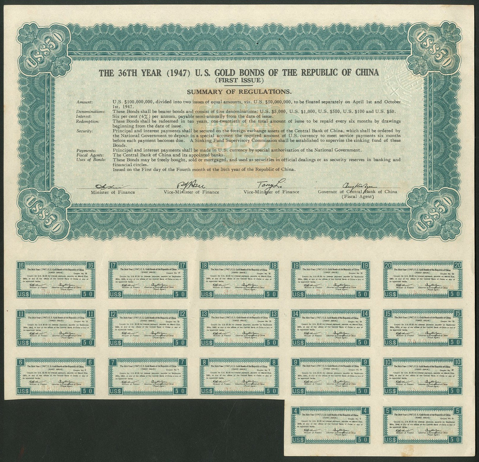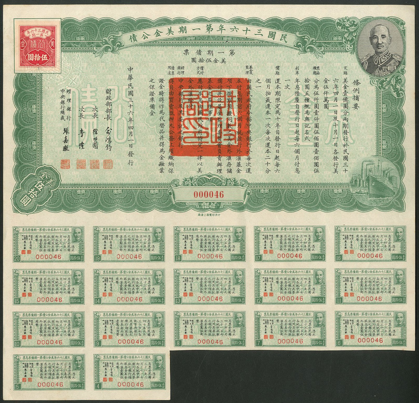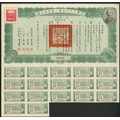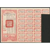 China: 1947 36th Year U.S. Gold Bonds, $50 bond, first issue, #000046, Chiang Kai-shek top right, red adhesive label top right, green, text in Chinese with English on the reverse, with coupons. $100,000,000 was authorised in two equal issues but we are yet to see any of the second. EF and rare.