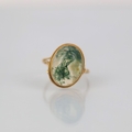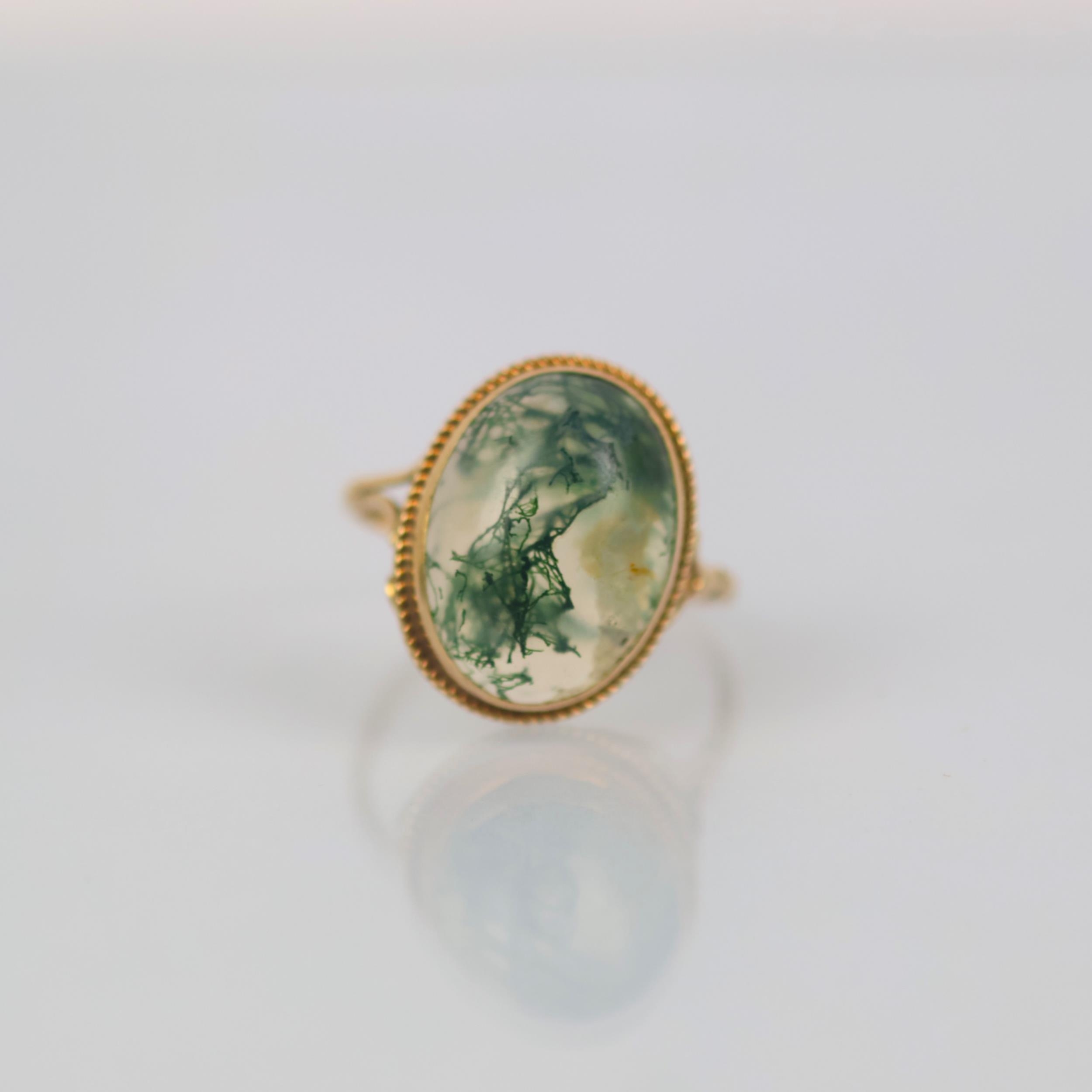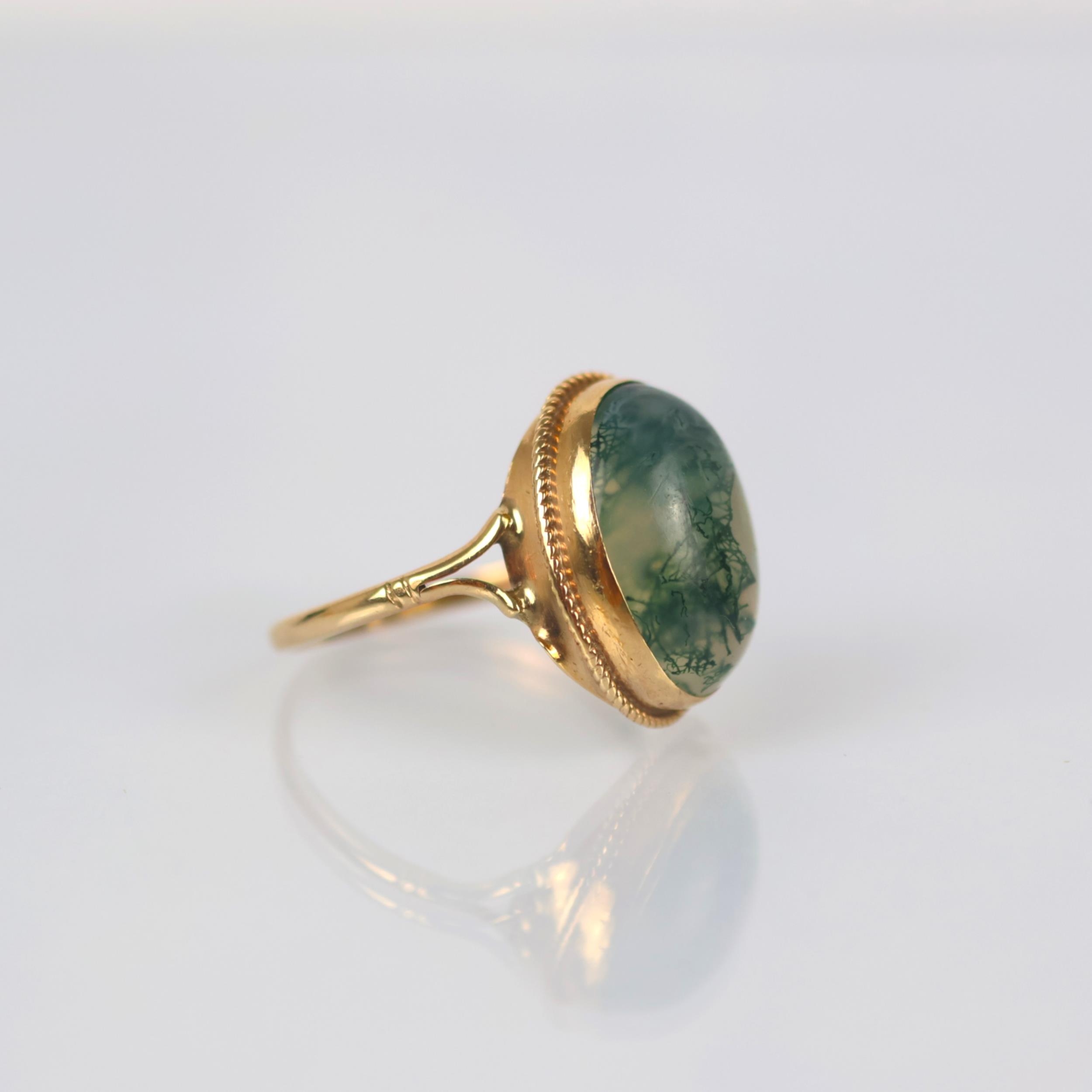 A late 20th century 9ct gold moss agate ring, the oval cabochon moss agate set in rub over mount with rope twist detail, leading to split shoulders and plain polished shank, hallmarked to interior, ring size Q, 3gms