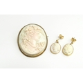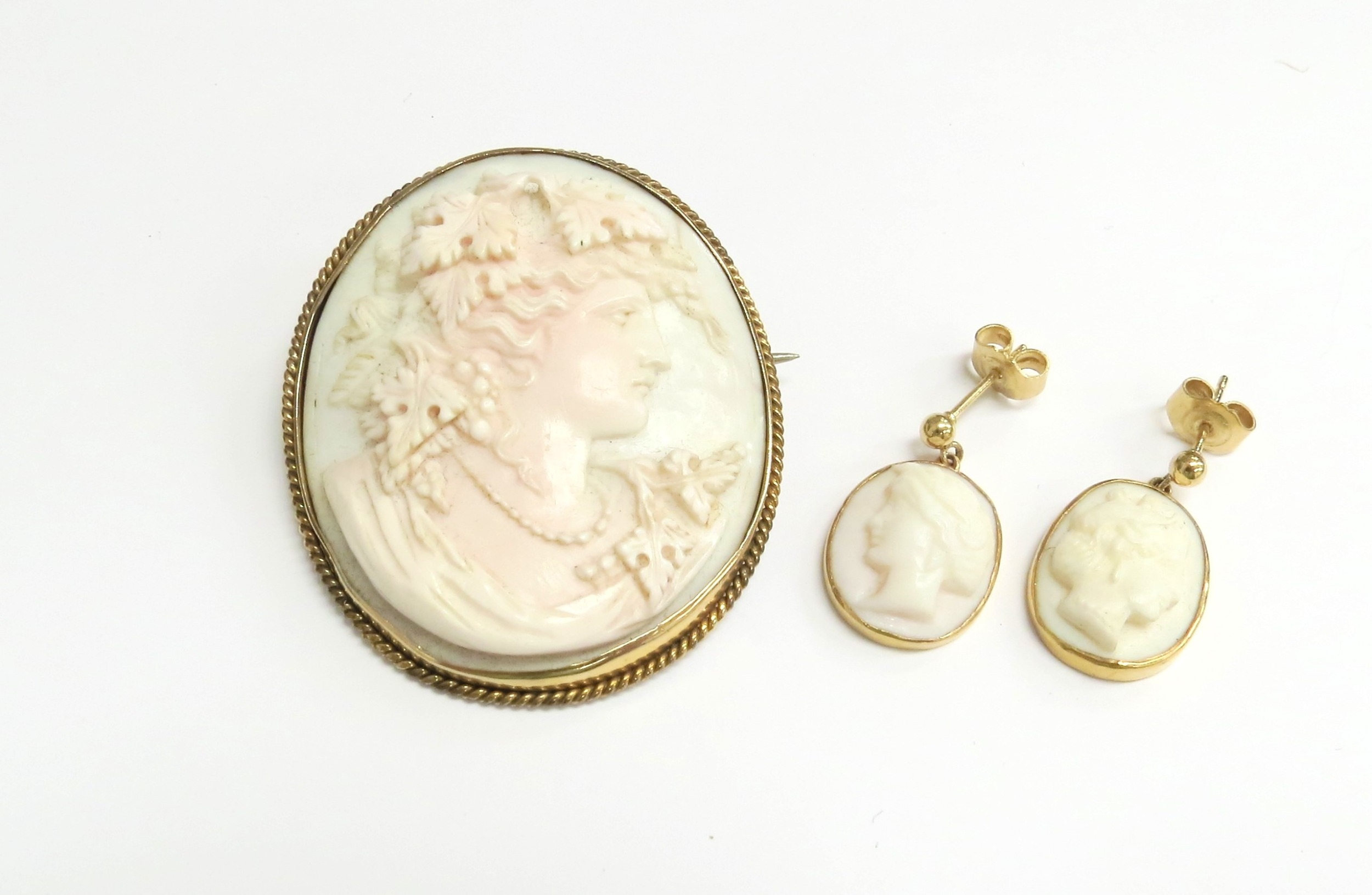 A carved cameo brooch depicting a head of a female with grape and vines to her hair, with a similar pair of drop earrings, all unmarked