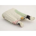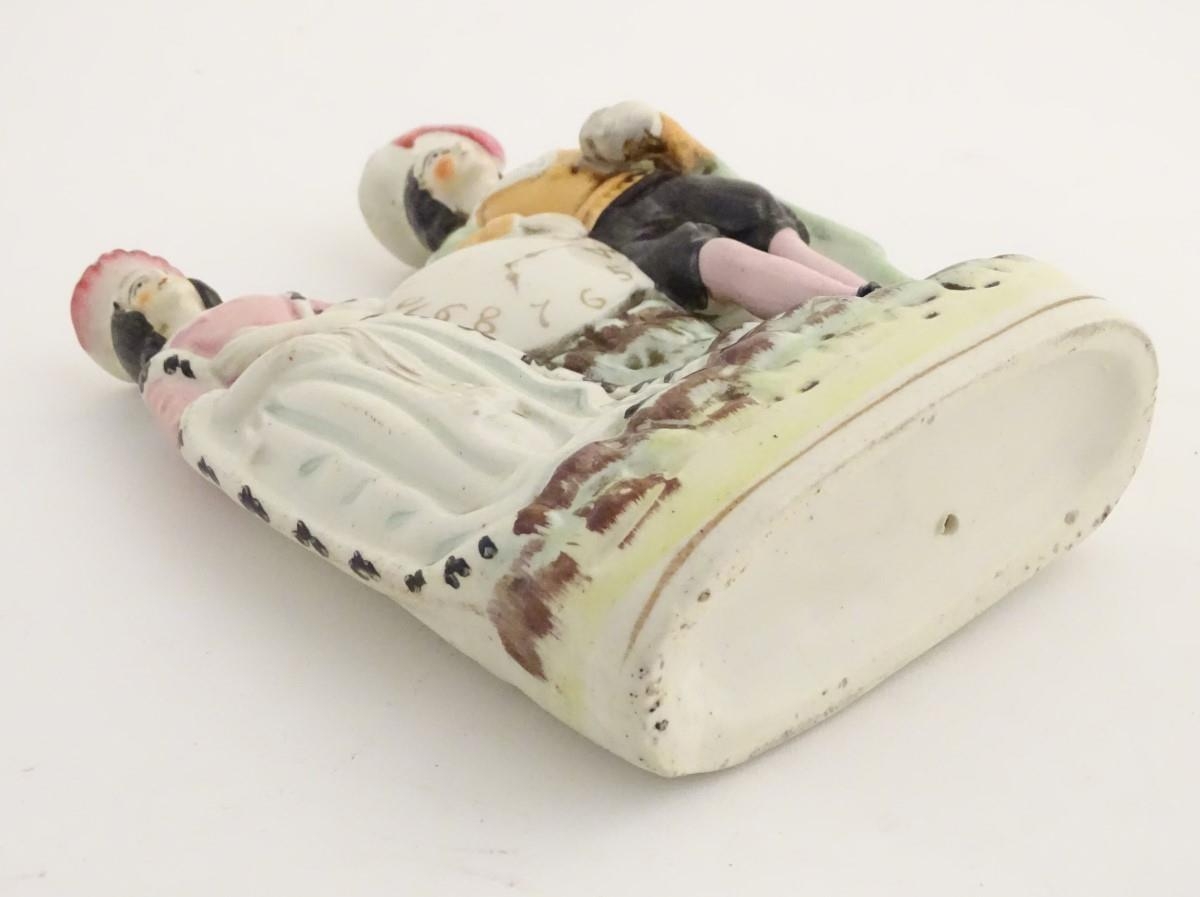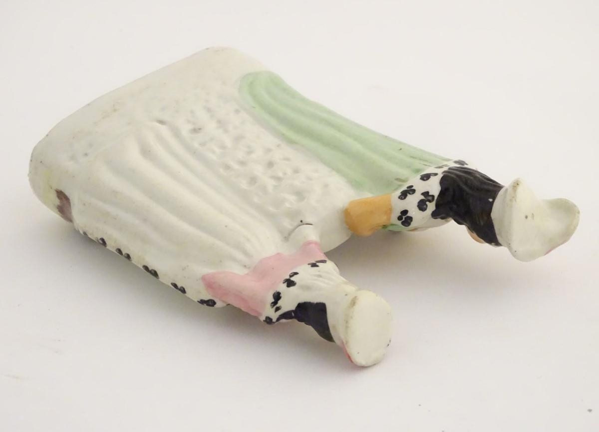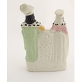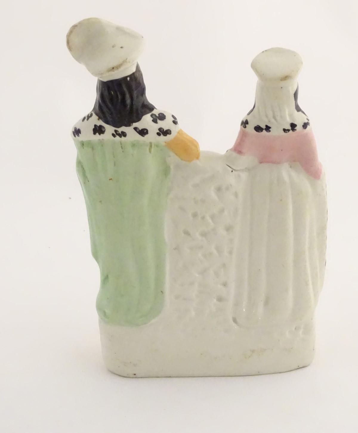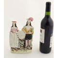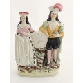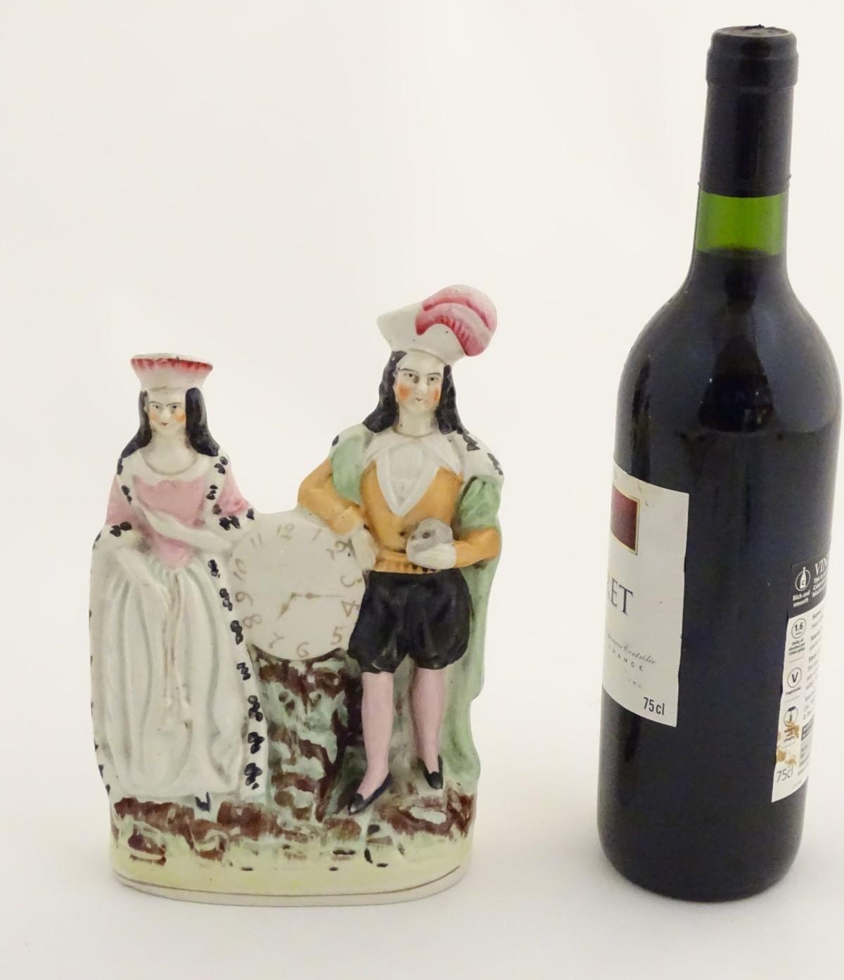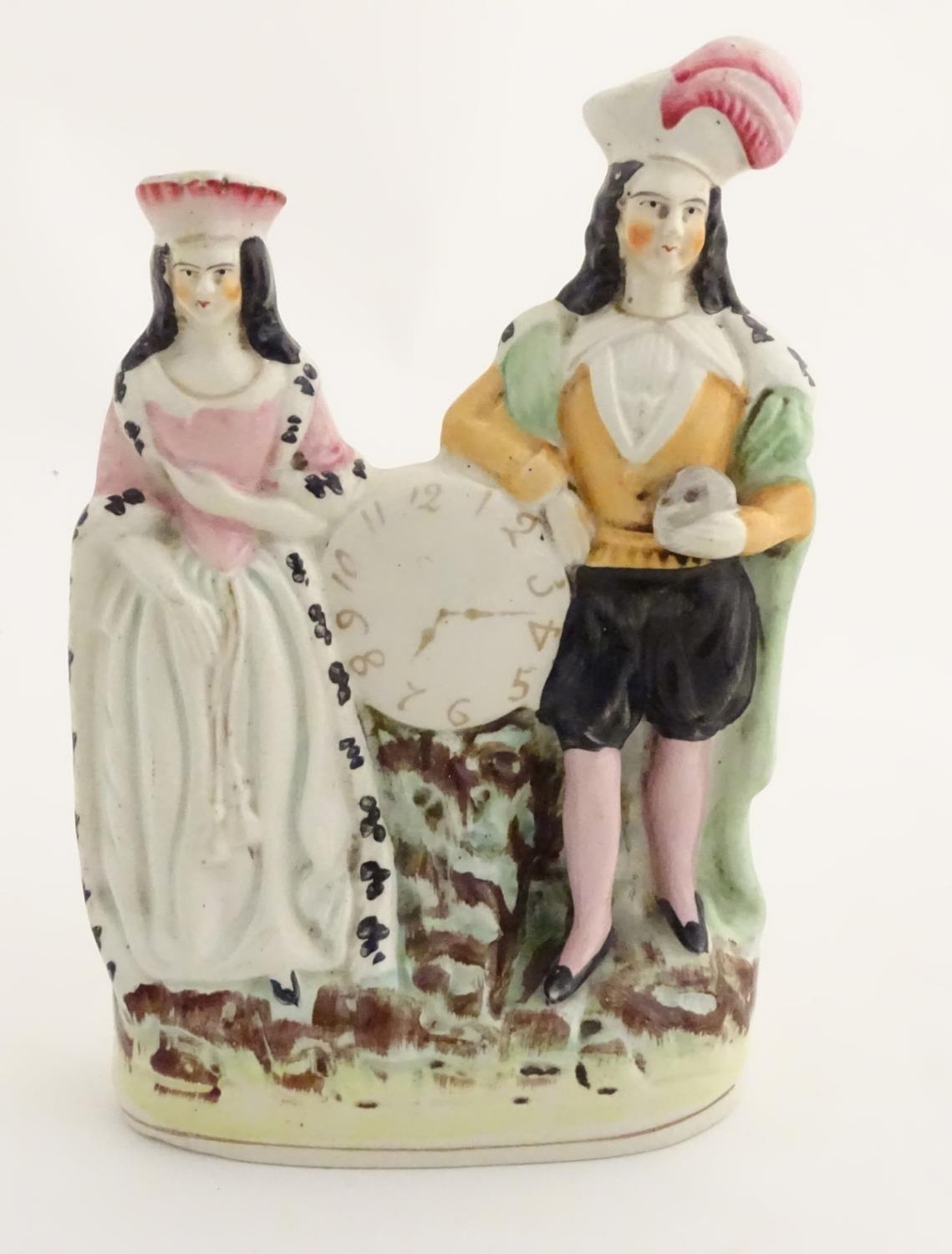 A Victorian Staffordshire figural group depicting the Shakespeare characters Lady Macbeth and Hamlet standing either side of a clock face. Lady Macbeth is wearing a crown, Hamlet is wearing a plumed hat and holds a skull in his left hand. Approx. 8 1/4'' high.