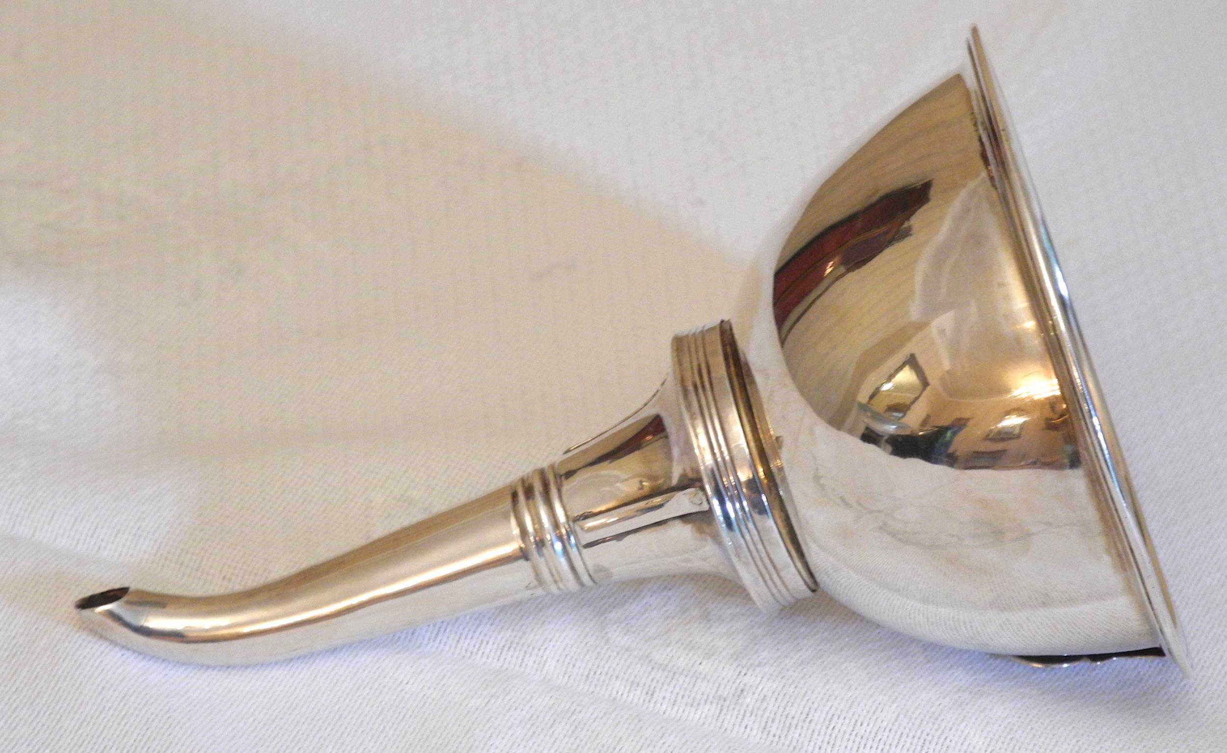 A George III silver wine funnel, curved spout, 13.5cm long, London 1820, 80.5g 2.59ozt