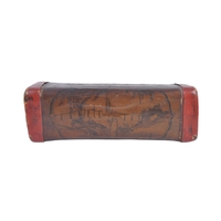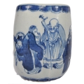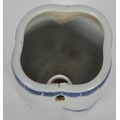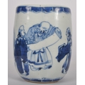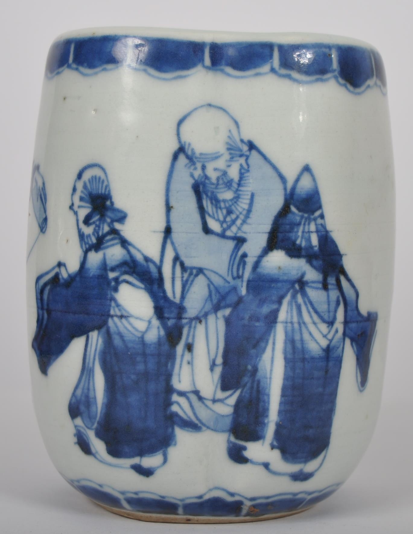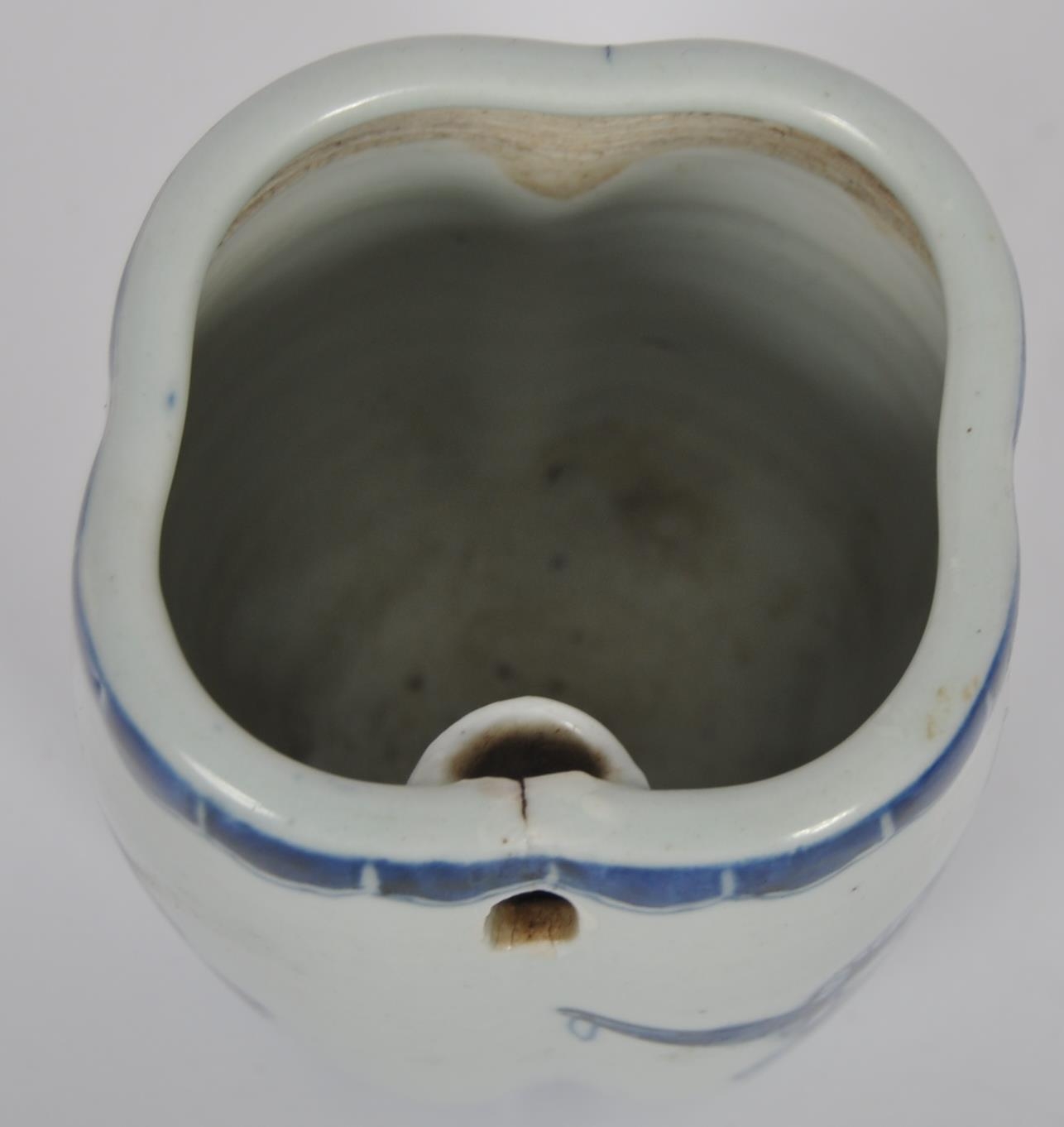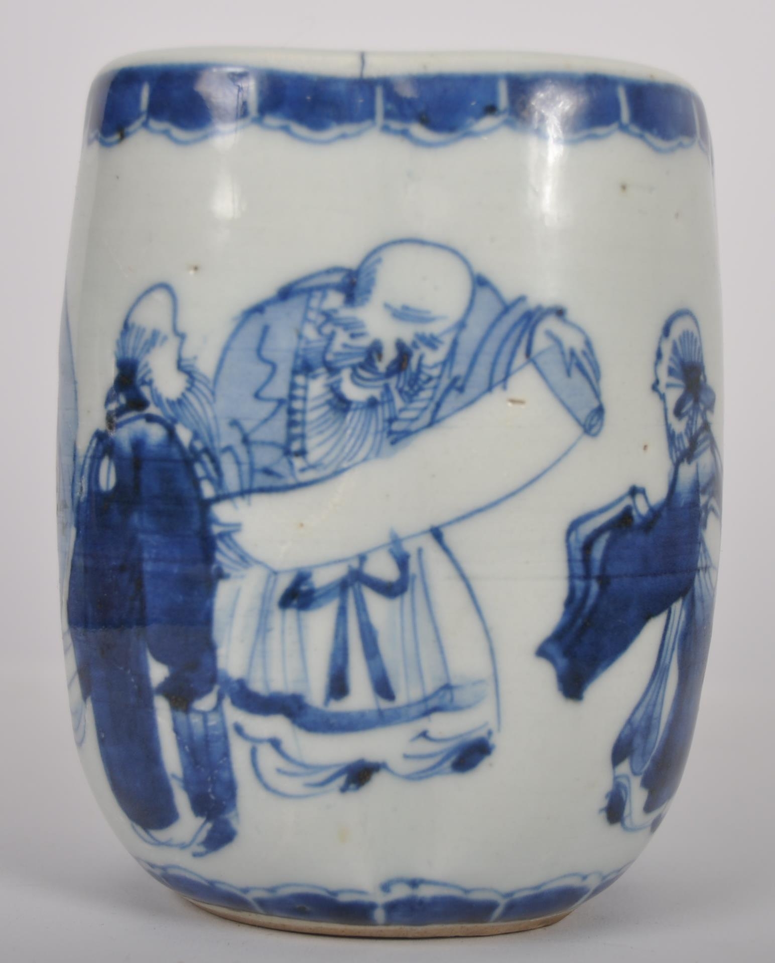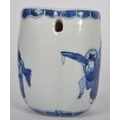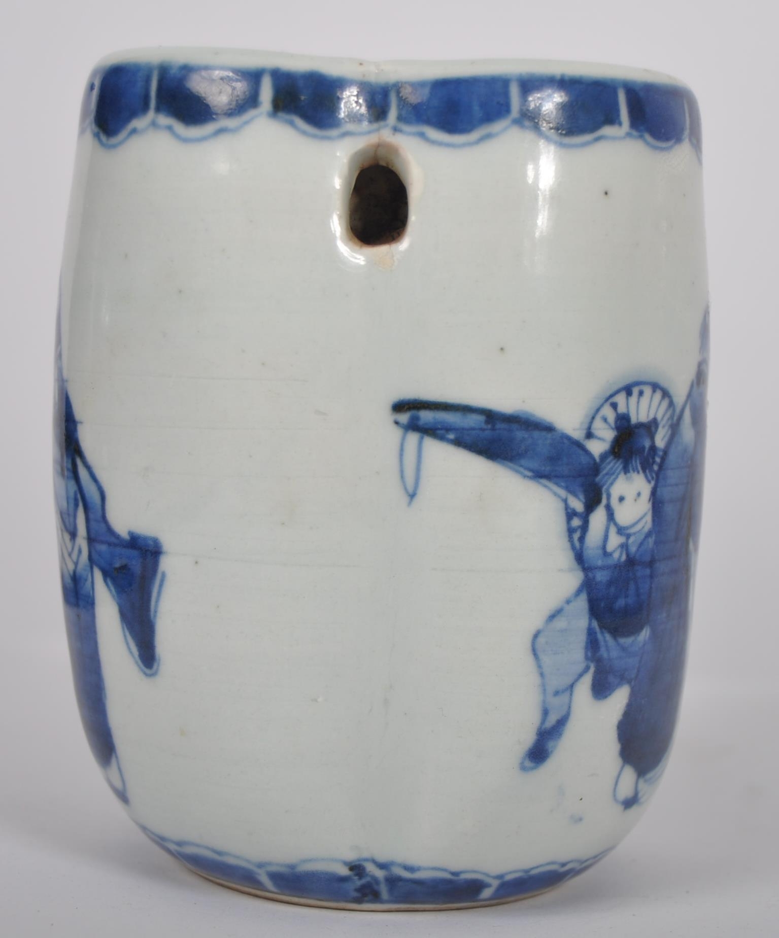 A 19th Century Chinese blue and white porcelain vase / vessel of unusual form. Pierced hole to side with hand painted decoration depicting figures / elders reading scroll. Measures approx; 11cm tall.