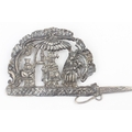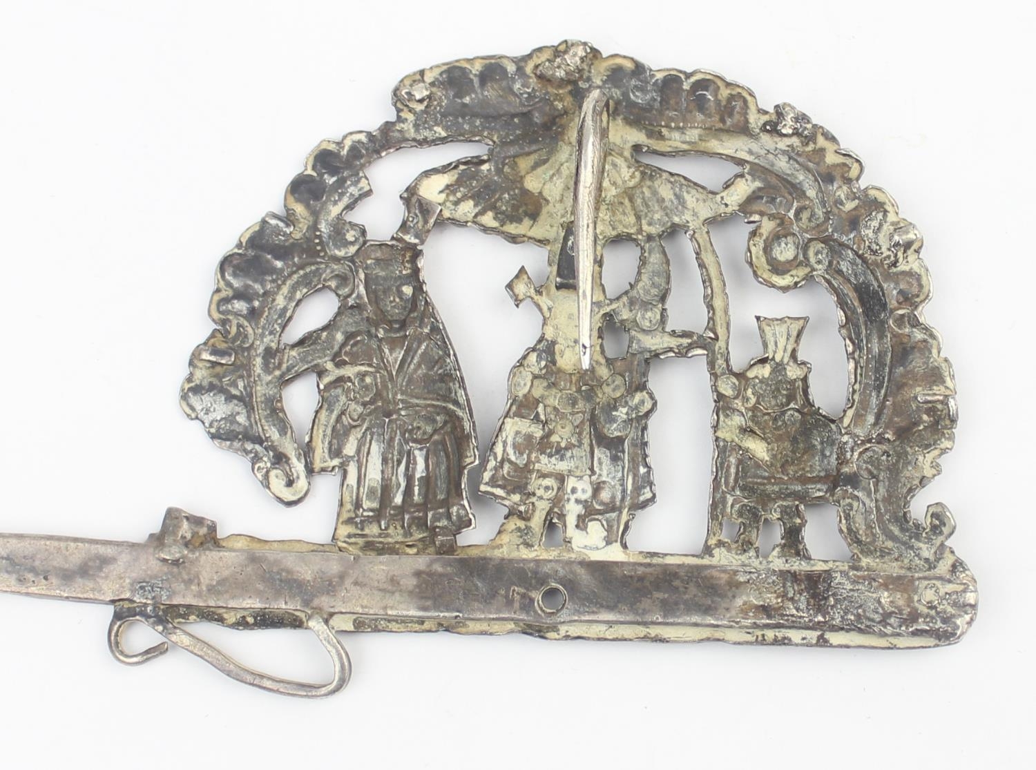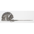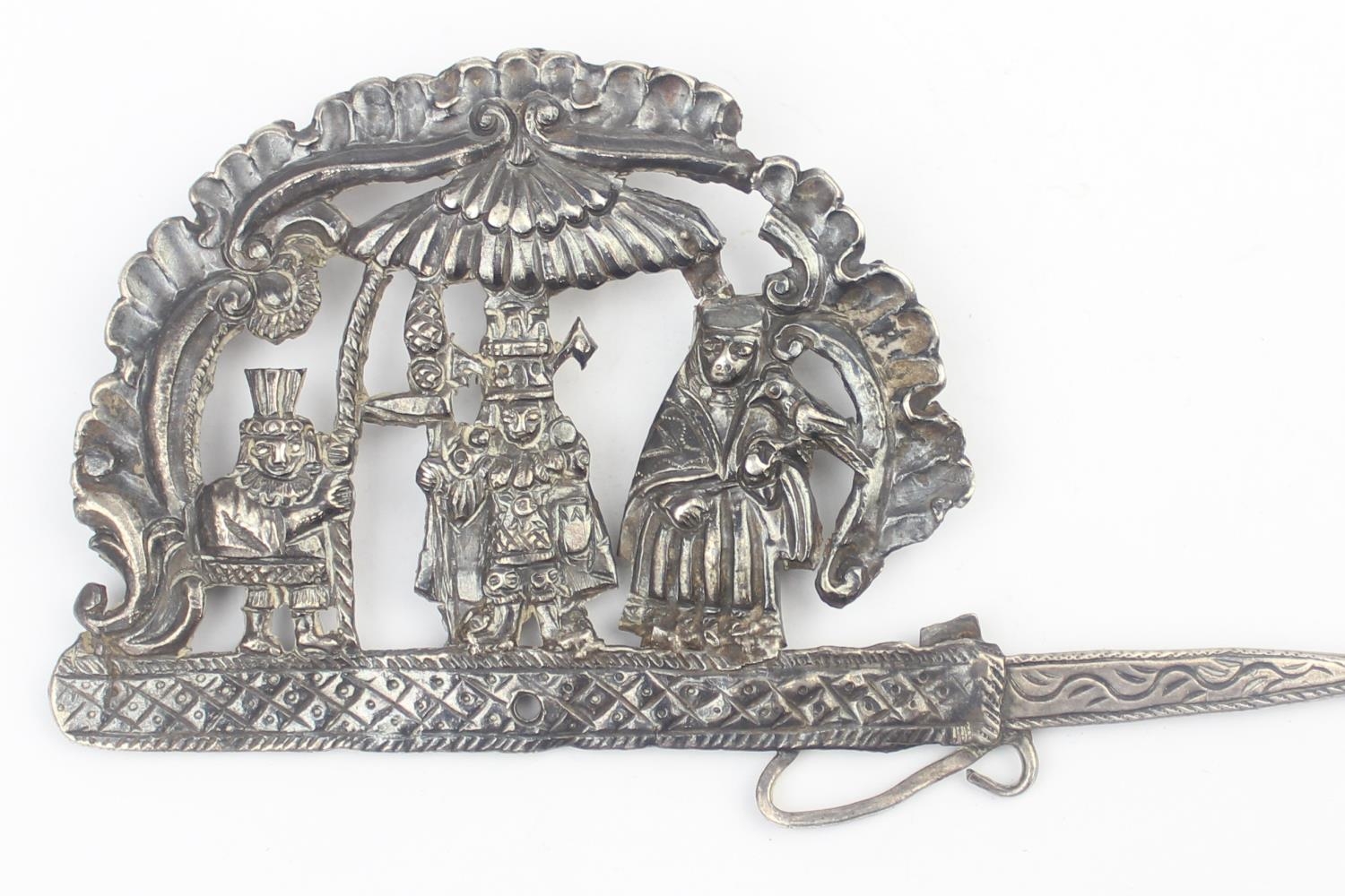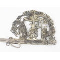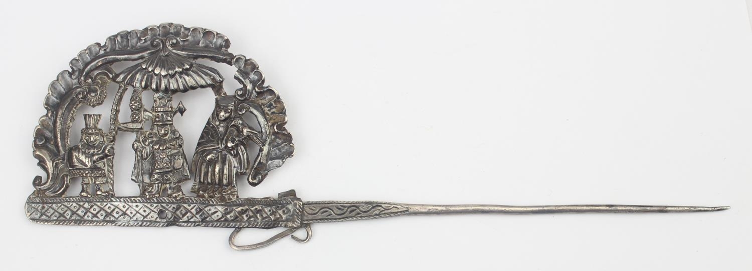 A South American silver Tupu Pin depicting Incan motifs, likely 19th century, seemingly unmarked but XRF tests as approx 95% silver, this pin was used to fasten clothing across the shoulder and was a prominent sign of wealth for women, approx 24cm long, approx 69.85g gross