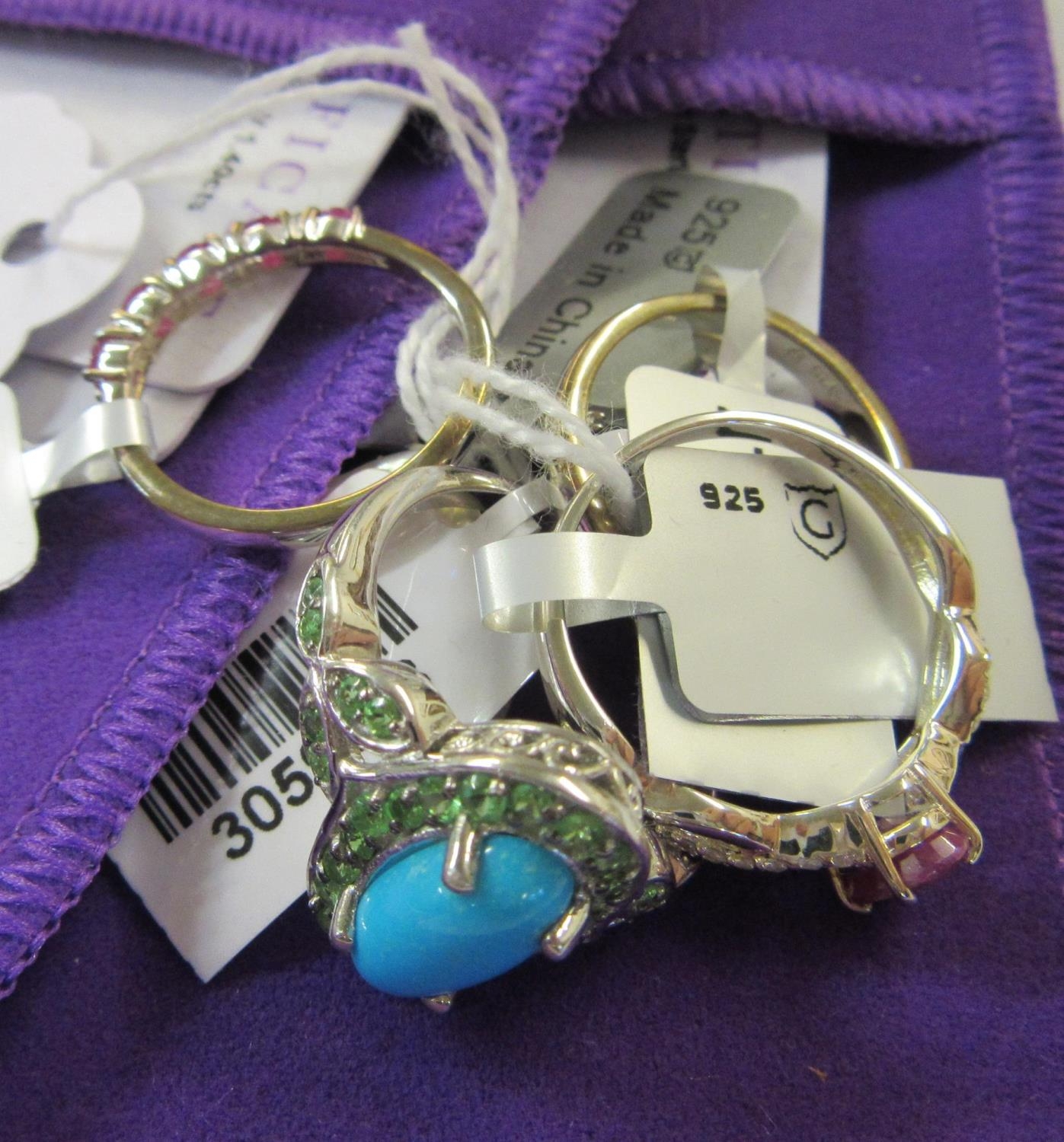 FOUR GEM SET SILVER RINGS AND TWO PENDANTS