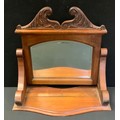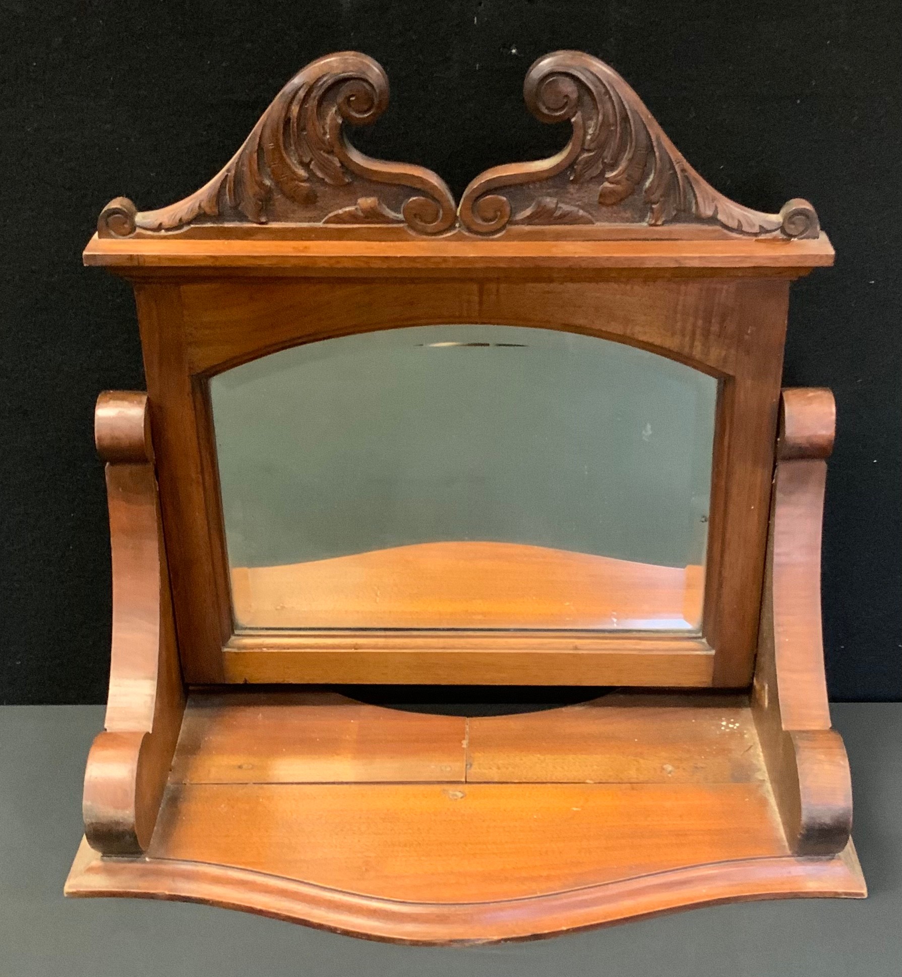A Victorian dressing table mirror, carved crest and supports, serpentine front, arched bevelled plate, size