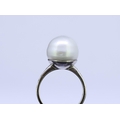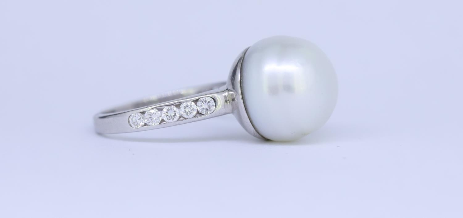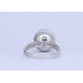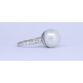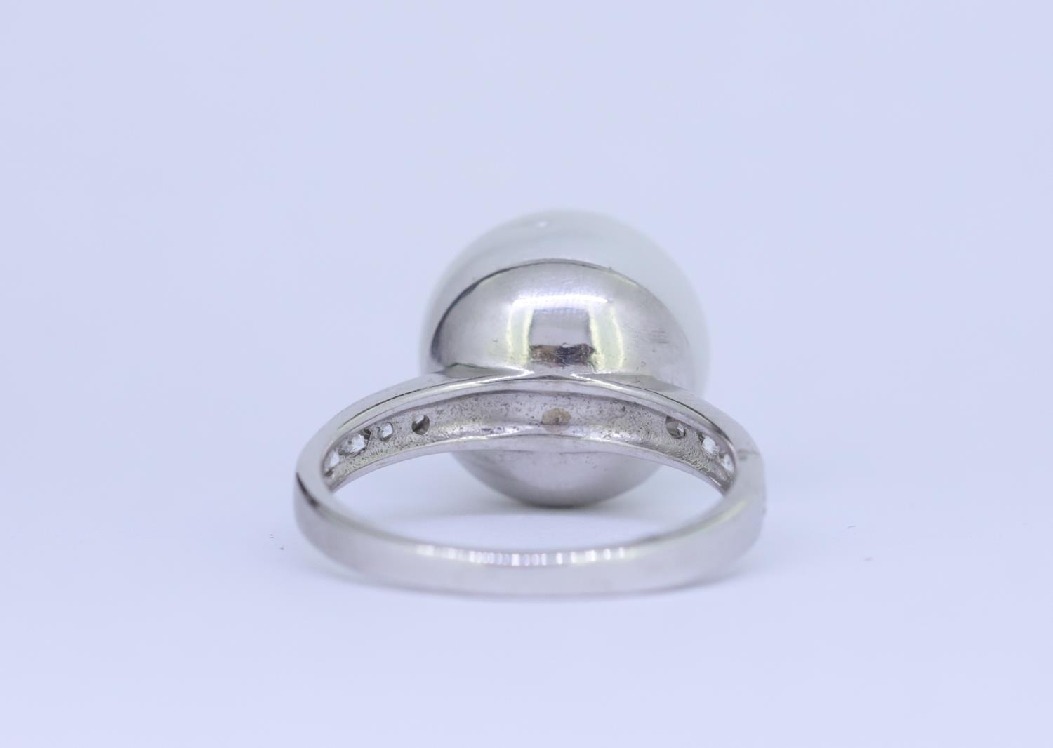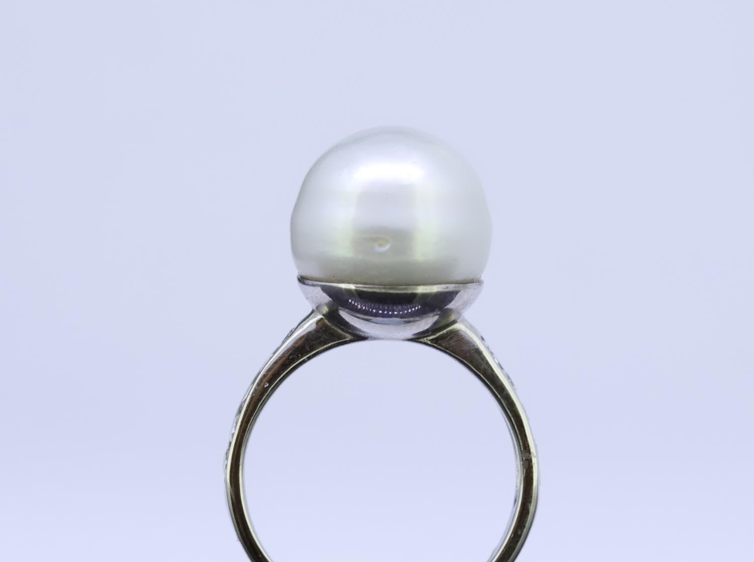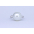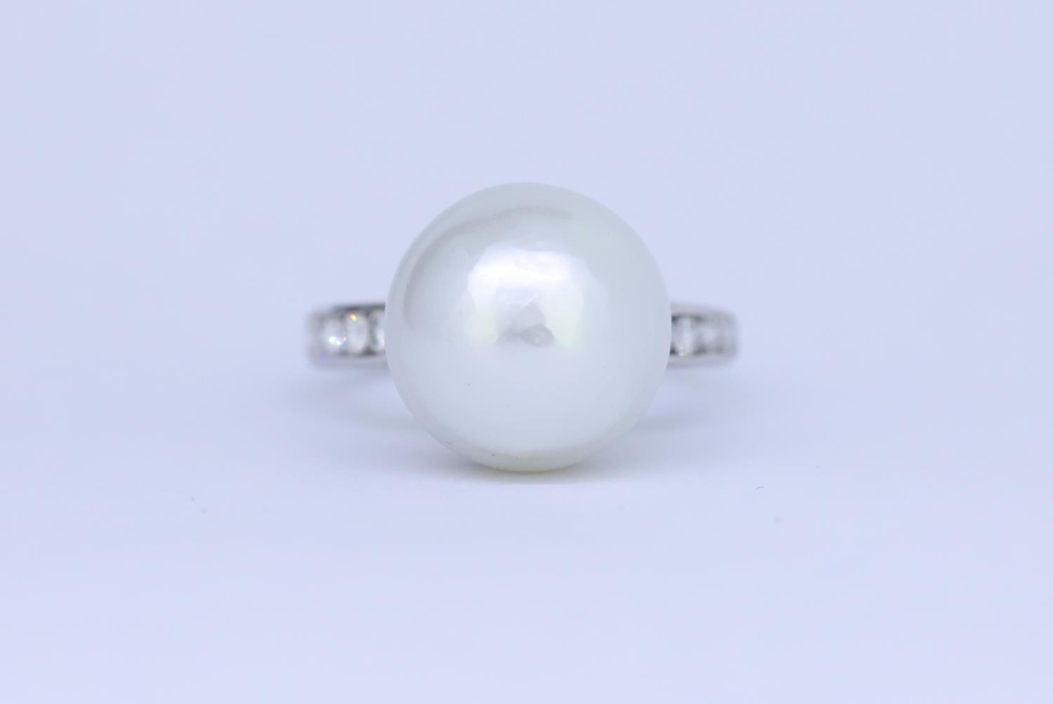 PEARL AND DIAMOND RING, Set with a central pearl of approx. 13.7 mm. Flanked with diamonds to the shoulders. Size Q. 7.6 grams.